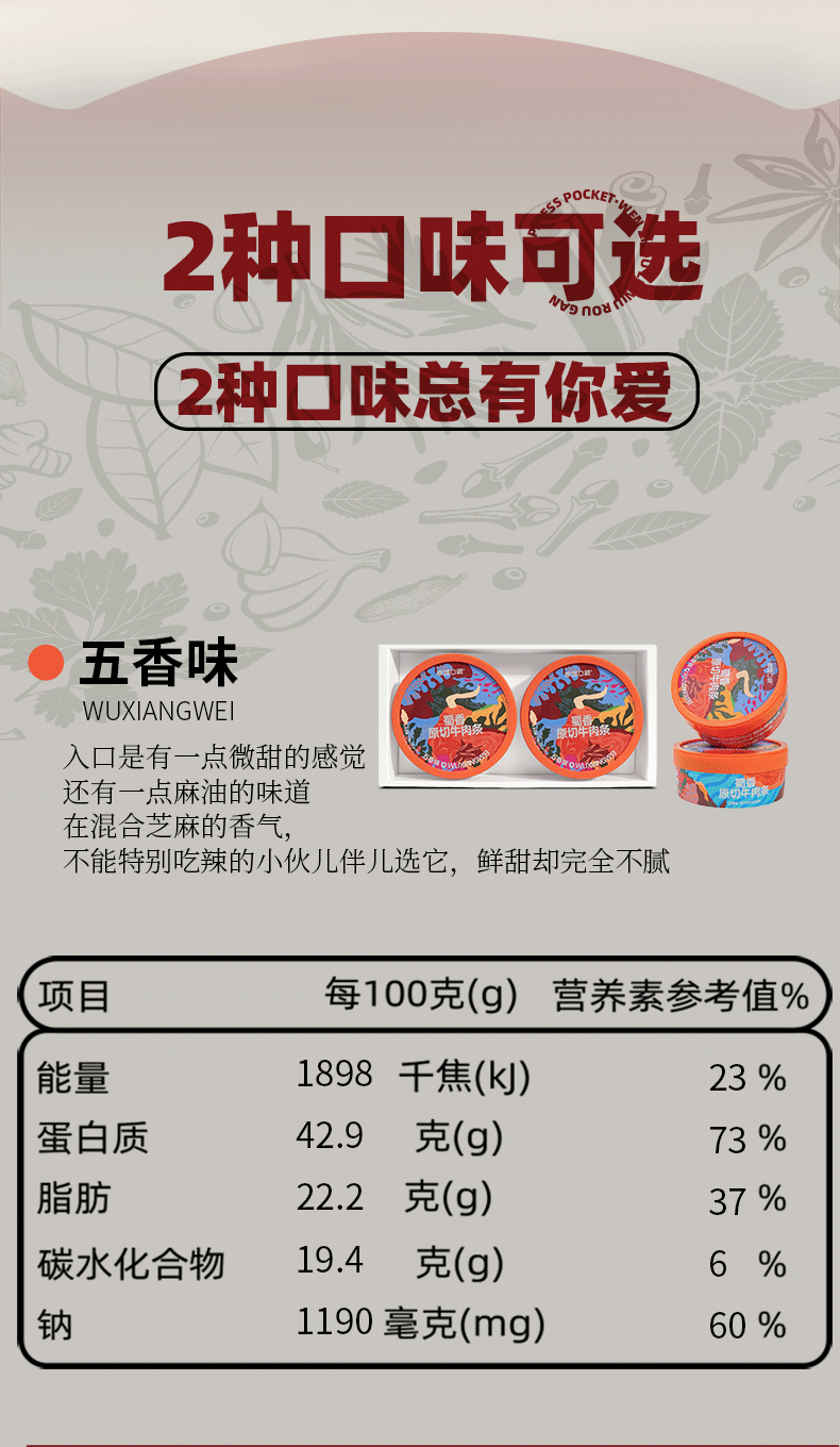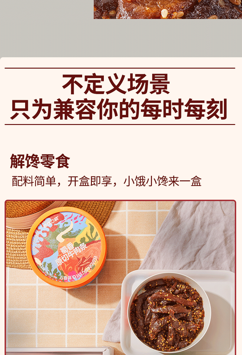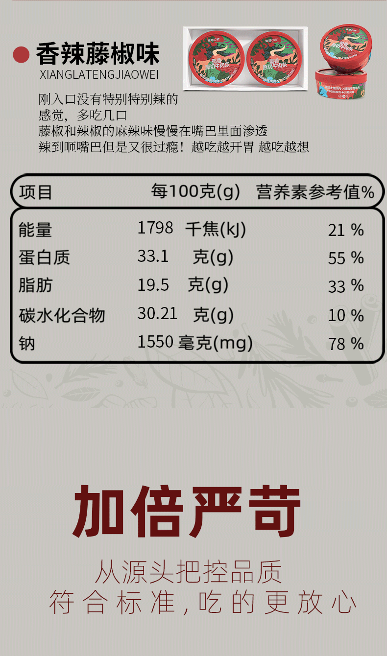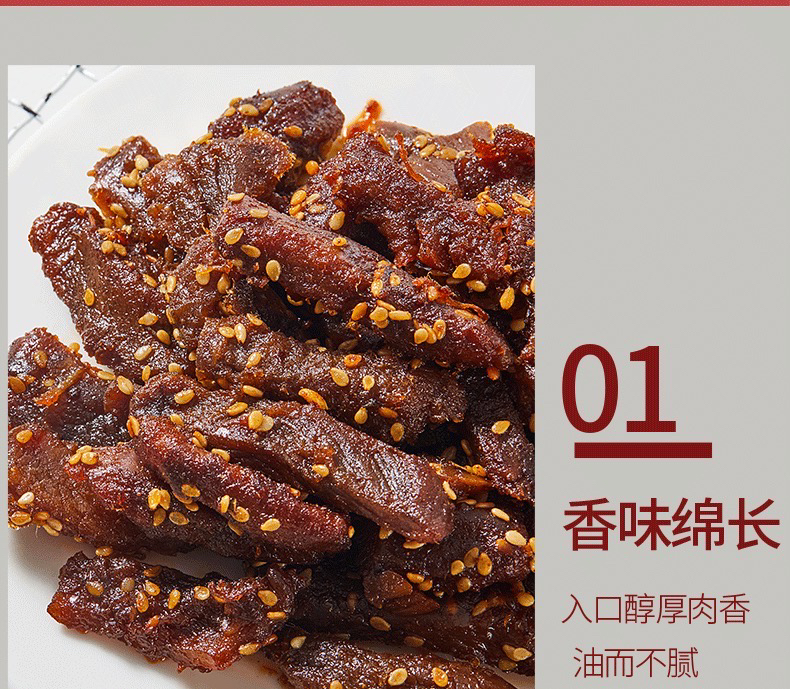 4、用料扎实,好口感,区别于其他同类型牛肉条a:咱家牛肉条饱满少碎肉!口下去肉感扎实有度!软硬适中; b:肉多辅料少,口都是实实在在的牛肉口感拒绝辅料大面积充量!每;c:红油用量适中,拒绝喝油!成品牛肉条油润不腻!鲜香入味!有五香味,香辣藤椒味2个口味可选!五香味: 入口是有一点微甜的感觉,还有一点麻油的味道在混合芝麻的香气,不能特别吃辣的小伙儿伴儿选它,鲜甜却完全不腻;香辣藤椒味:刚入口没有特别特别辣的感觉,多吃几口,藤椒和辣椒的麻辣味慢慢在嘴巴里面渗透,辣到咂嘴巴但是又很过瘾!,越吃越开胃,越吃越想