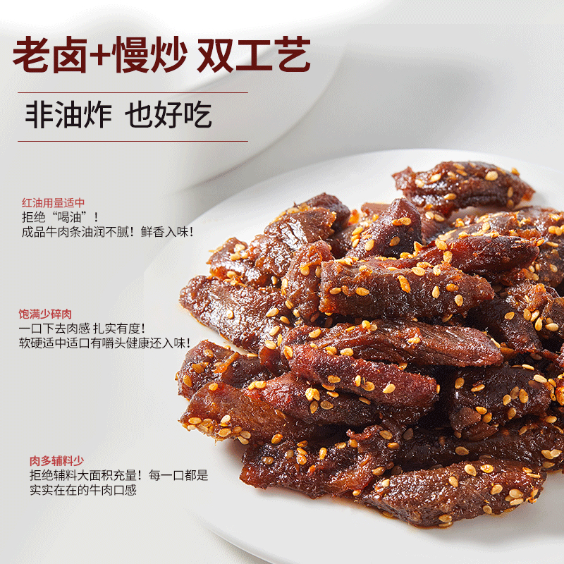 2.好牛肉条非油炸不上火!老汤慢卤使其吸饱卤汁入味后切条,再用天然香料熬制的红油小火慢炒,适口有嚼头健康还入味!