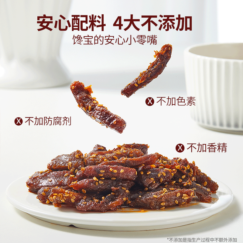 1、原切才是好牛肉]只选草饲牛肉原切,不拼接不合成!不掺鸡肉/鸭肉/不添加面粉/淀粉/大豆蛋白等!大约2、5斤牛肉才能出1斤成品牛肉条!真正原切 根根分明!牛肉纤维看得见,富含蛋白质!