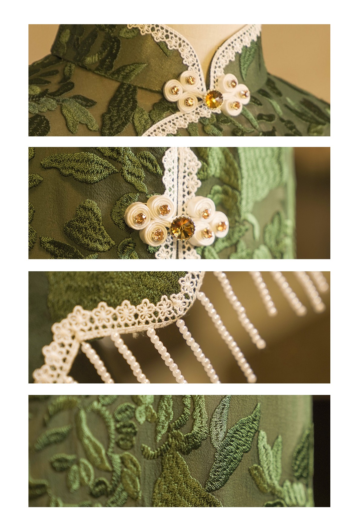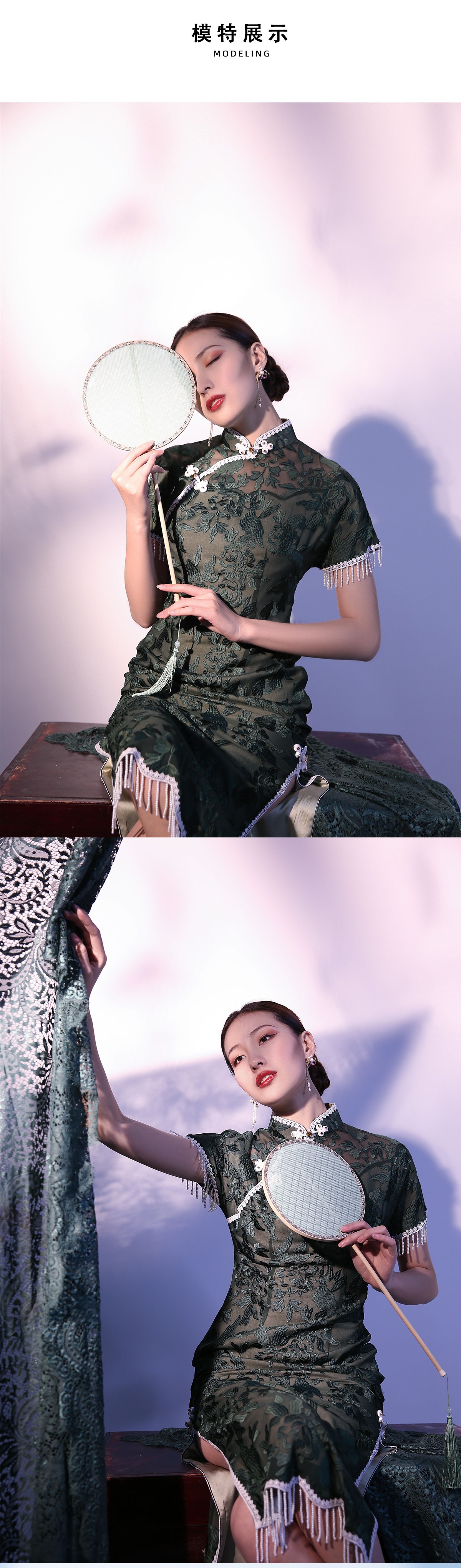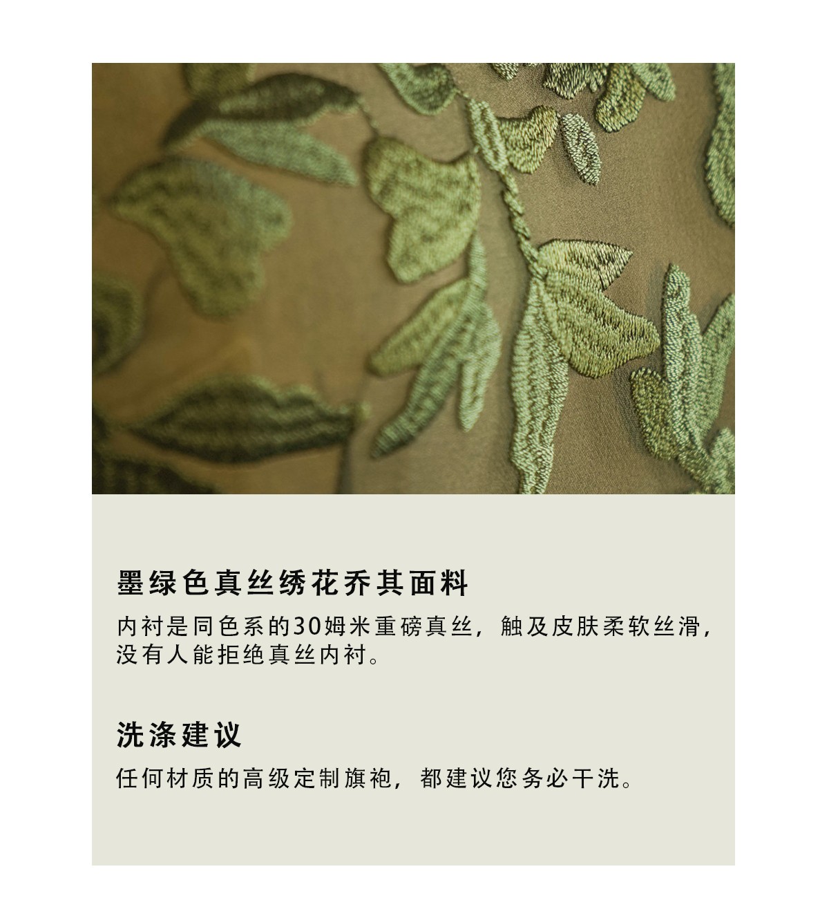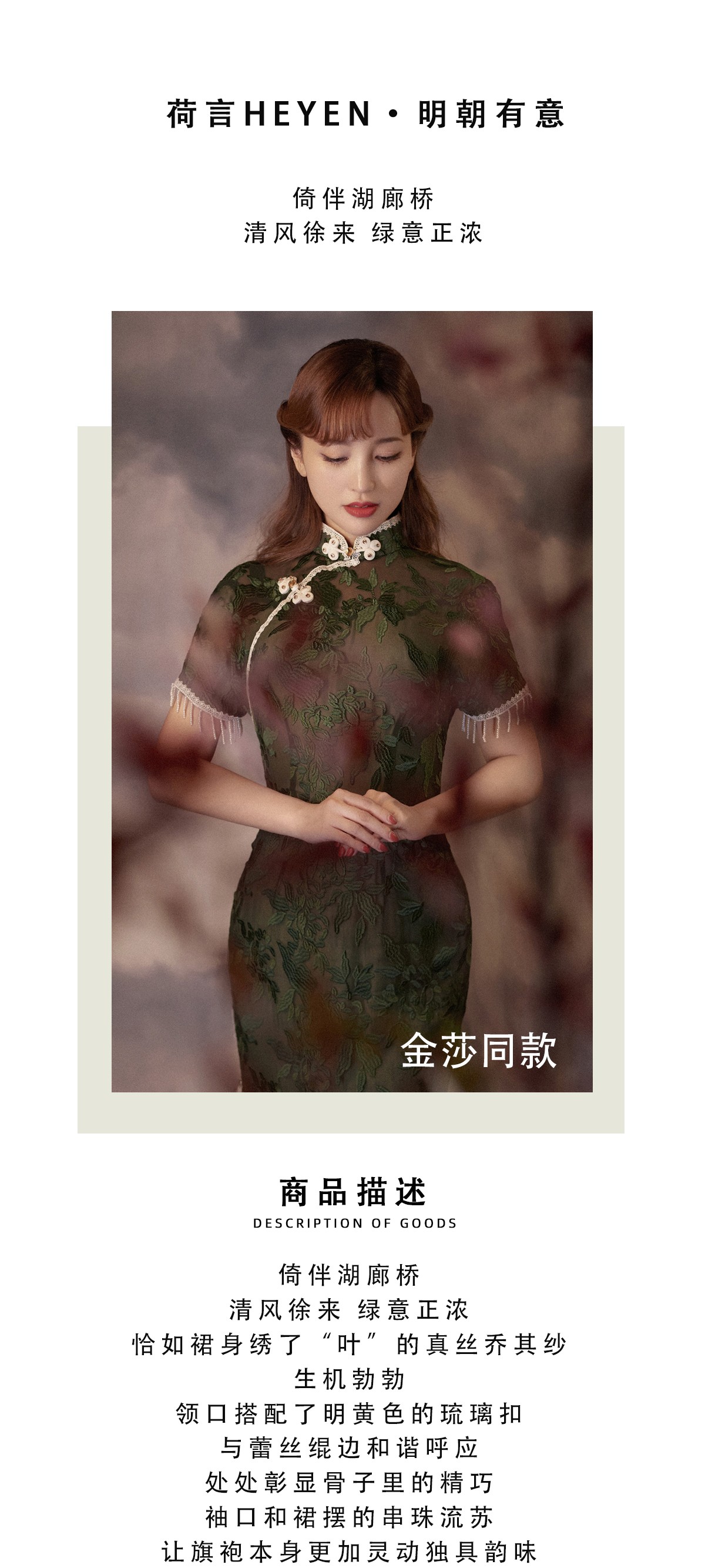 荷言HEYEN 明朝有意【明星同款金莎】 墨绿色绣花乔其面料+定珠钉珠流苏手工旗袍