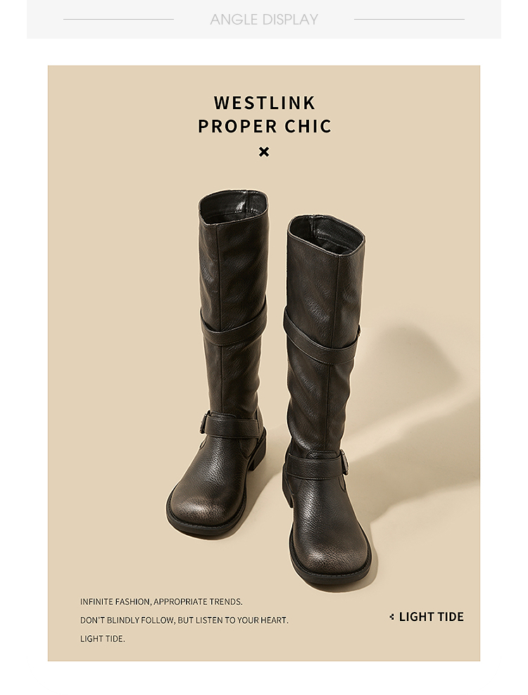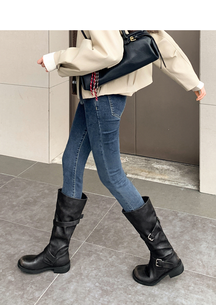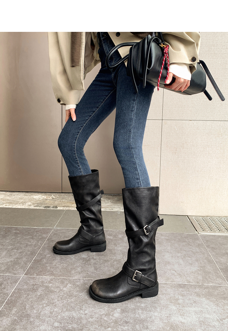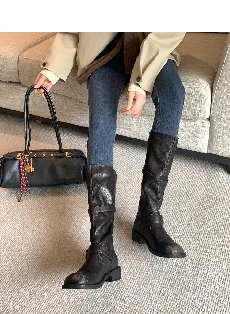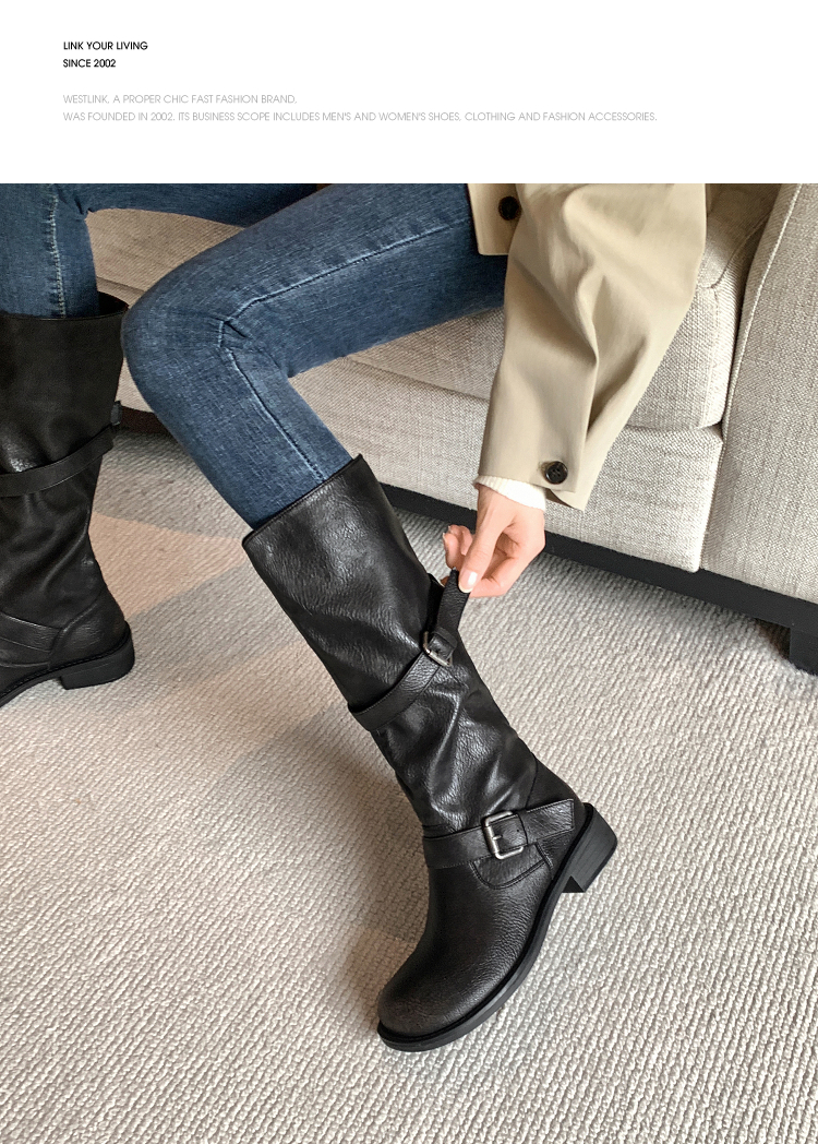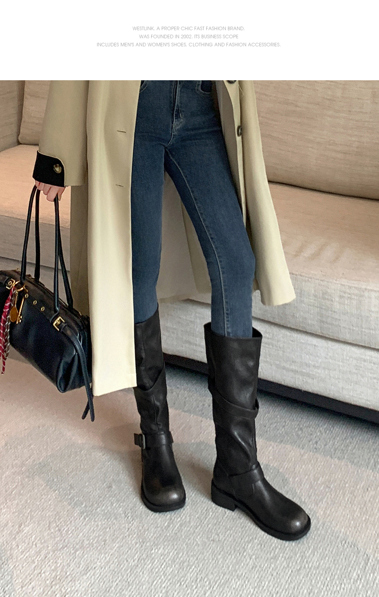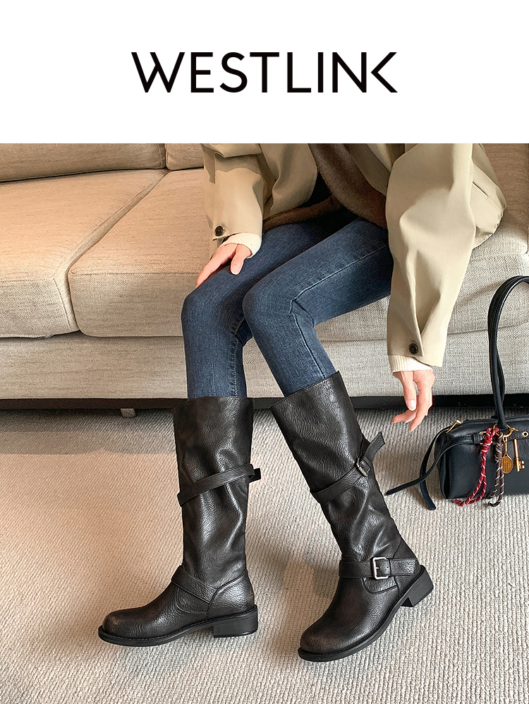 西遇不过膝长筒靴女新款秋冬复古英伦风骑士靴圆头粗跟长靴子V2257245