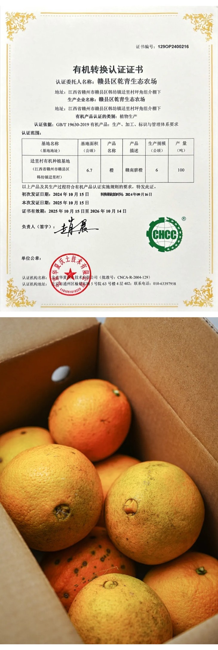通过对声胜家脐橙种植基地的考察和走访,并现场采摘果子送检检测农残,还对接了有机认证的老师到现场检查,现已获得有机转换认证证书,295项农残无检出。(检测报告和有机转换认证书见详情末尾)