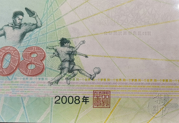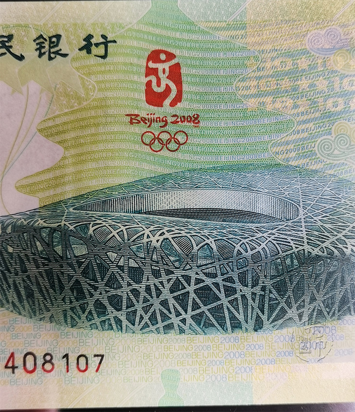 【正面图案】主景为北京2008奥林匹克运动会主会场——国家体育场“鸟巢”,其上方为第29届奥林匹克运动会会徽,背景为天坛图案。