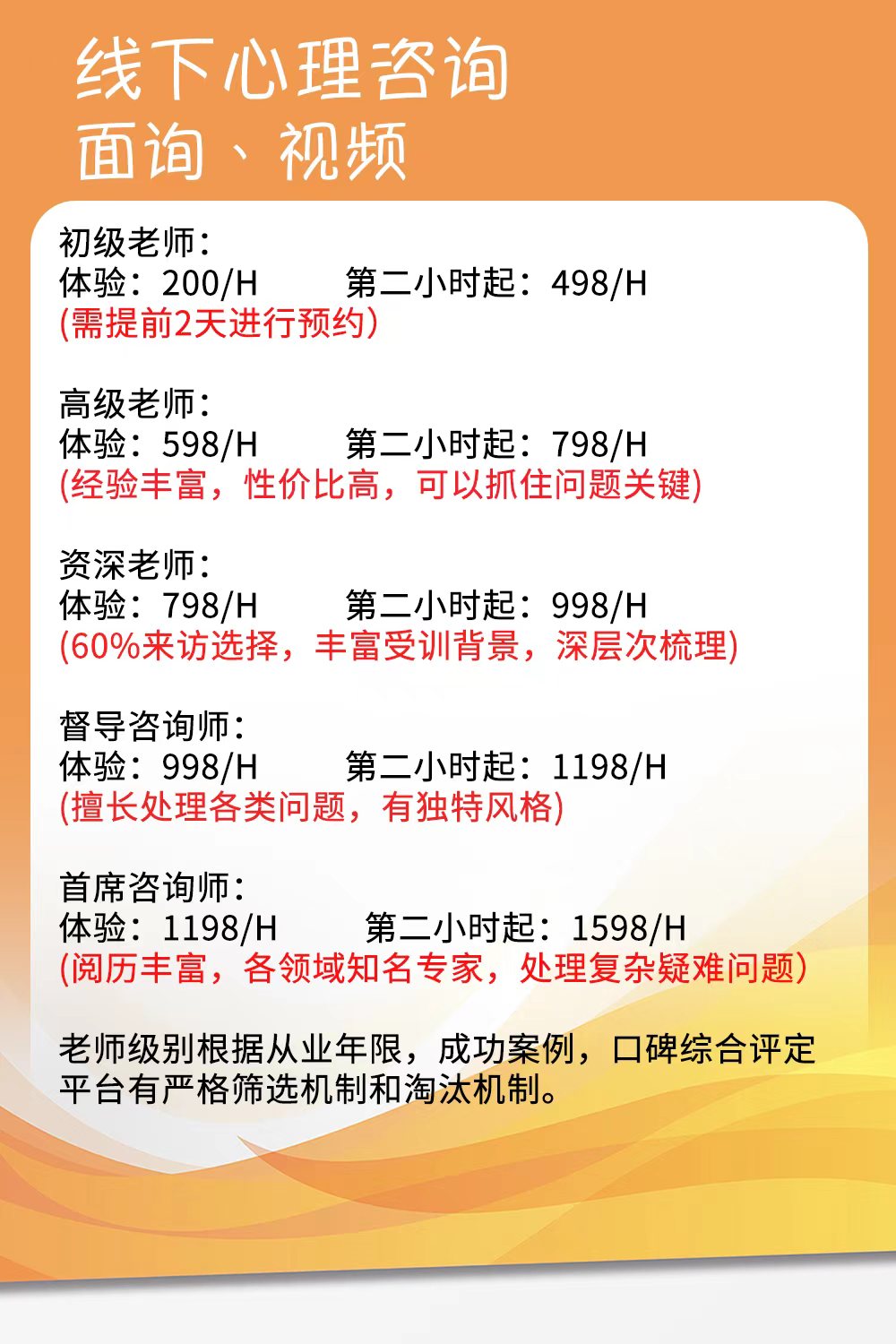 老师级别根据从业年限,成功案例,口碑综合评定平台有严格筛选机制和淘汰机制。
