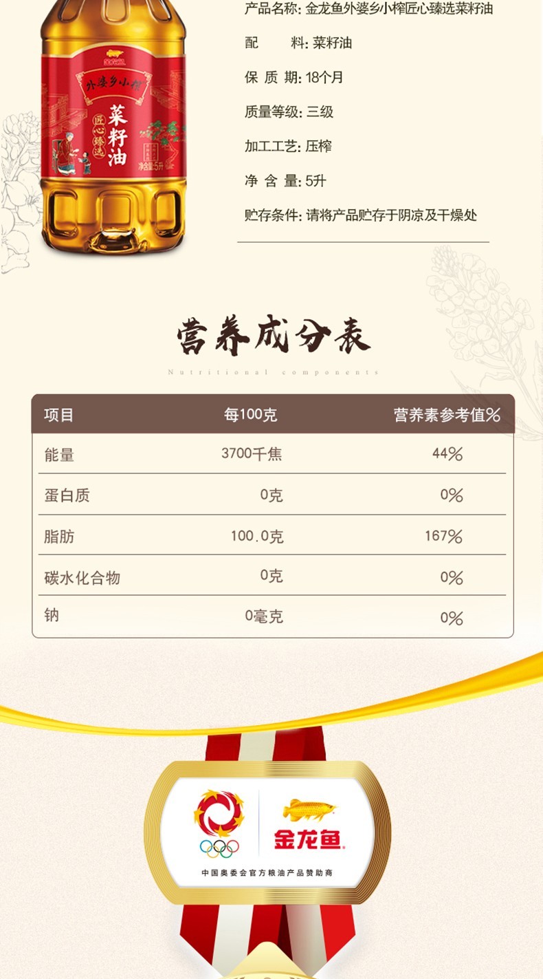 金龙鱼 外婆乡小榨匠心臻选菜籽油 5L