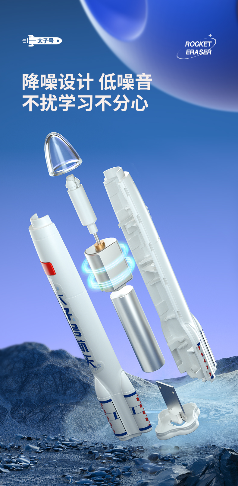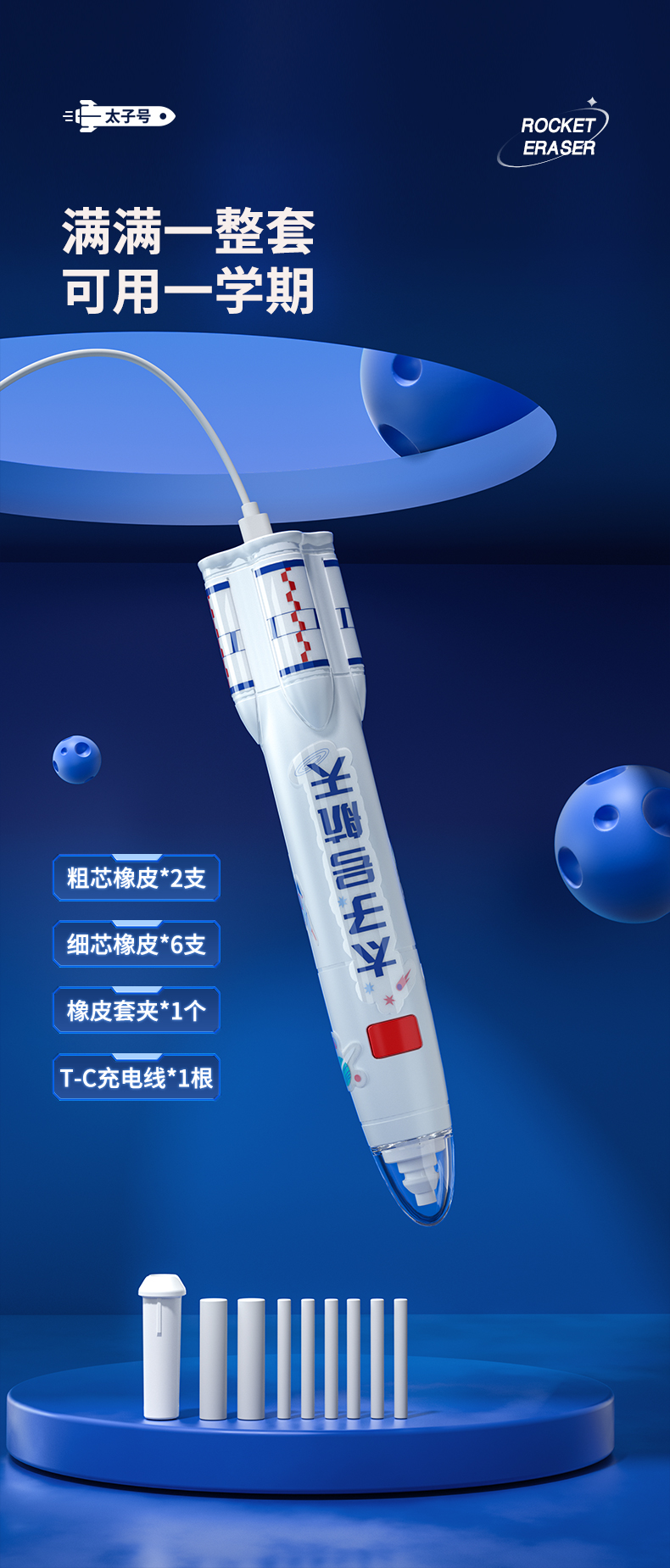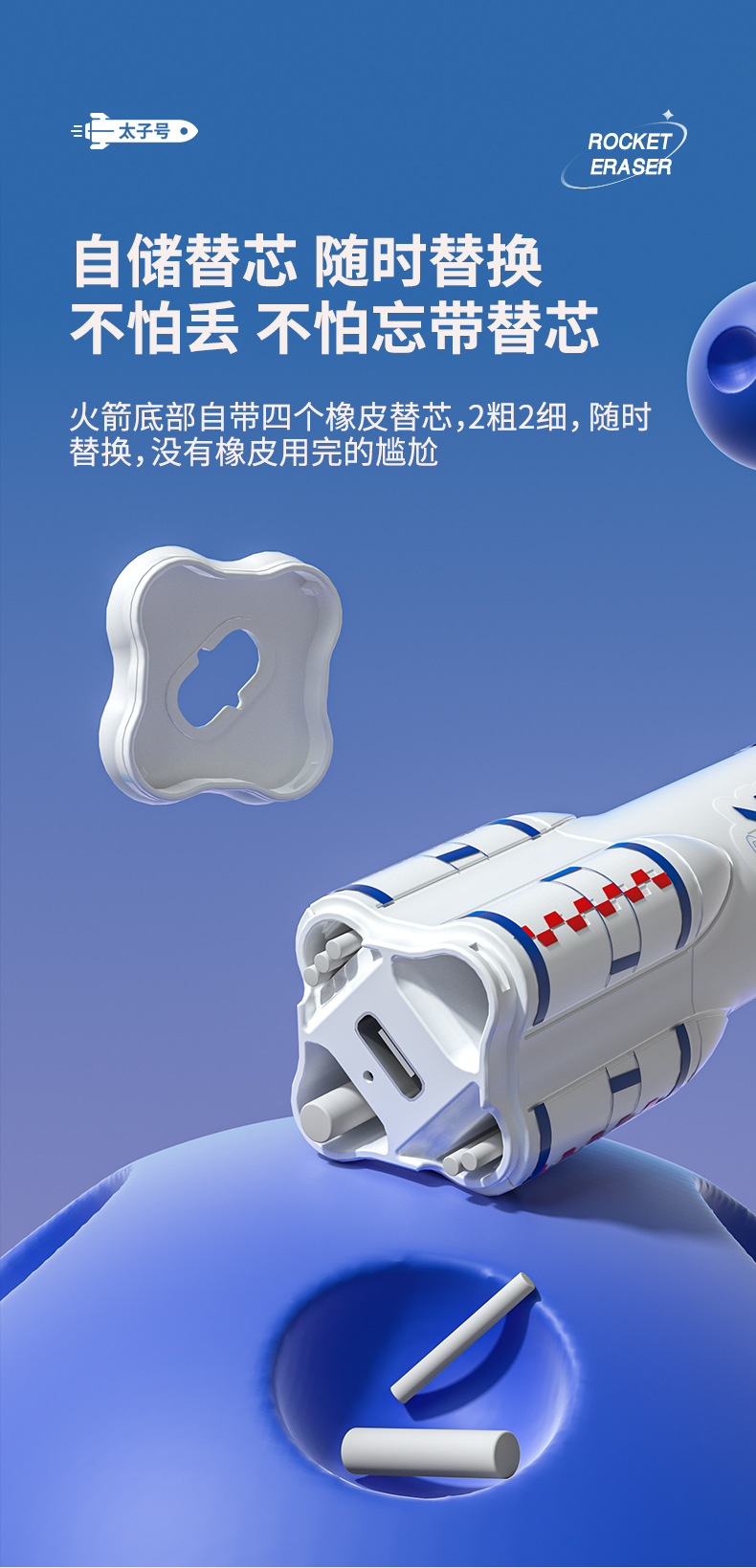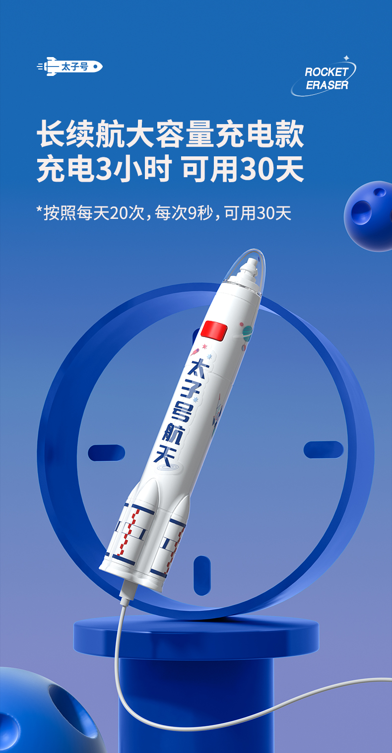 猫太子火箭电动橡皮擦小学生自动橡皮儿童学生专用美术4b像笔擦不留痕铅笔檫神器高光无屑一年级学习文具用品