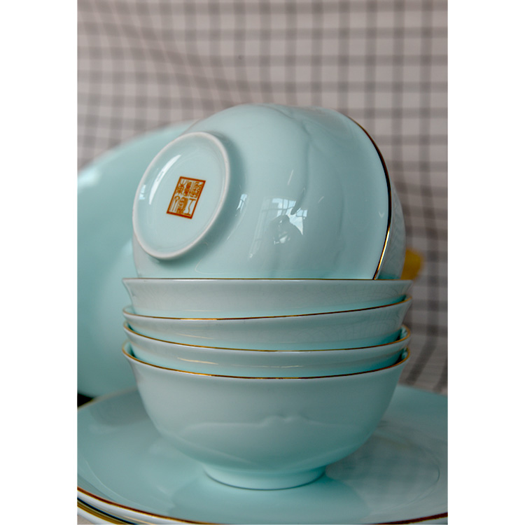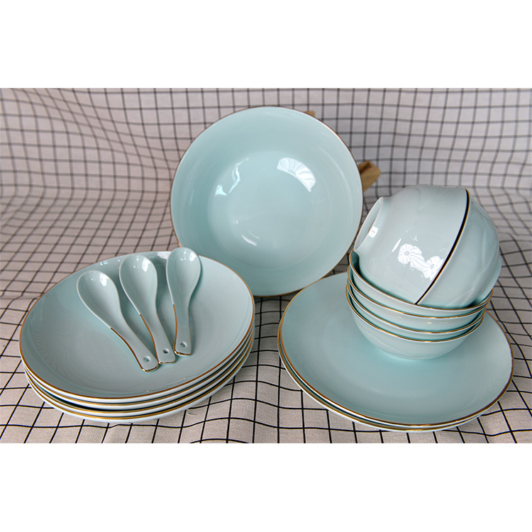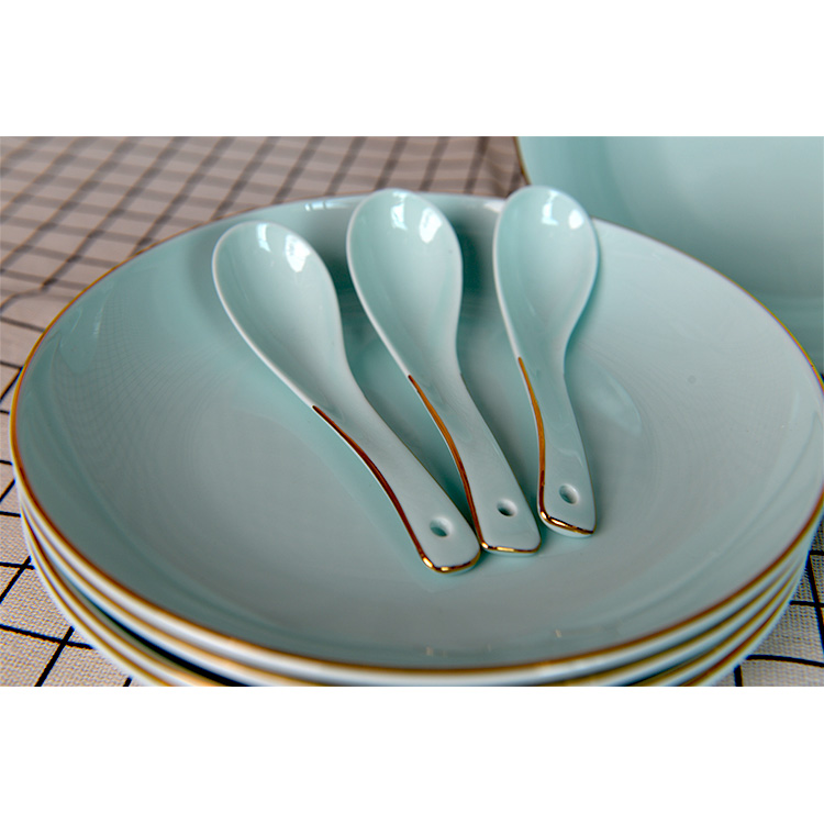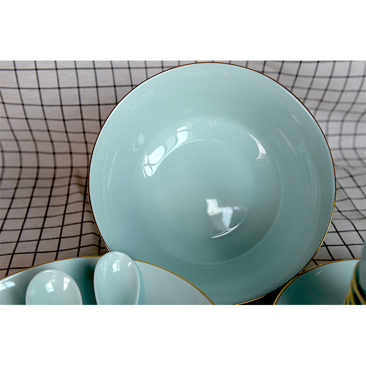 鲁玉陶瓷餐具组合套装家用碗碟盘子金边青色19头