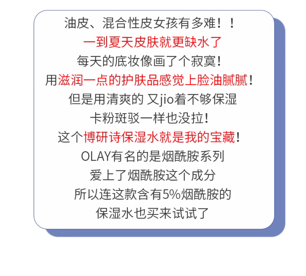 来自宝洁旗下的博研诗,24年专研烟酰胺,科研级配方,定位精准:针对都市危肌人群,整个系列都不添加酒精、香料!配方很温和,充分考虑的敏感肌肤的耐受性!以前柜台都是340元!虽然不敢想,但是这次你真的没听错,这是OLAY,不是什么杂牌野鸡,就问你,这个超级大羊毛你还忍得住不薅吗!!!