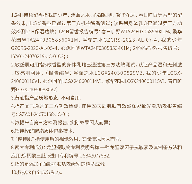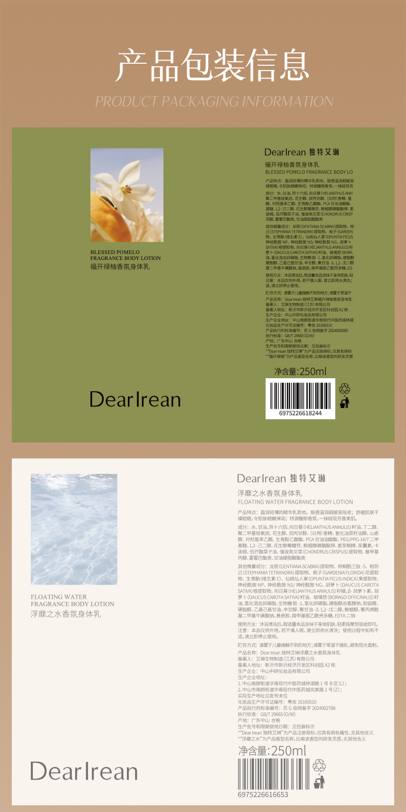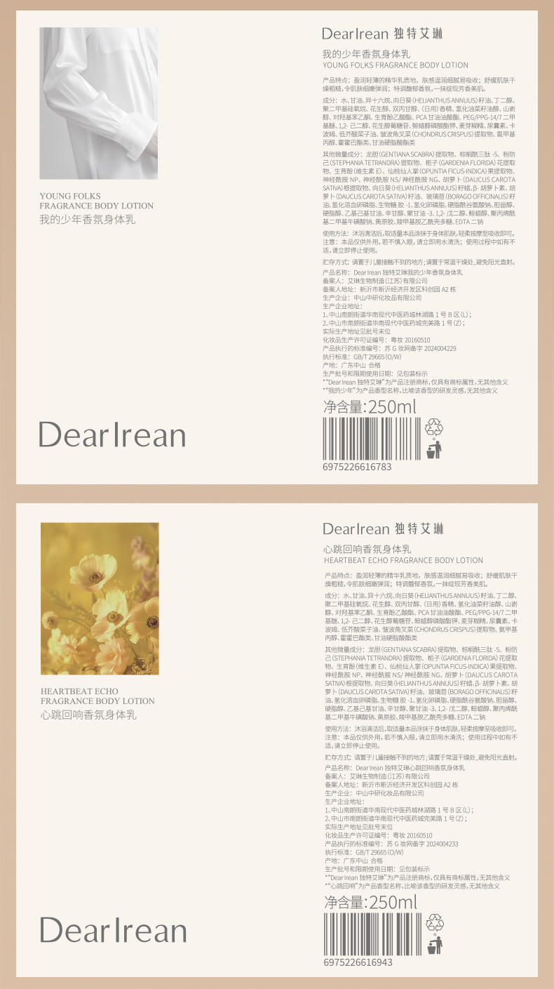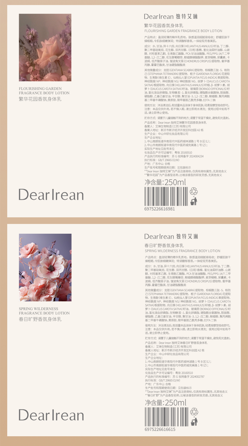 Dear lrean独特艾琳 香氛身体乳250ml(5种香型可选:心跳回响、春日旷野、浮靡之水、我的少年、繁华花园)