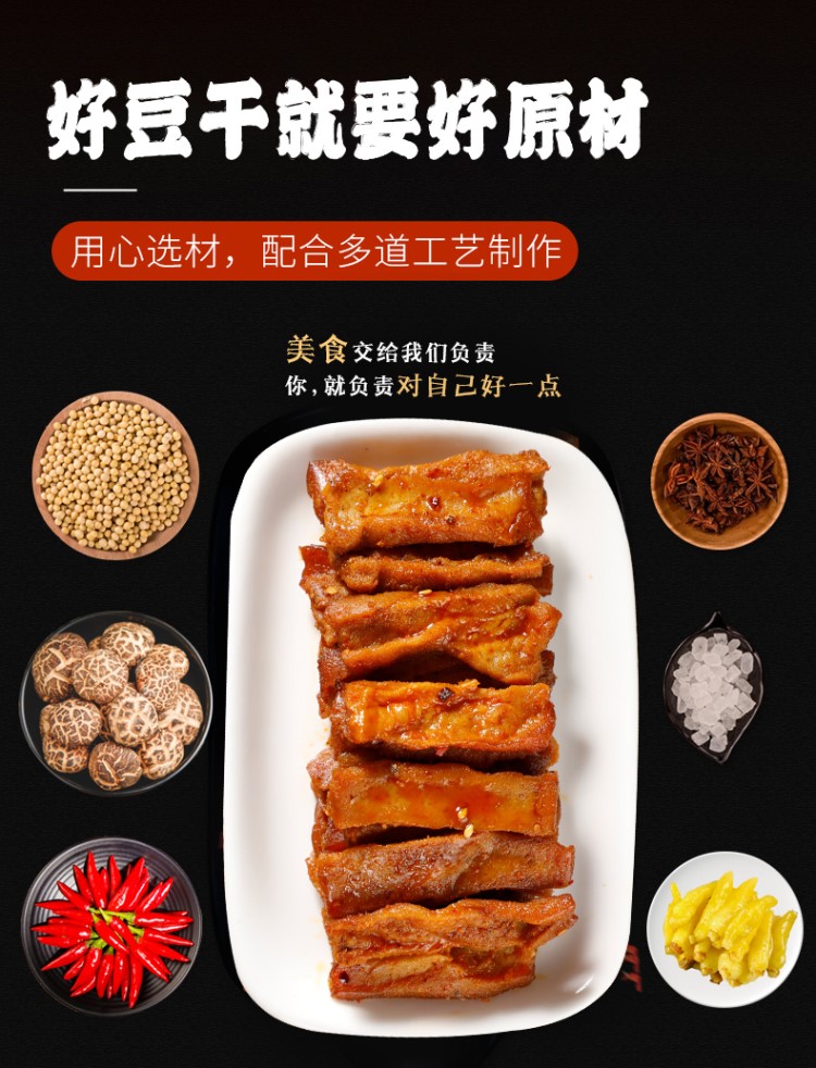 精选来自400多年历史,闻名中外的“豆腐之乡”石屏天然大豆,大豆颗粒饱满,散发清香,采用石屏井水点制,井水酸味大,自然含卤,做成的豆腐干鲜香细嫩,香卤入味,口感弹力十足,营养价值高