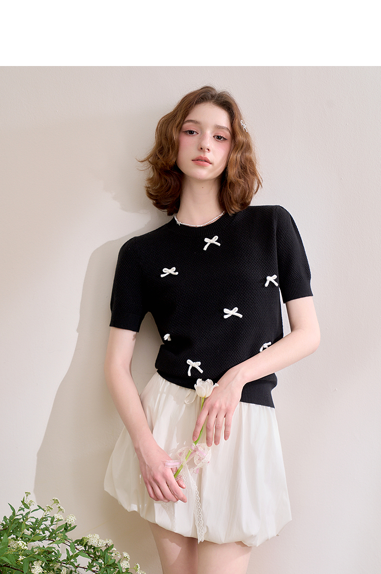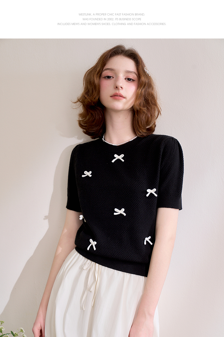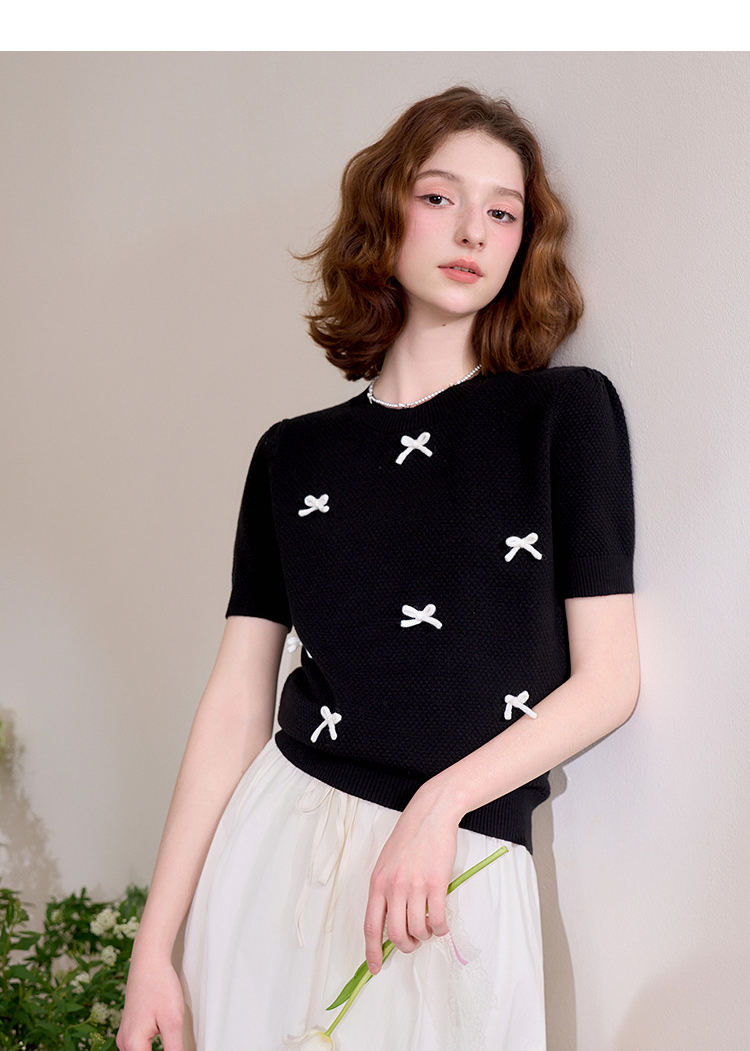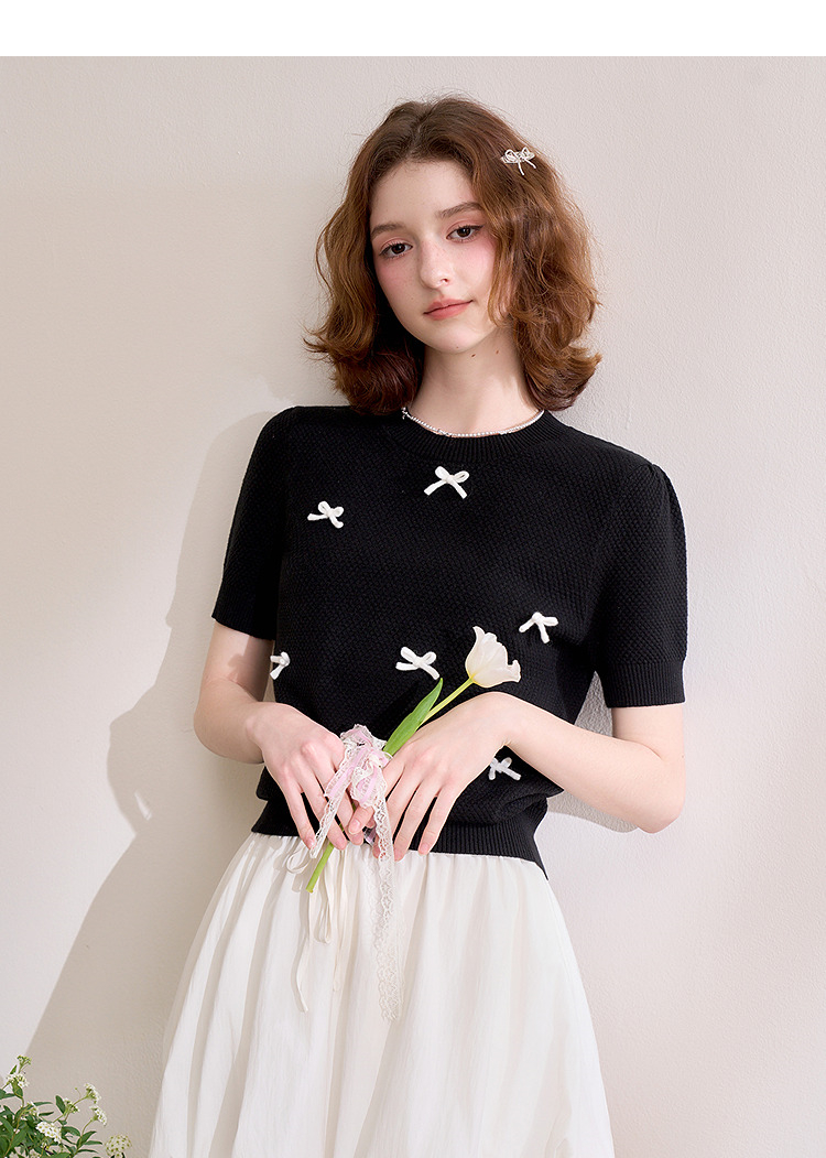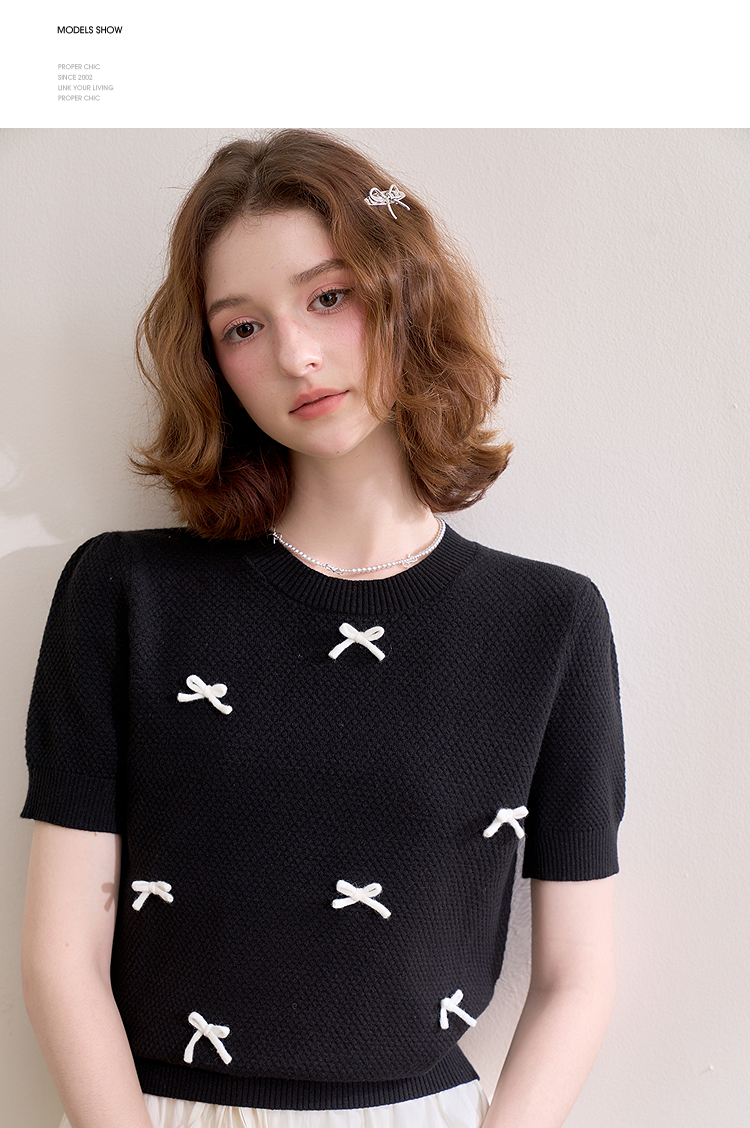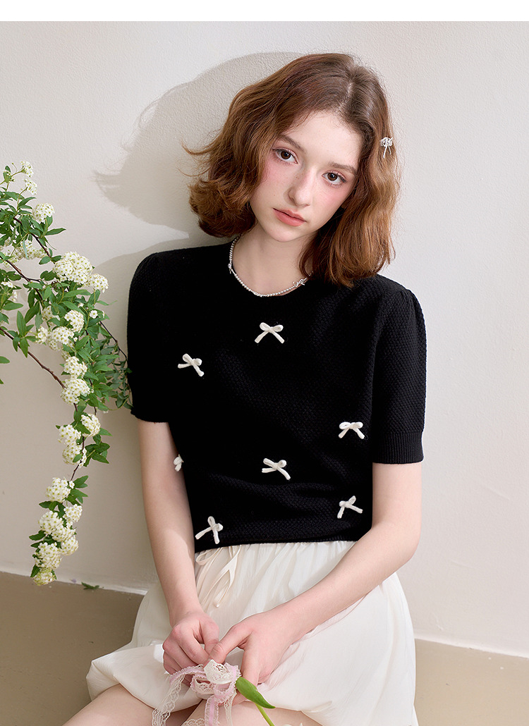 【限时秒杀】【立体蝴蝶结】软糯短袖针织衫女短款薄款圆领毛衣V0650269