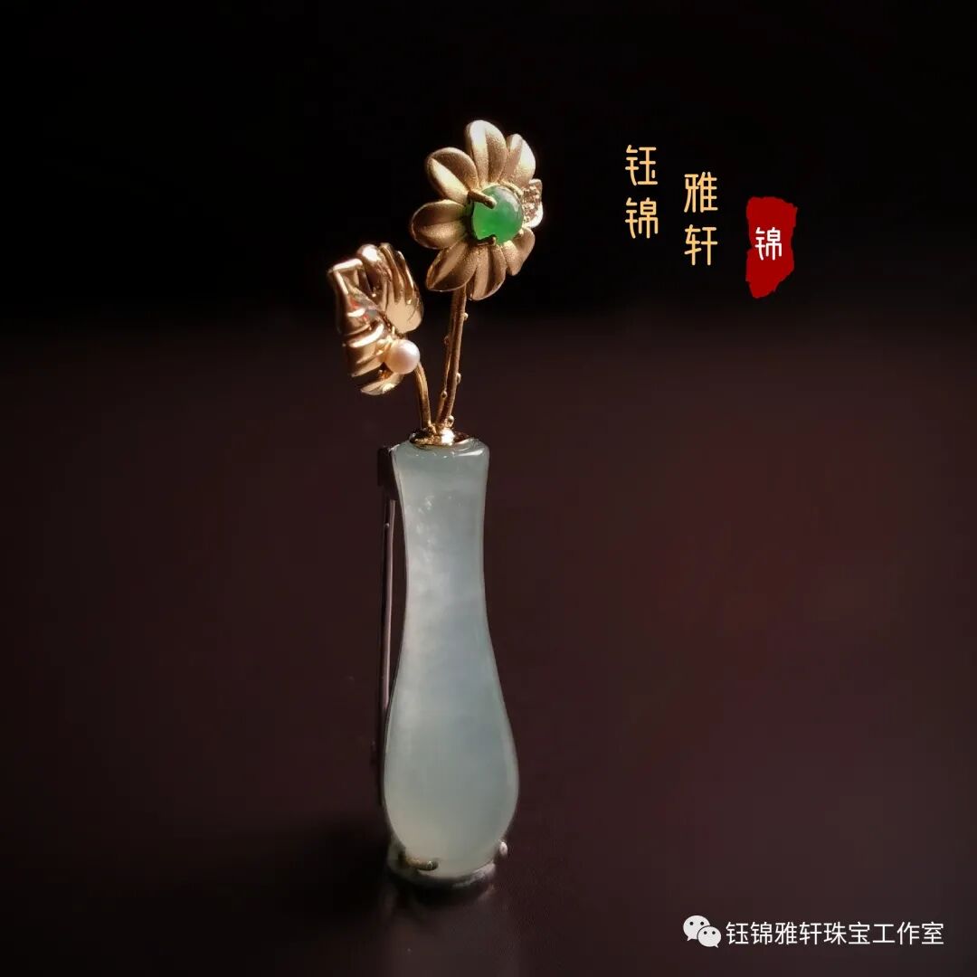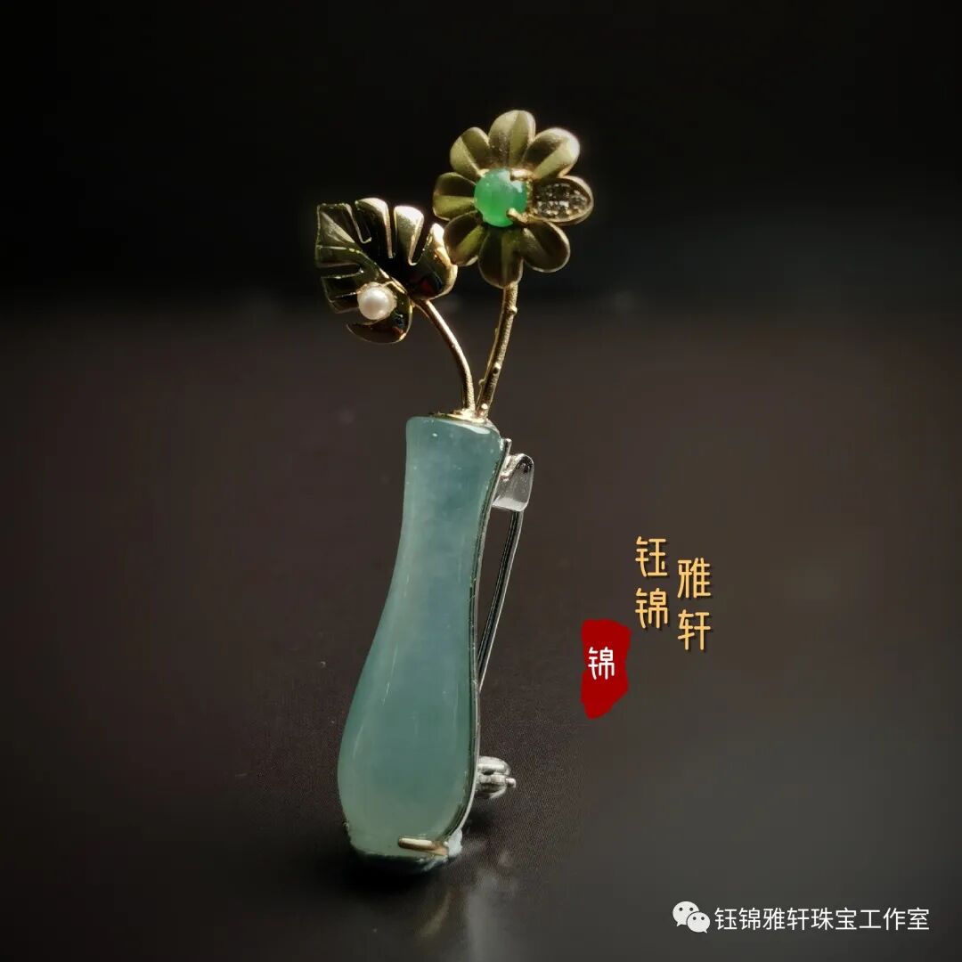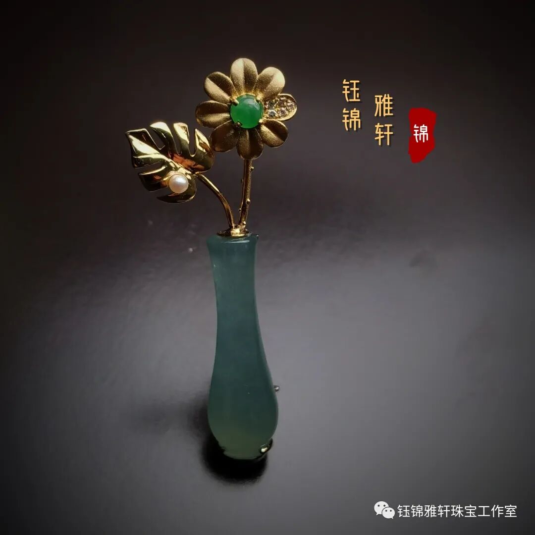 在我的收藏中有一件翡翠的小花瓶,种质细腻,水润盈透,细颈园腹,小巧精致,很是讨人喜欢。 原本最初只是想镶嵌个简单的吊坠,但思来想去还是觉得做件胸针吧!四季适宜。且珠宝胸针饰品,越来越受到大家的青睐。已成为日常必备首饰。