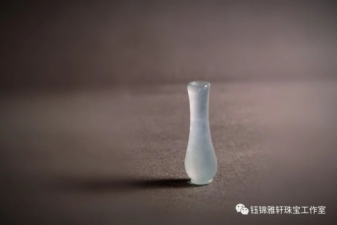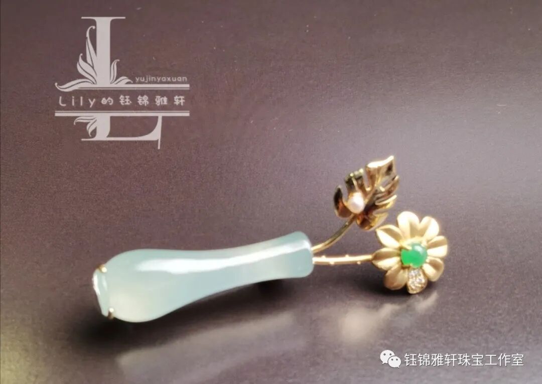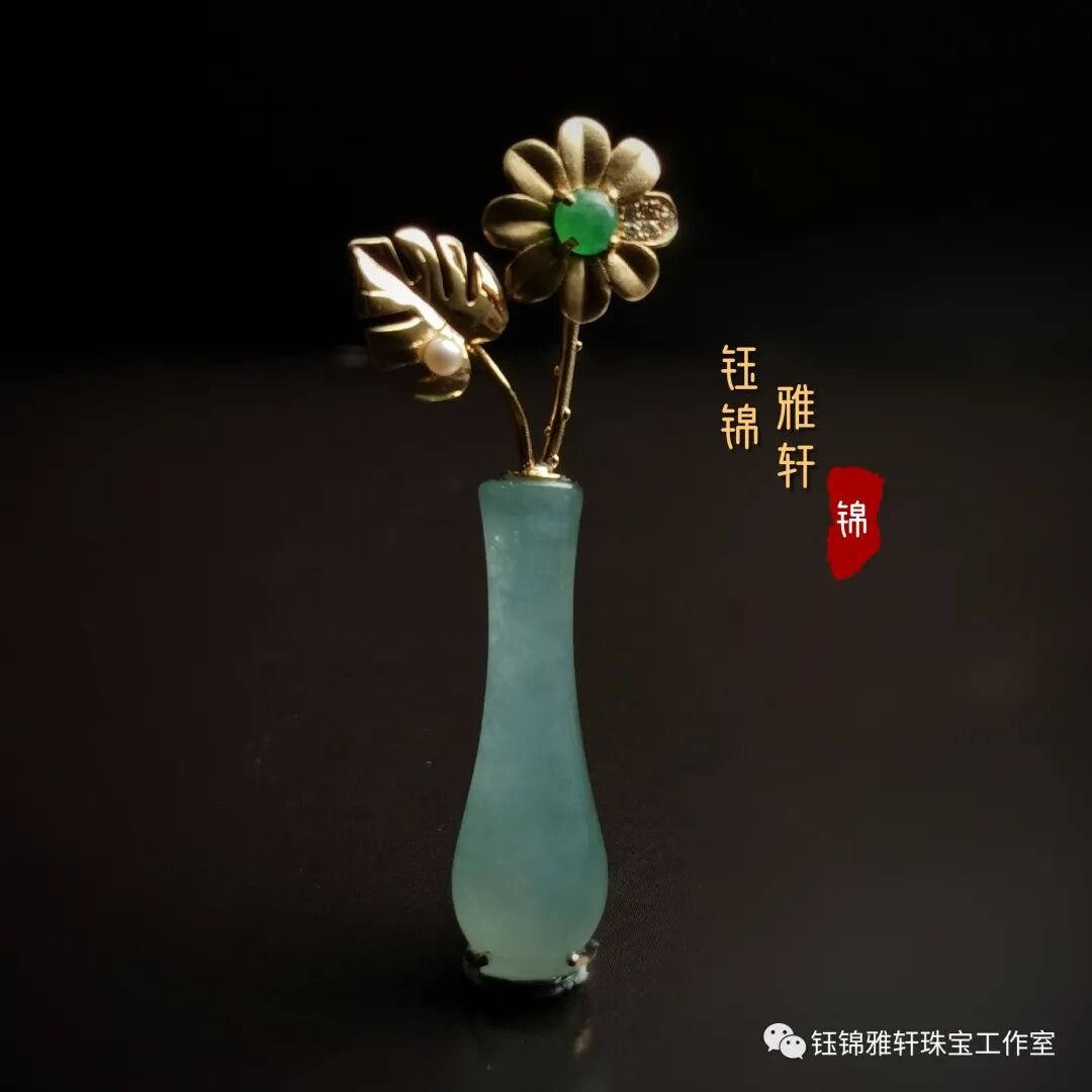 在我的收藏中有一件翡翠的小花瓶,种质细腻,水润盈透,细颈园腹,小巧精致,很是讨人喜欢。 原本最初只是想镶嵌个简单的吊坠,但思来想去还是觉得做件胸针吧!四季适宜。且珠宝胸针饰品,越来越受到大家的青睐。已成为日常必备首饰。