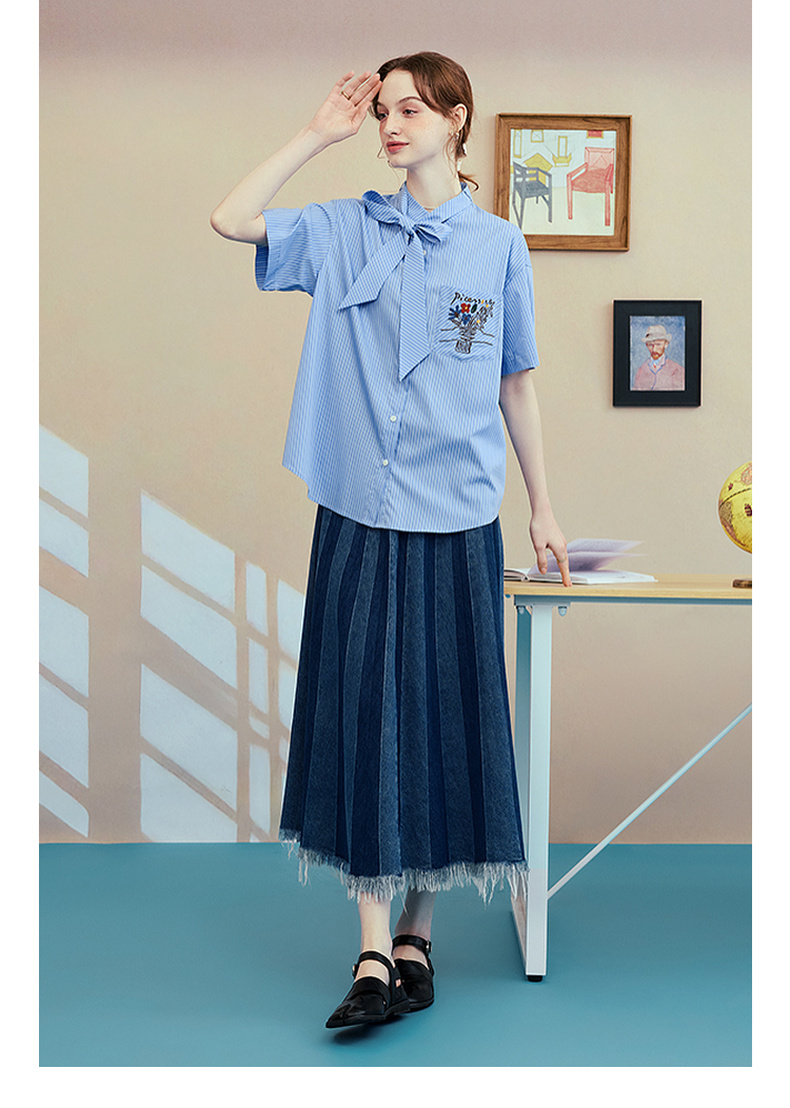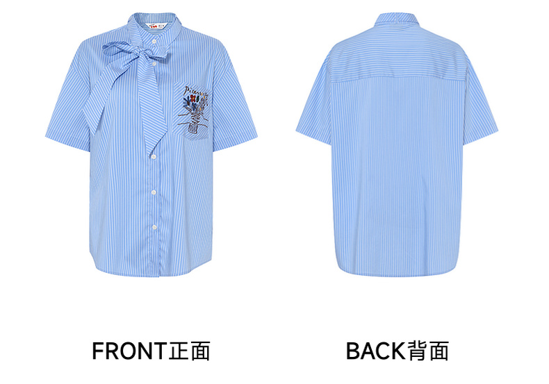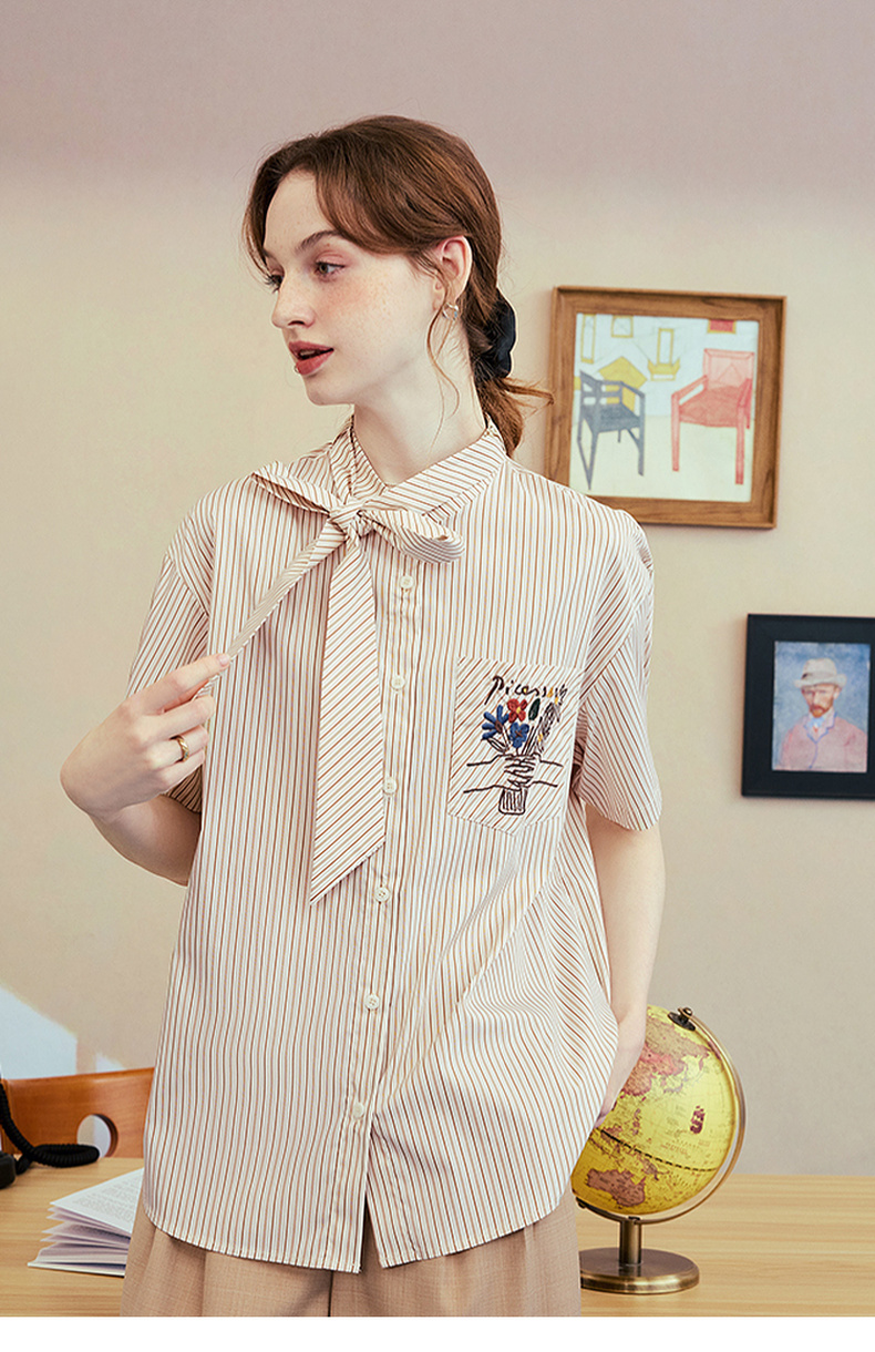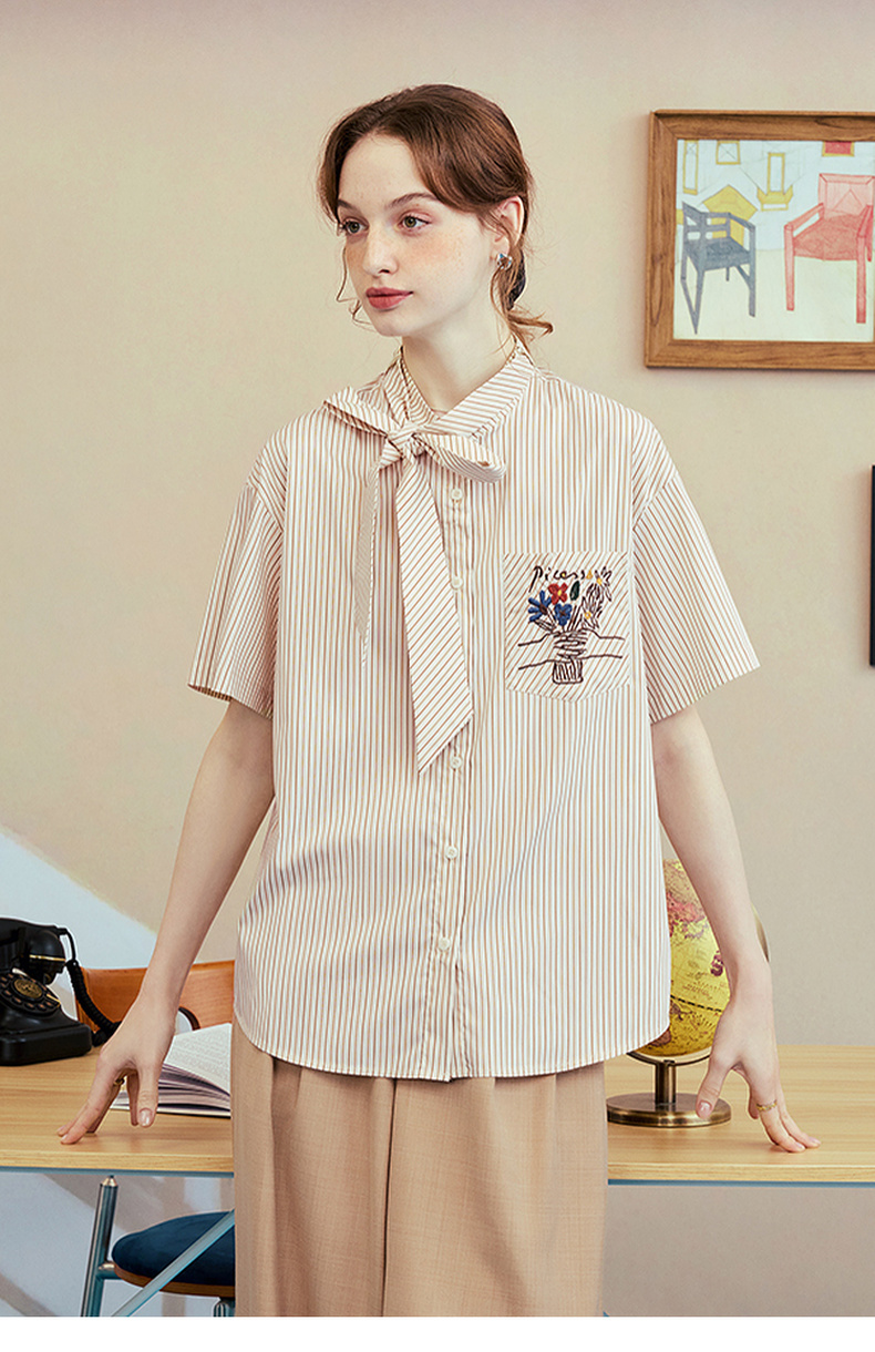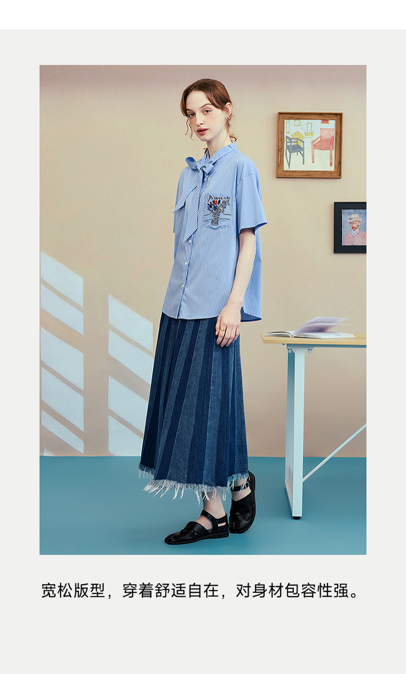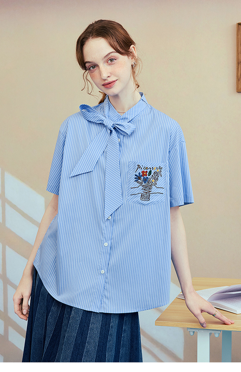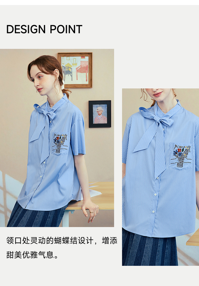 两三事 柠海电波 2025夏季新款文艺风刺绣绑带条纹衬衫女宽松衬衣