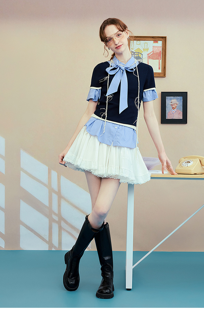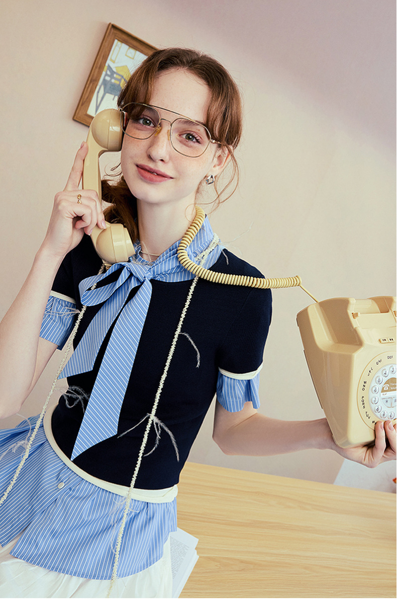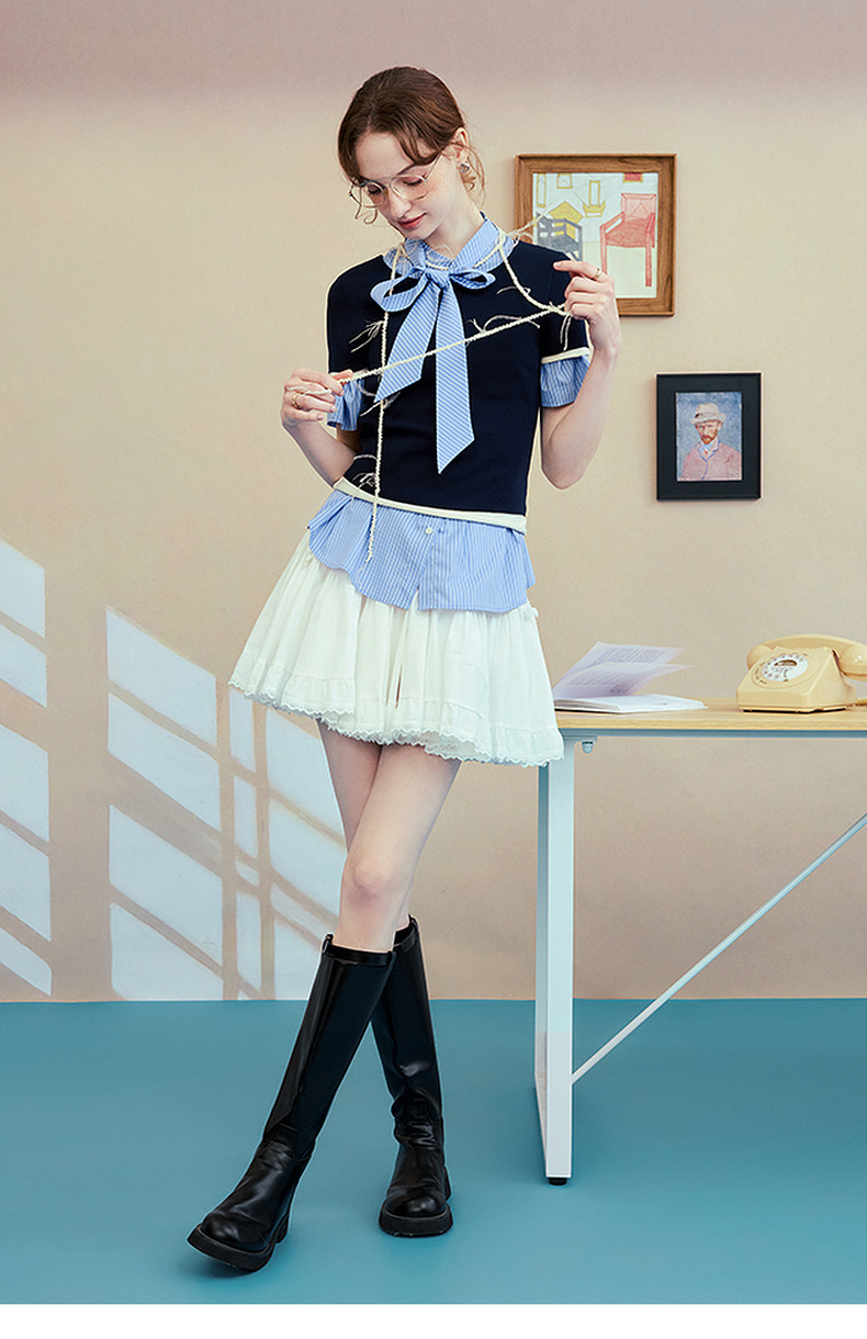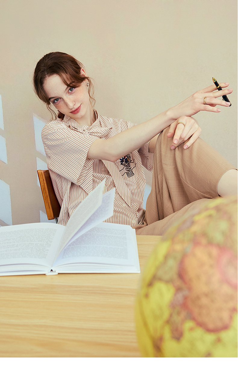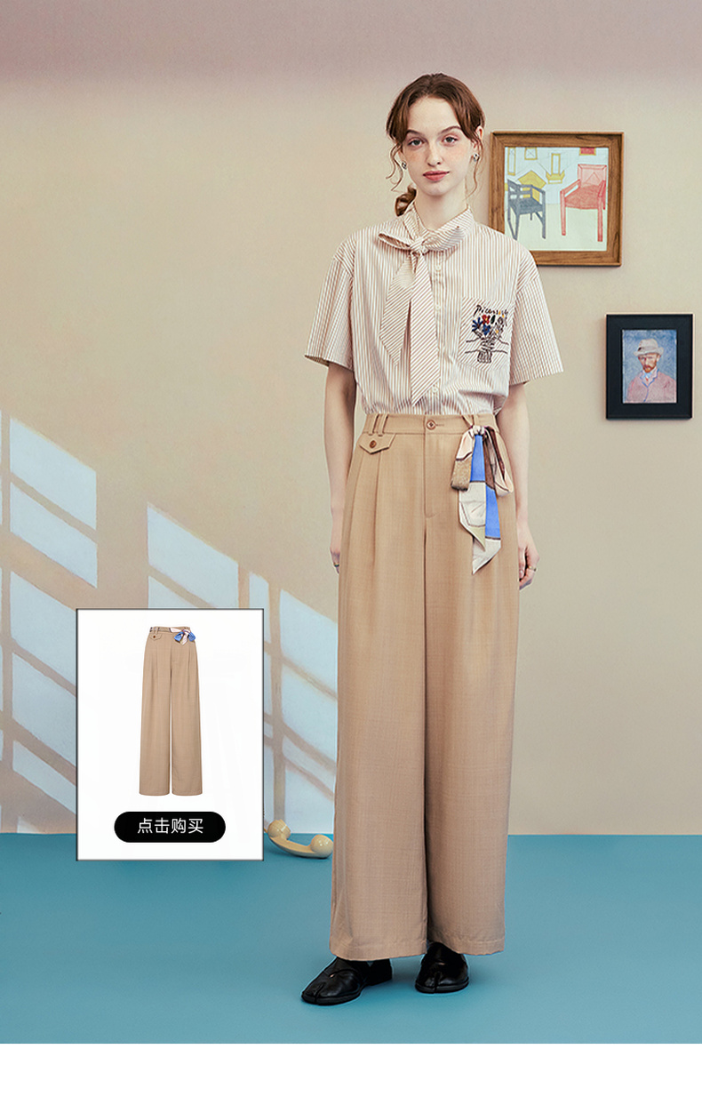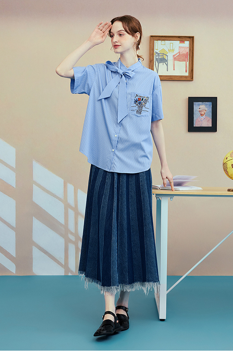 两三事 柠海电波 2025夏季新款文艺风刺绣绑带条纹衬衫女宽松衬衣