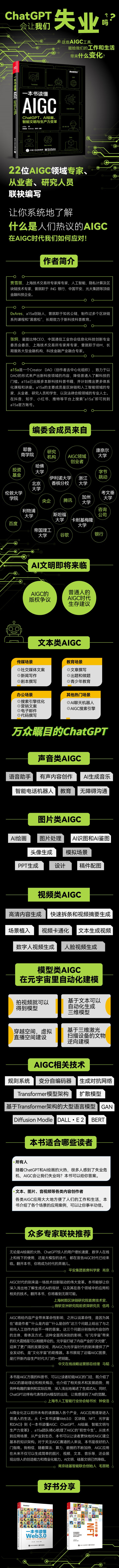 AIGC时代的到来是一场技术创新驱动的伟大变革。本书能够让你深入浅出地了解生成式AI的现状,以及其在各个领域中的应用和相关的技术。翻开本书,你将看到无限可能。