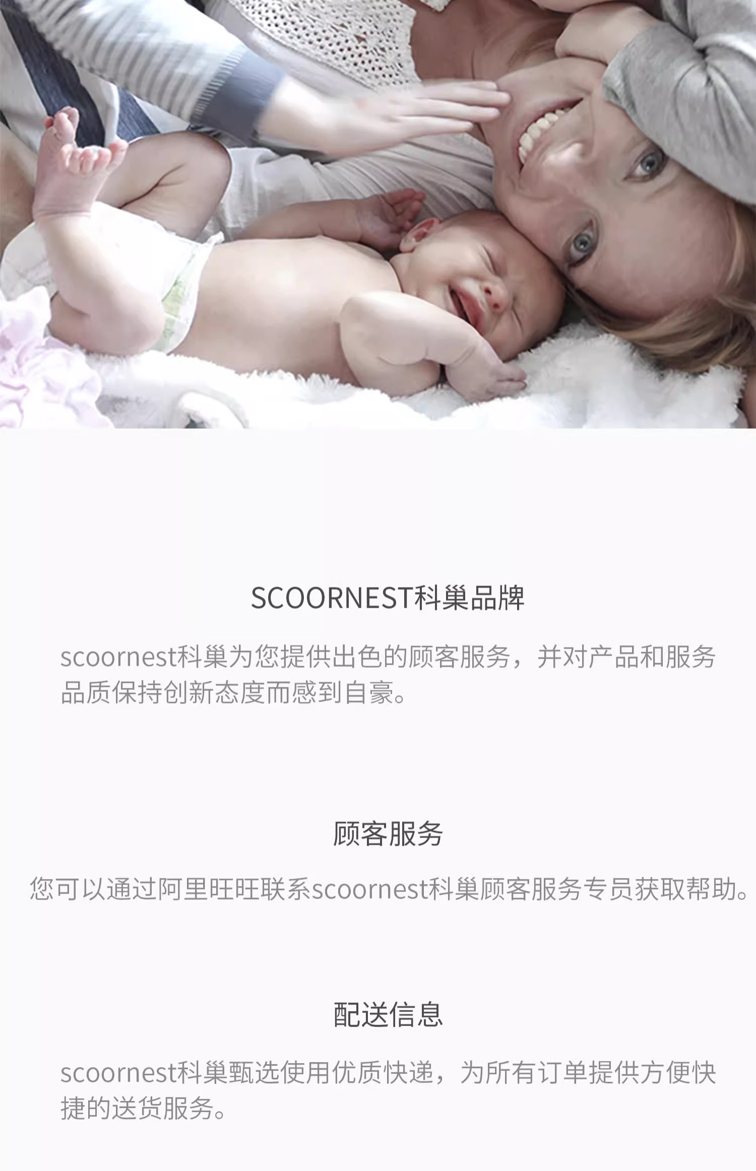 - Scoornest始终秉承给每一位宝宝送去科学的、关心的、创新的成长体验,通过提供商品和服务,使顾客形成守护、发展、巩固这种弥足珍贵的亲情的爱。
