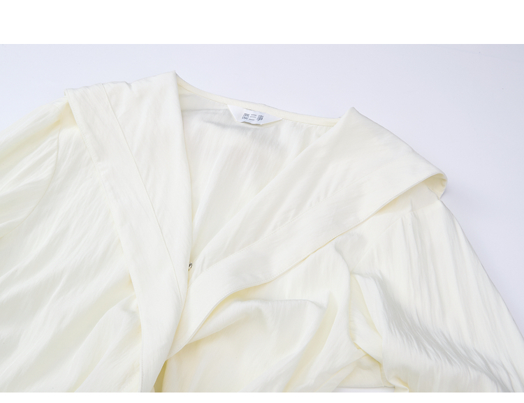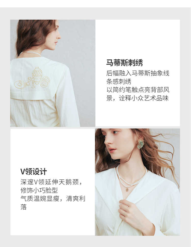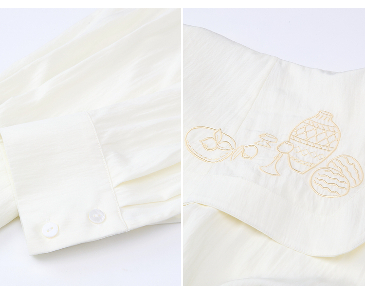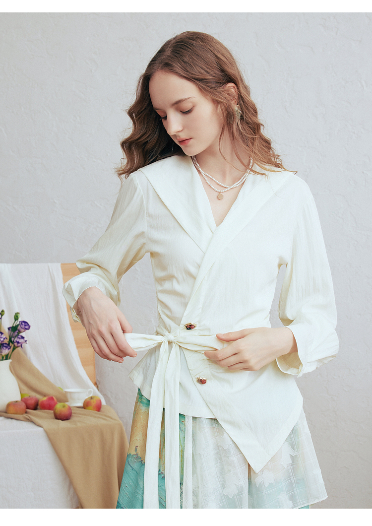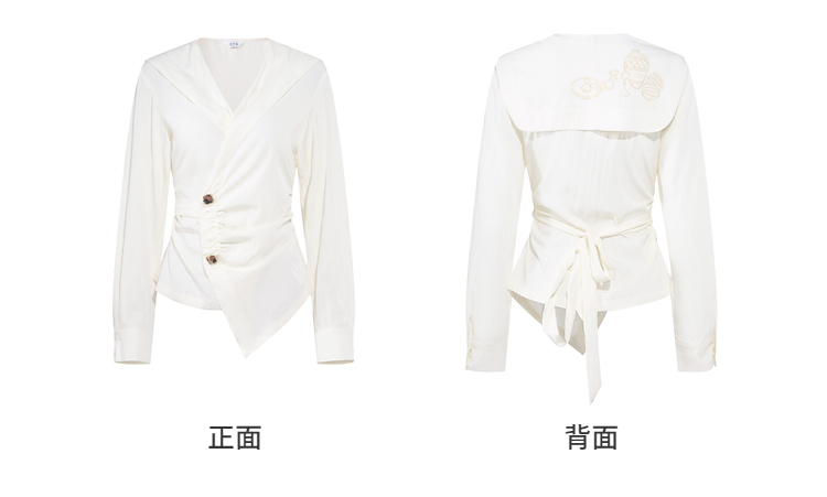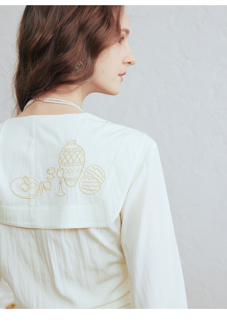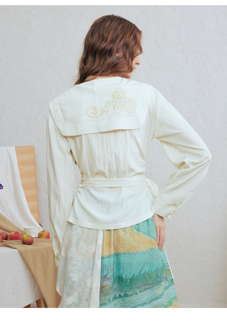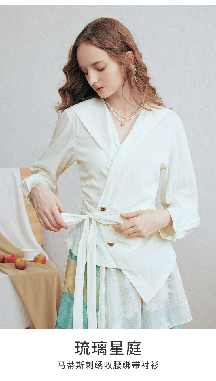 两三事 琉璃星庭 2026春季新款优雅刺绣海军领收腰绑带长袖衬衫女