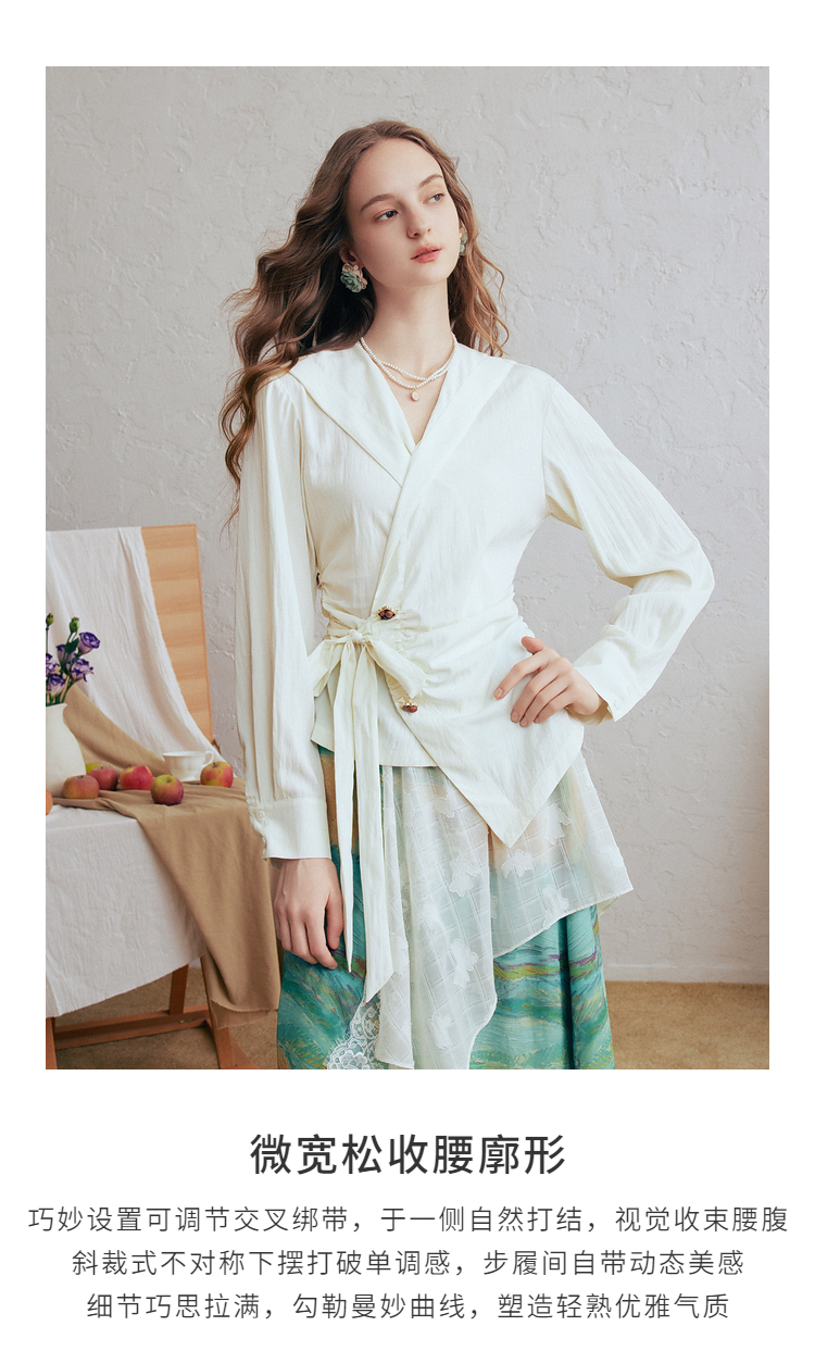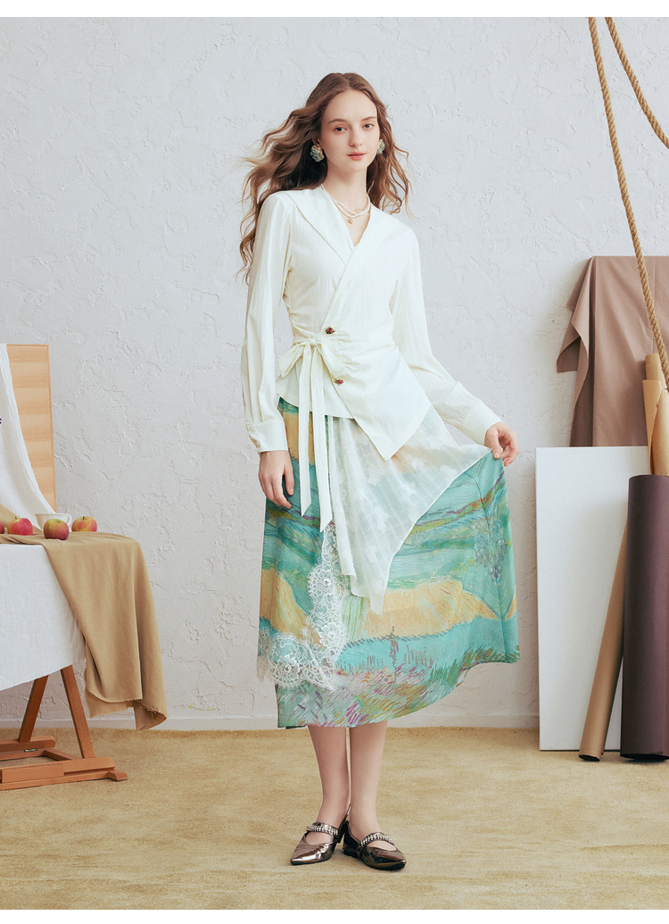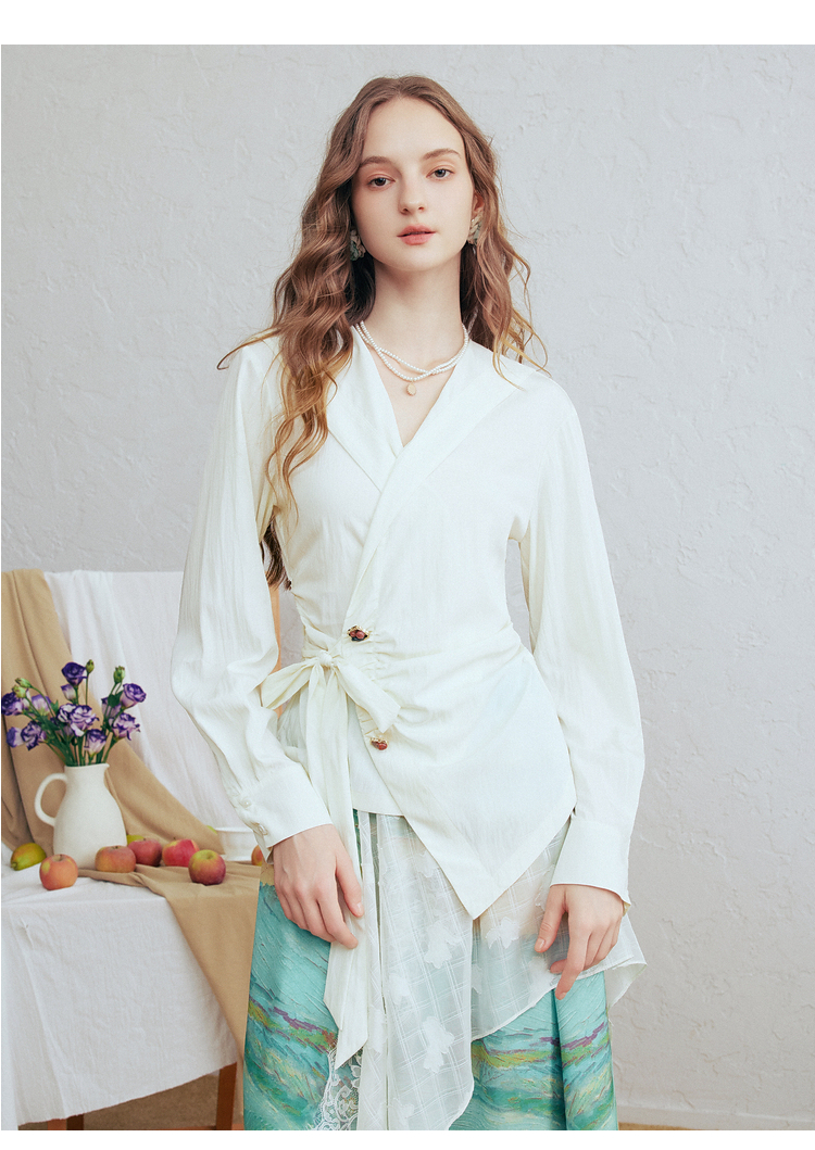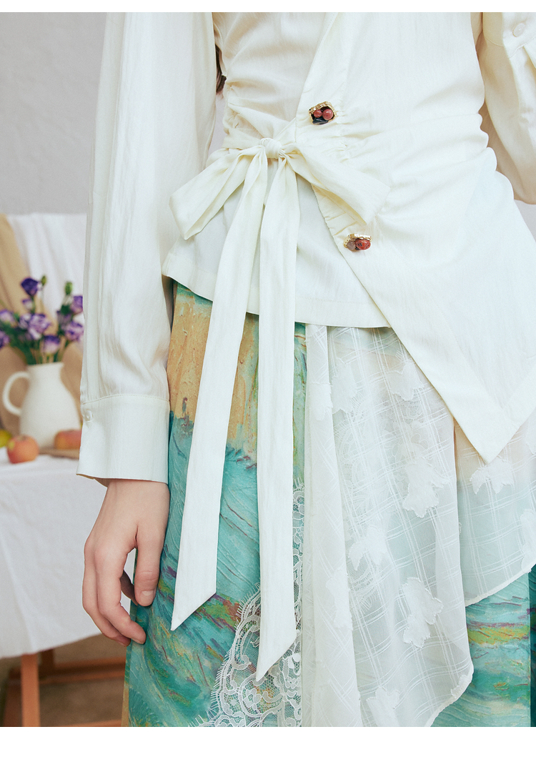 两三事梵高文艺春日序言2025春季新款蕾丝拼接荷叶边领绑带上衣女S25CLS342