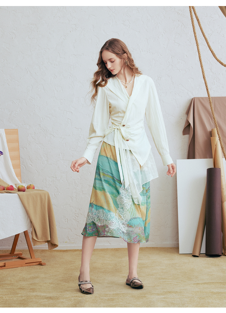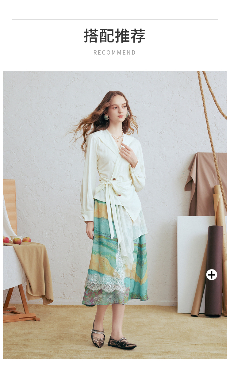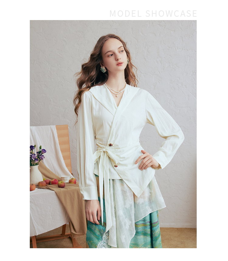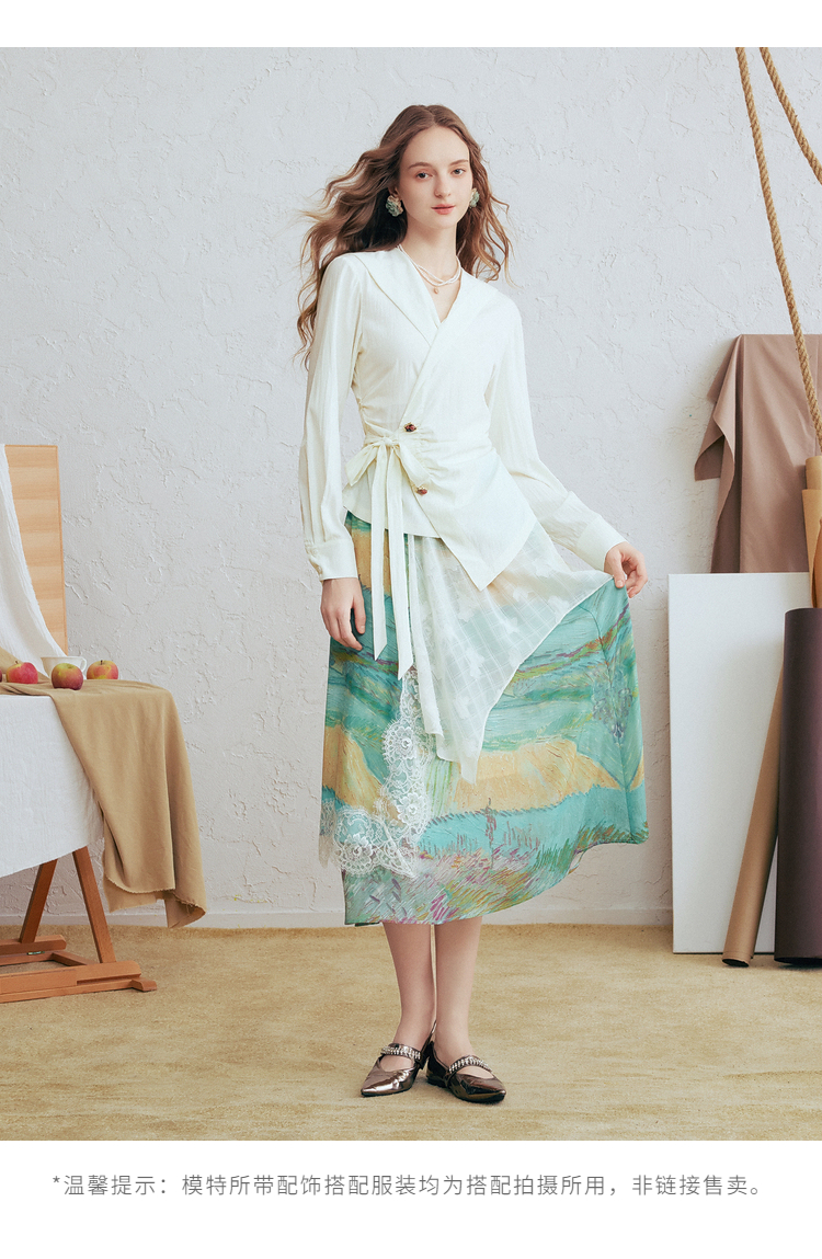 两三事梵高文艺春日序言2025春季新款蕾丝拼接荷叶边领绑带上衣女S25CLS342