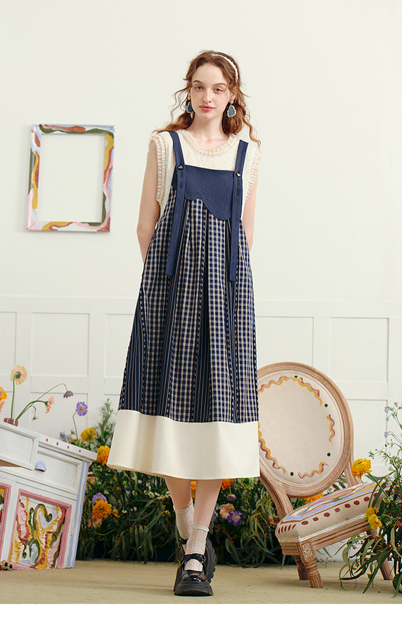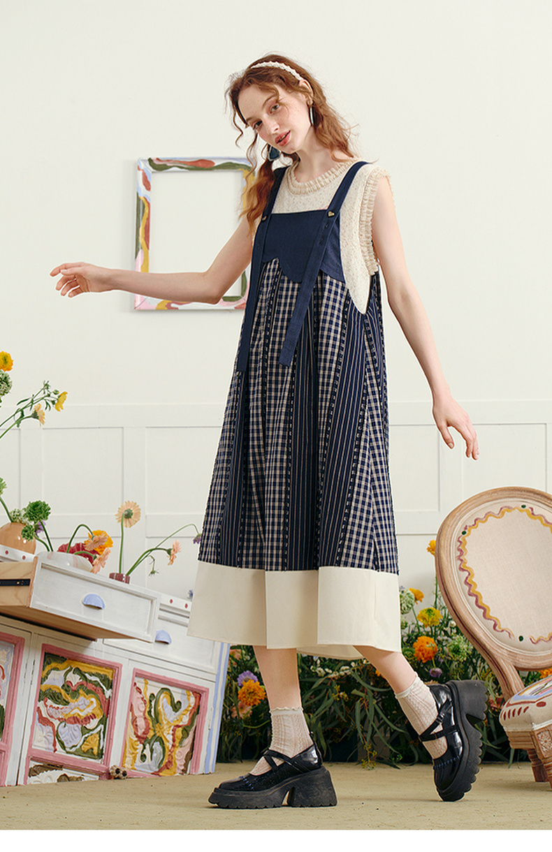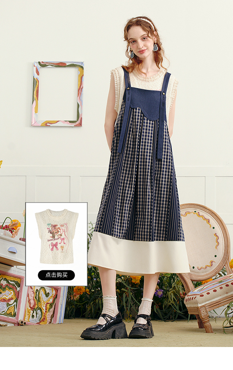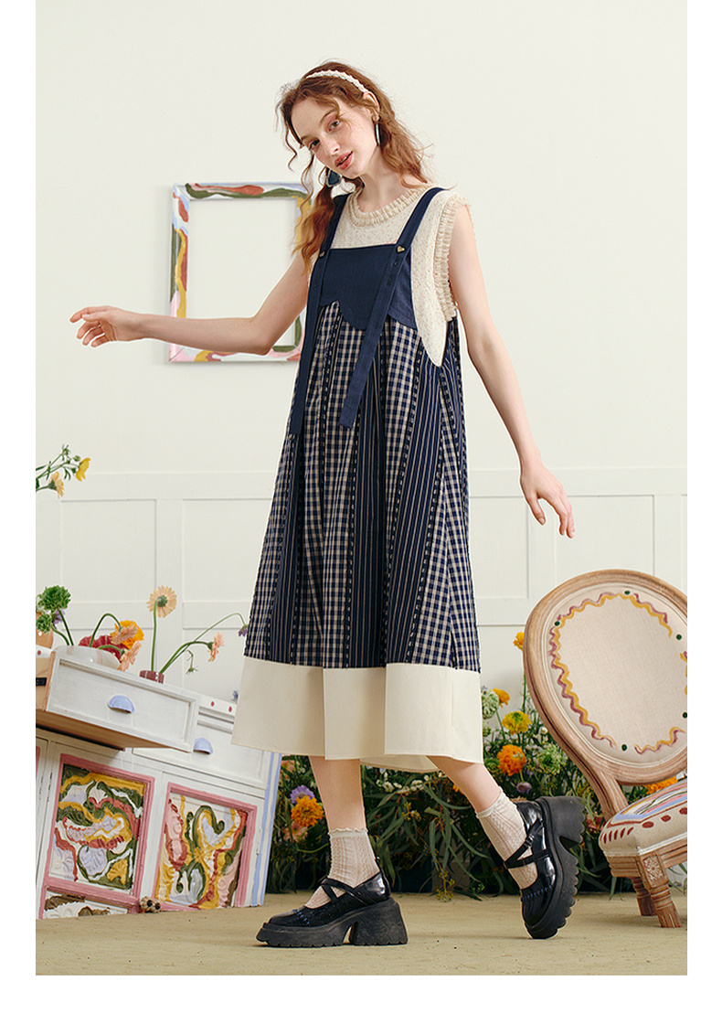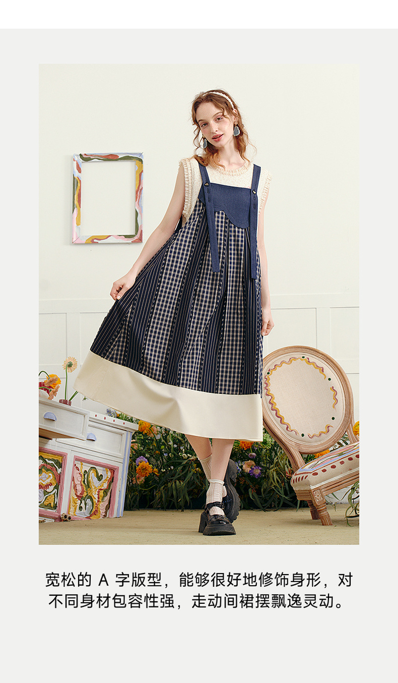 两三事 叠峦山旅 2025夏季新款森女风格子拼接背带裙宽松连衣裙