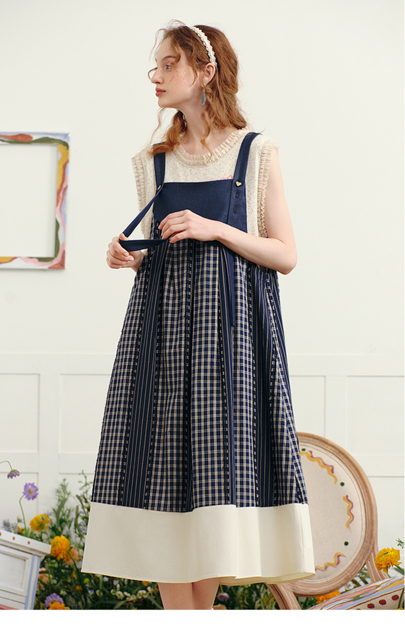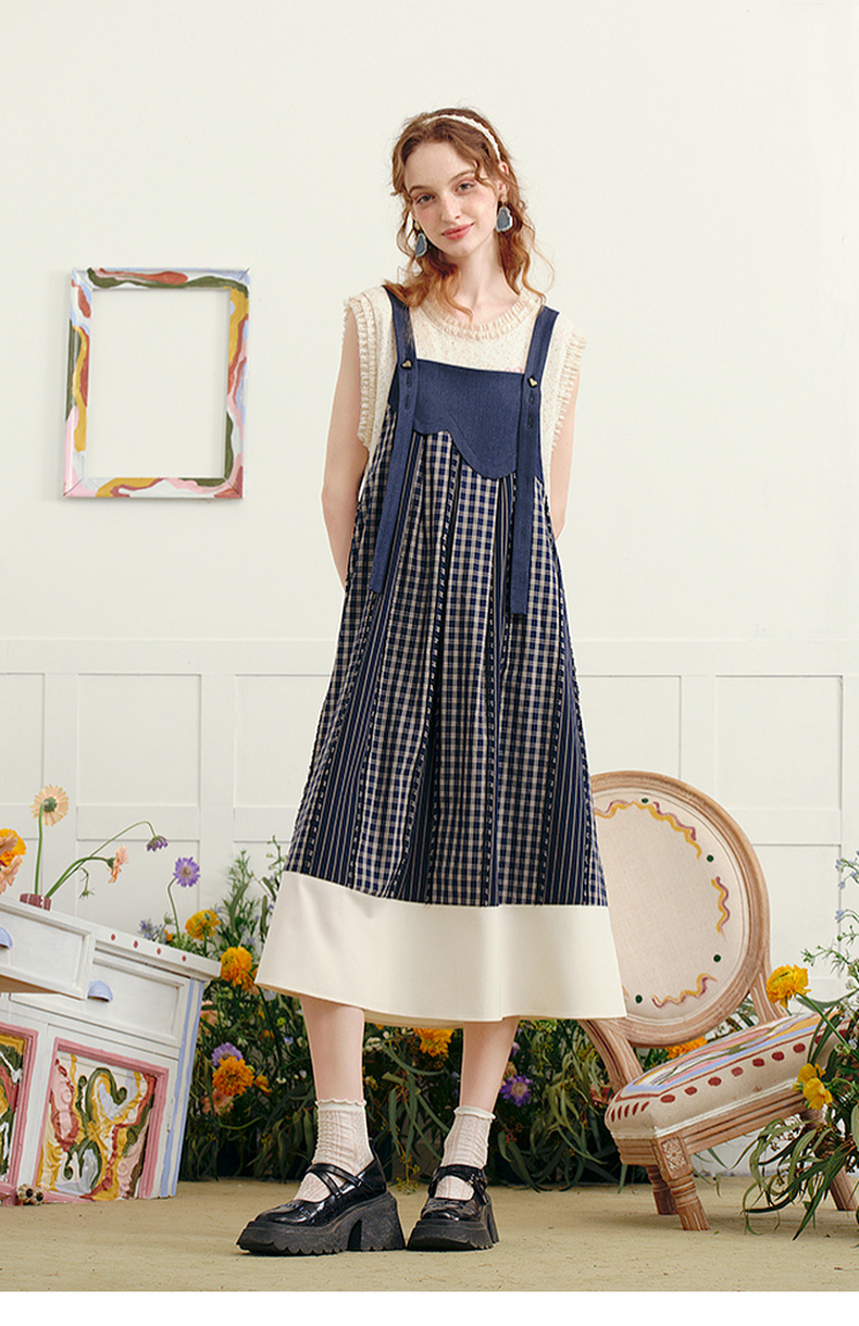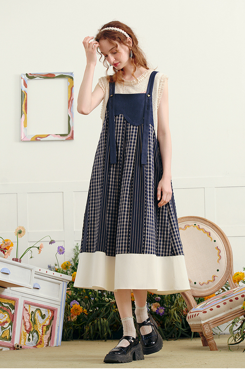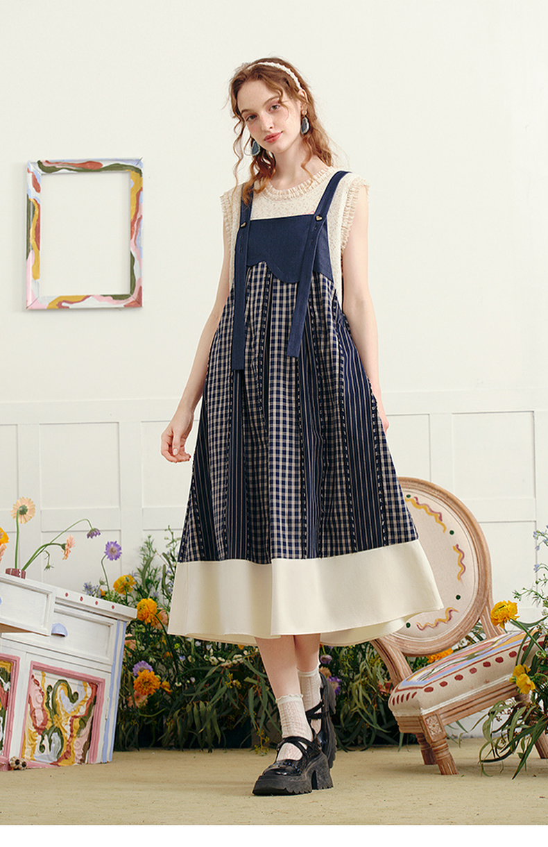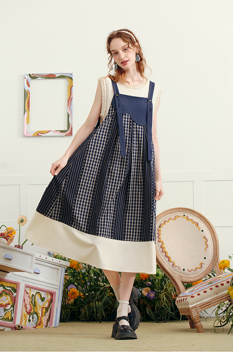 两三事 叠峦山旅 2025夏季新款森女风格子拼接背带裙宽松连衣裙