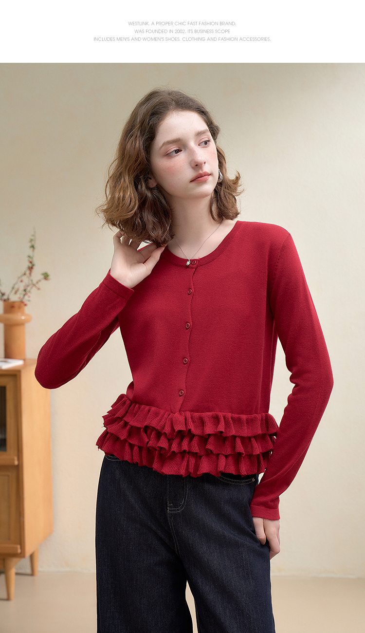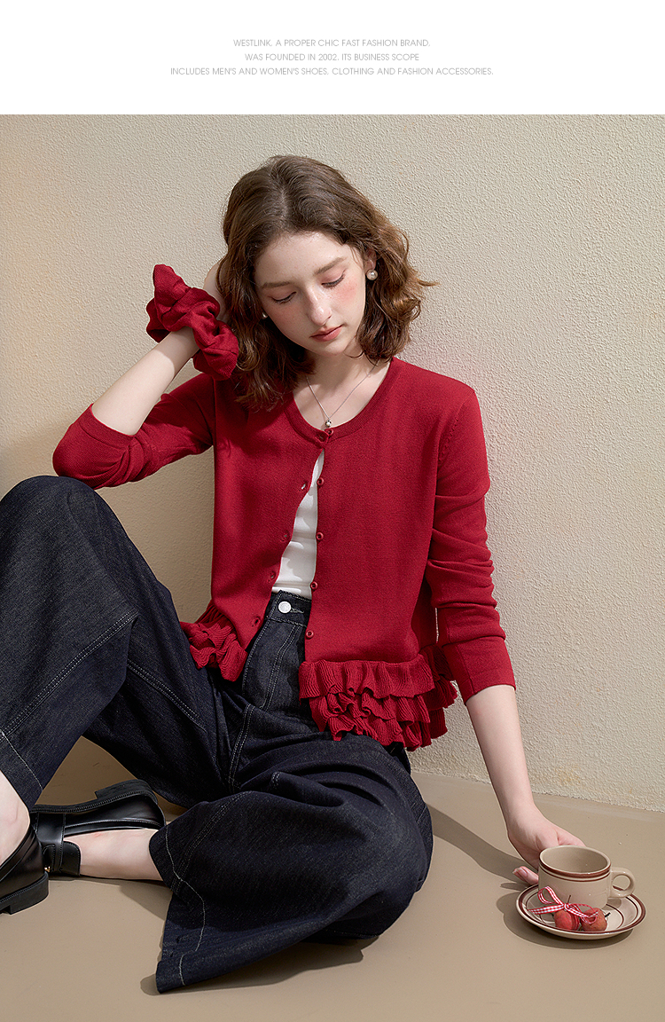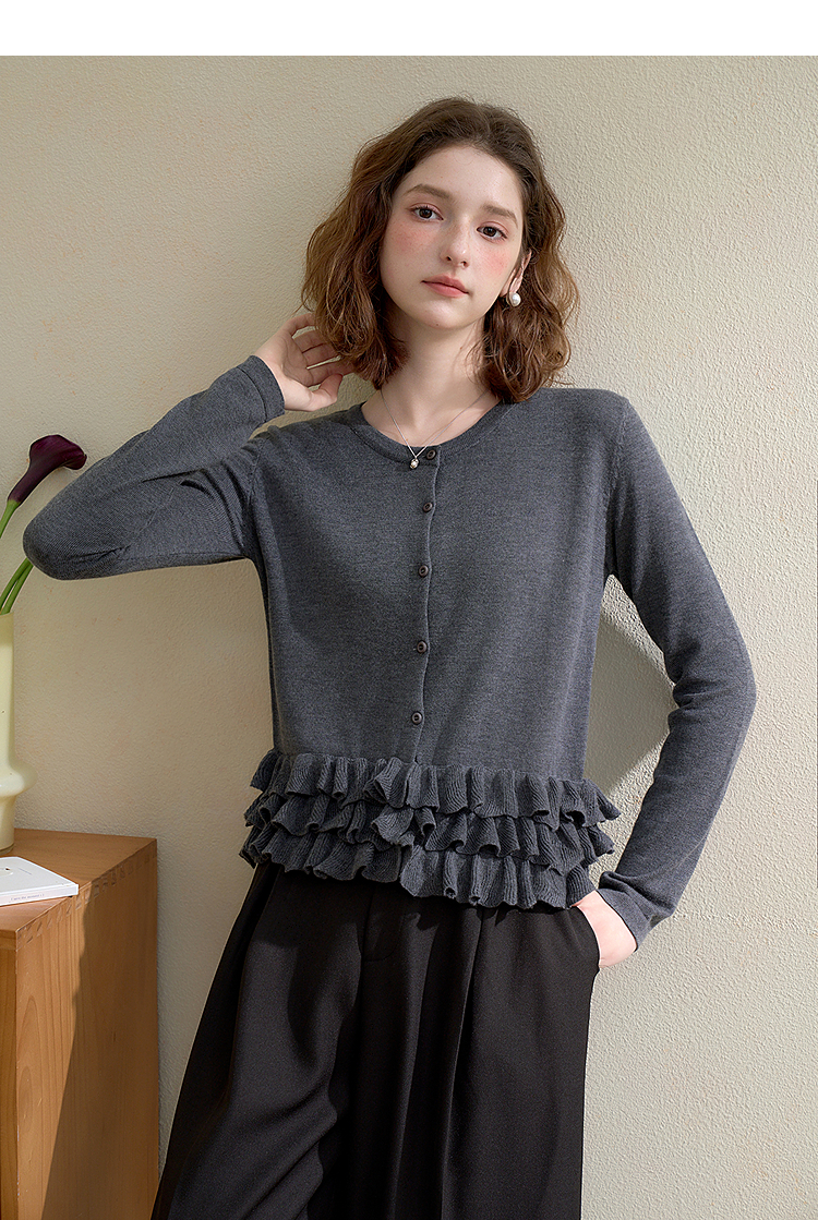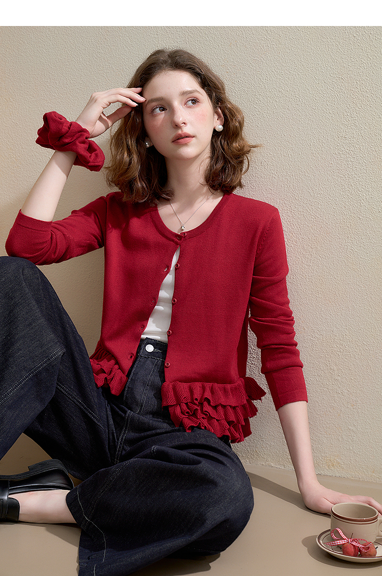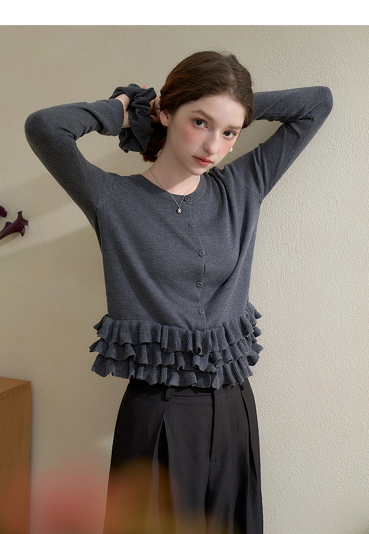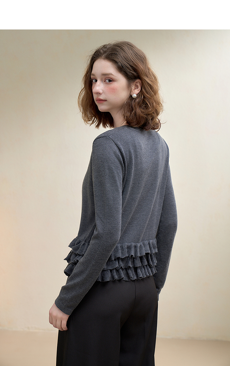 西遇韩系甜美木耳边圆领针织衫女秋季设计感百搭气质软糯毛衣H0051311