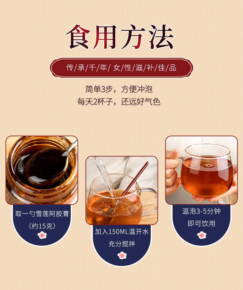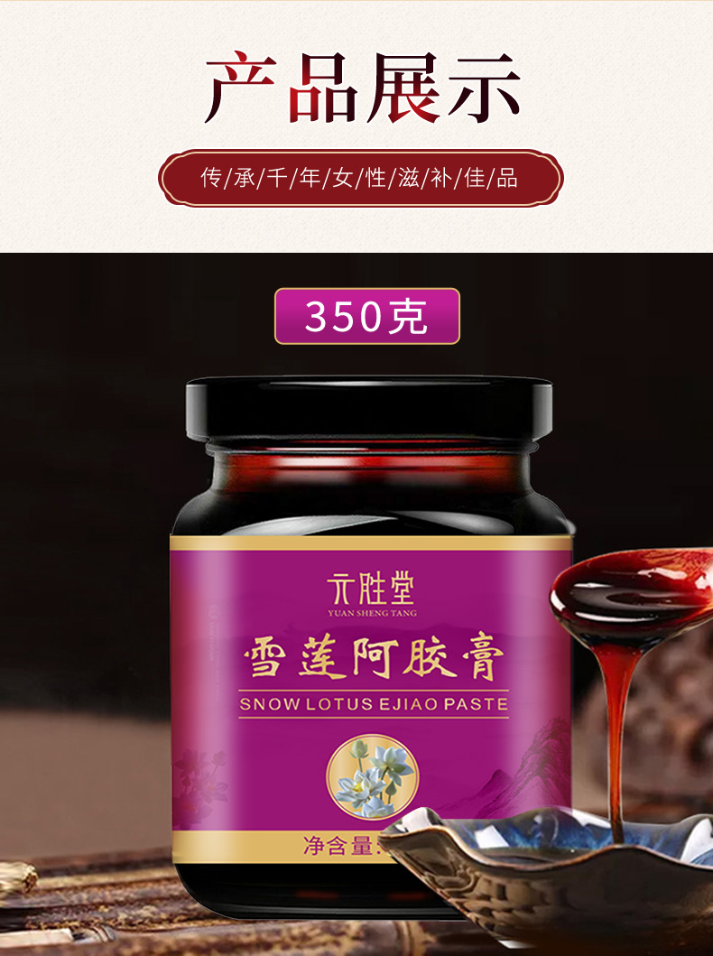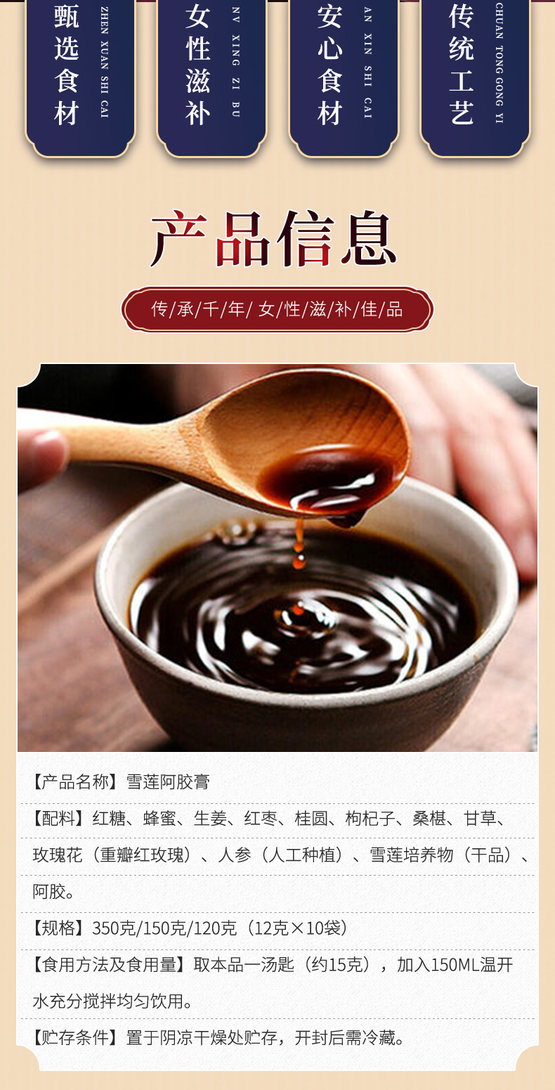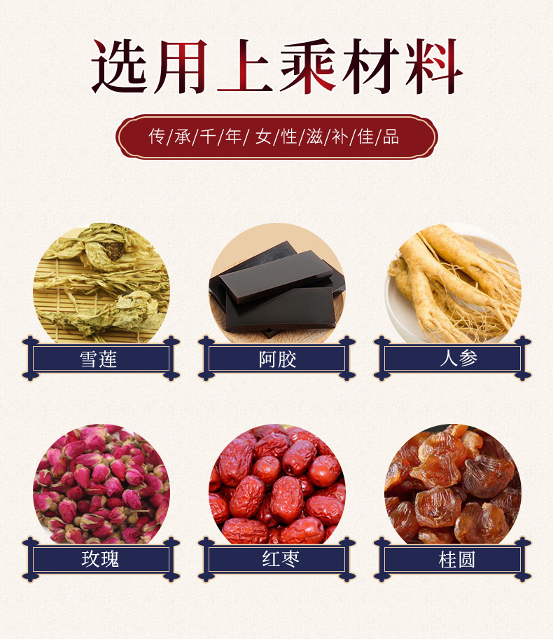 成分:生姜、红枣、桂圆、枸杞子、桑椹、甘草、玫瑰花、人参、雪莲培养物(干品)、阿胶