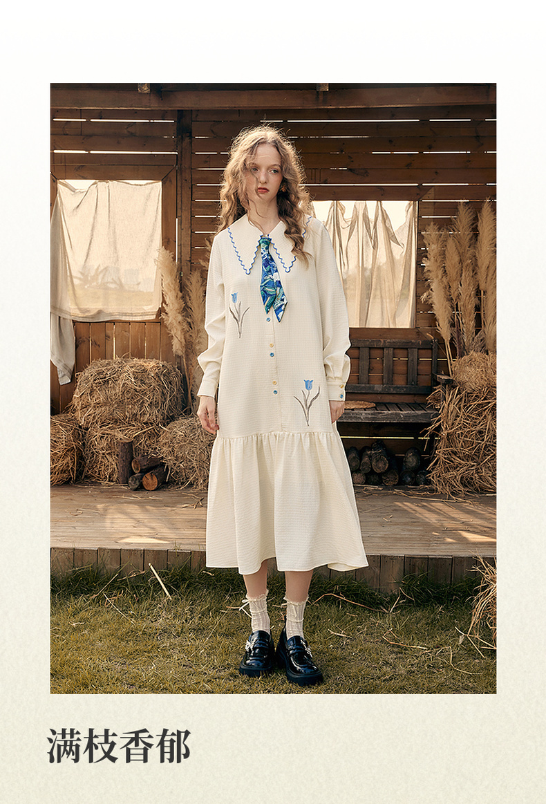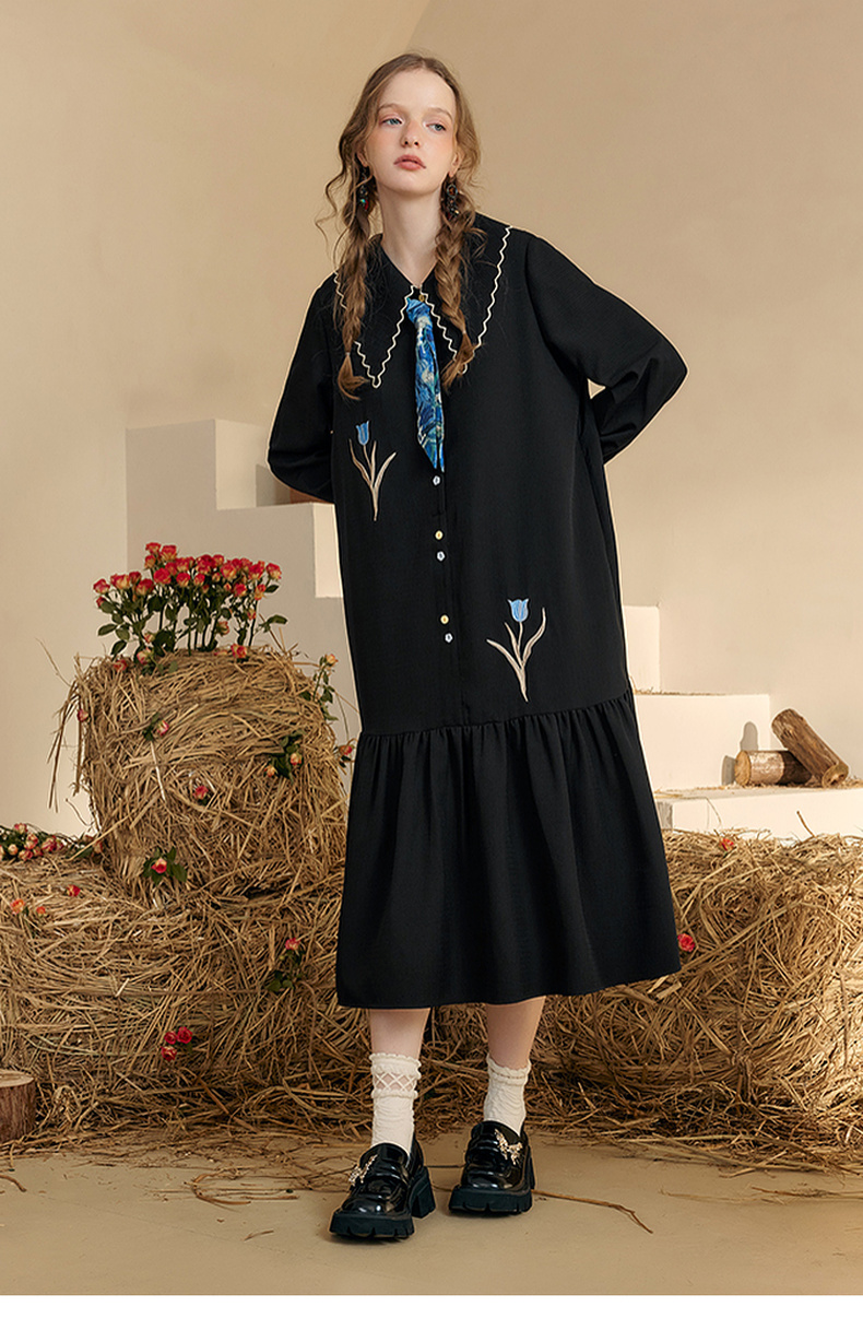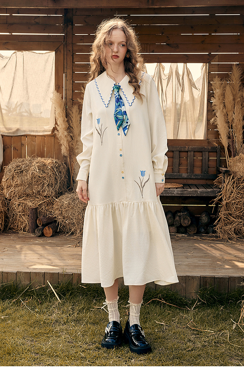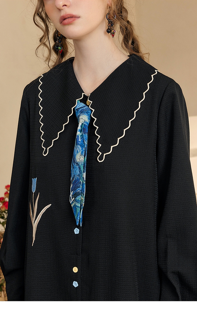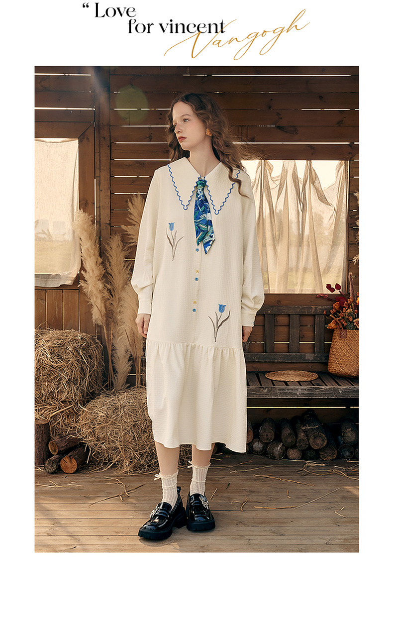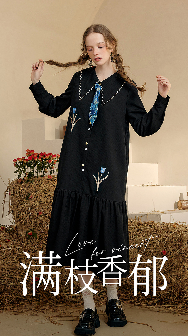 两三事梵高文艺 满枝香郁 2024秋季新款文艺风绣花印花领带连衣裙