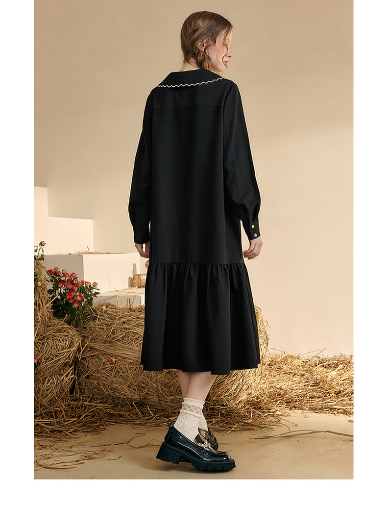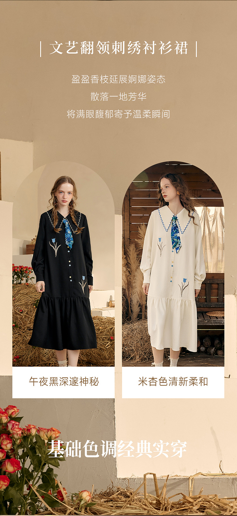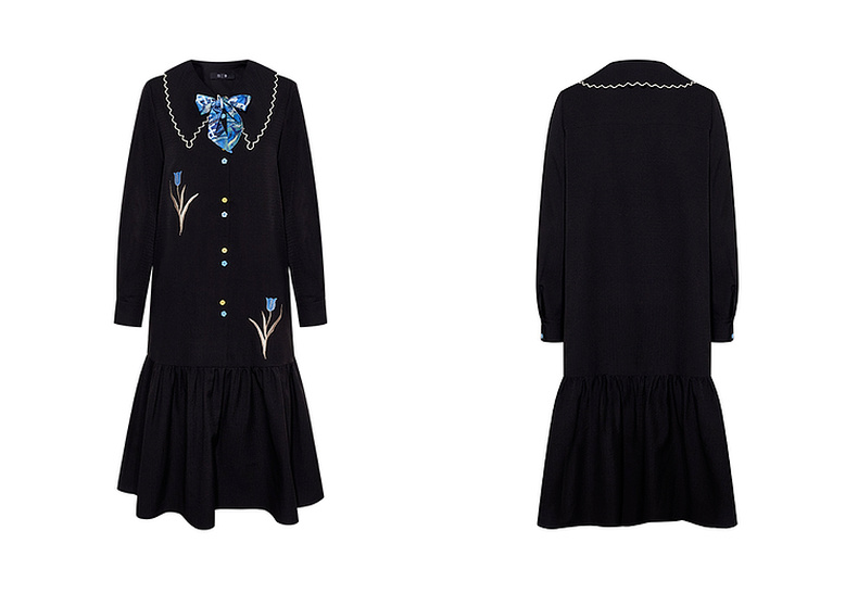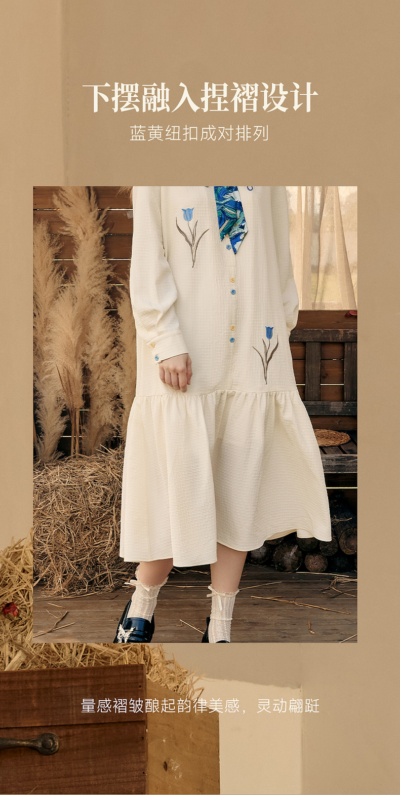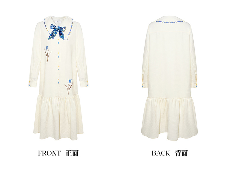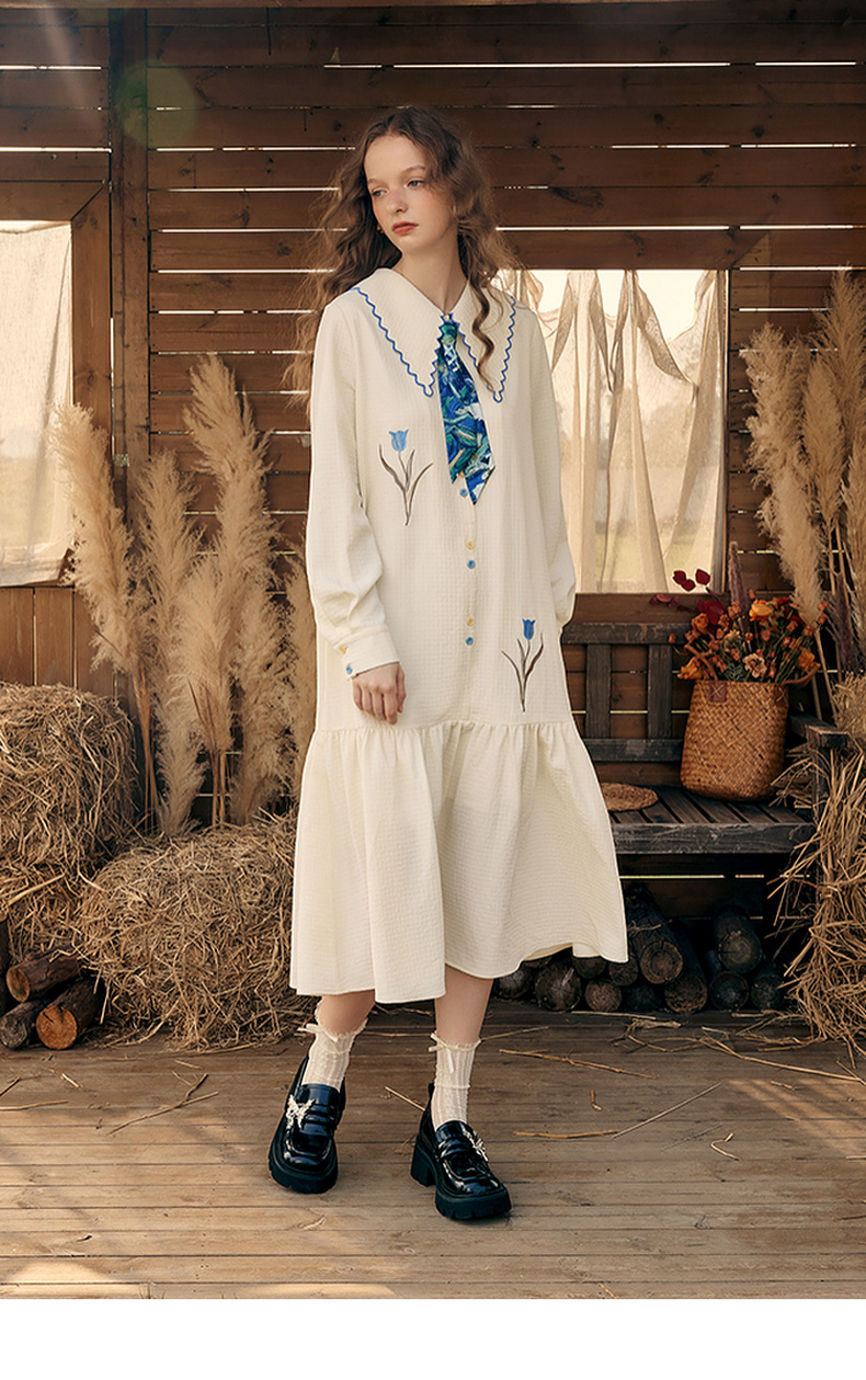 两三事梵高文艺 满枝香郁 2024秋季新款文艺风绣花印花领带连衣裙
