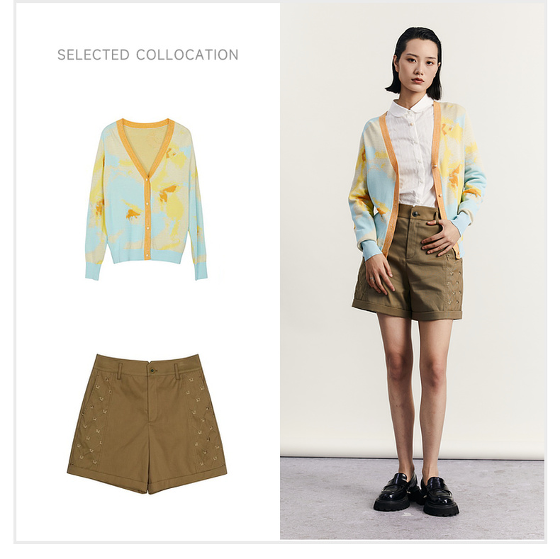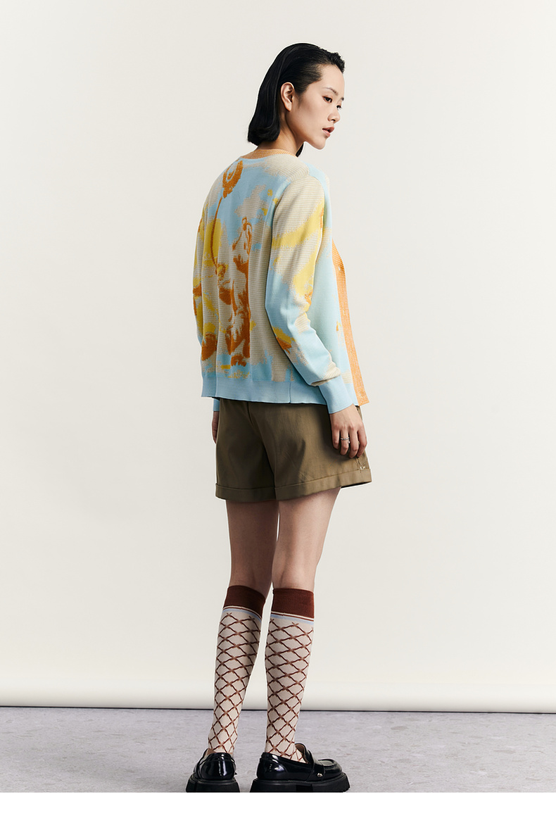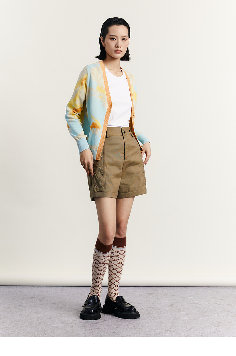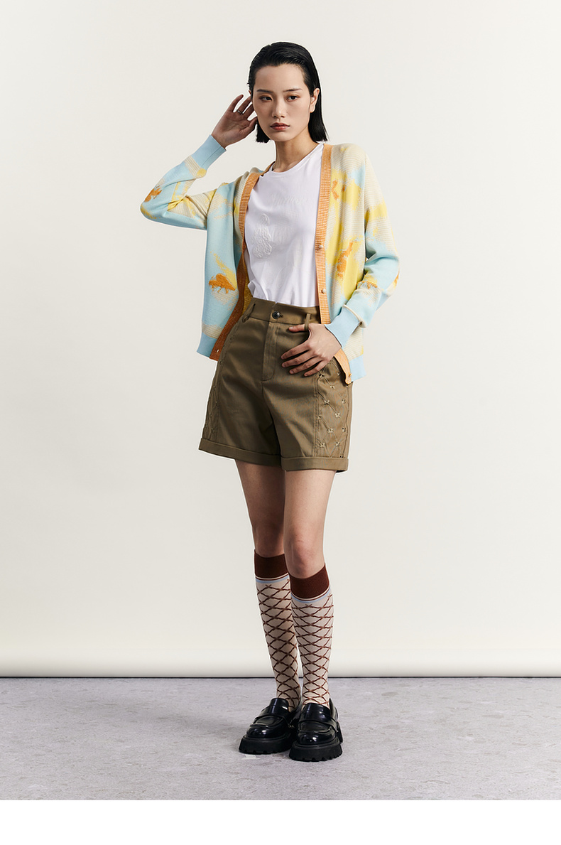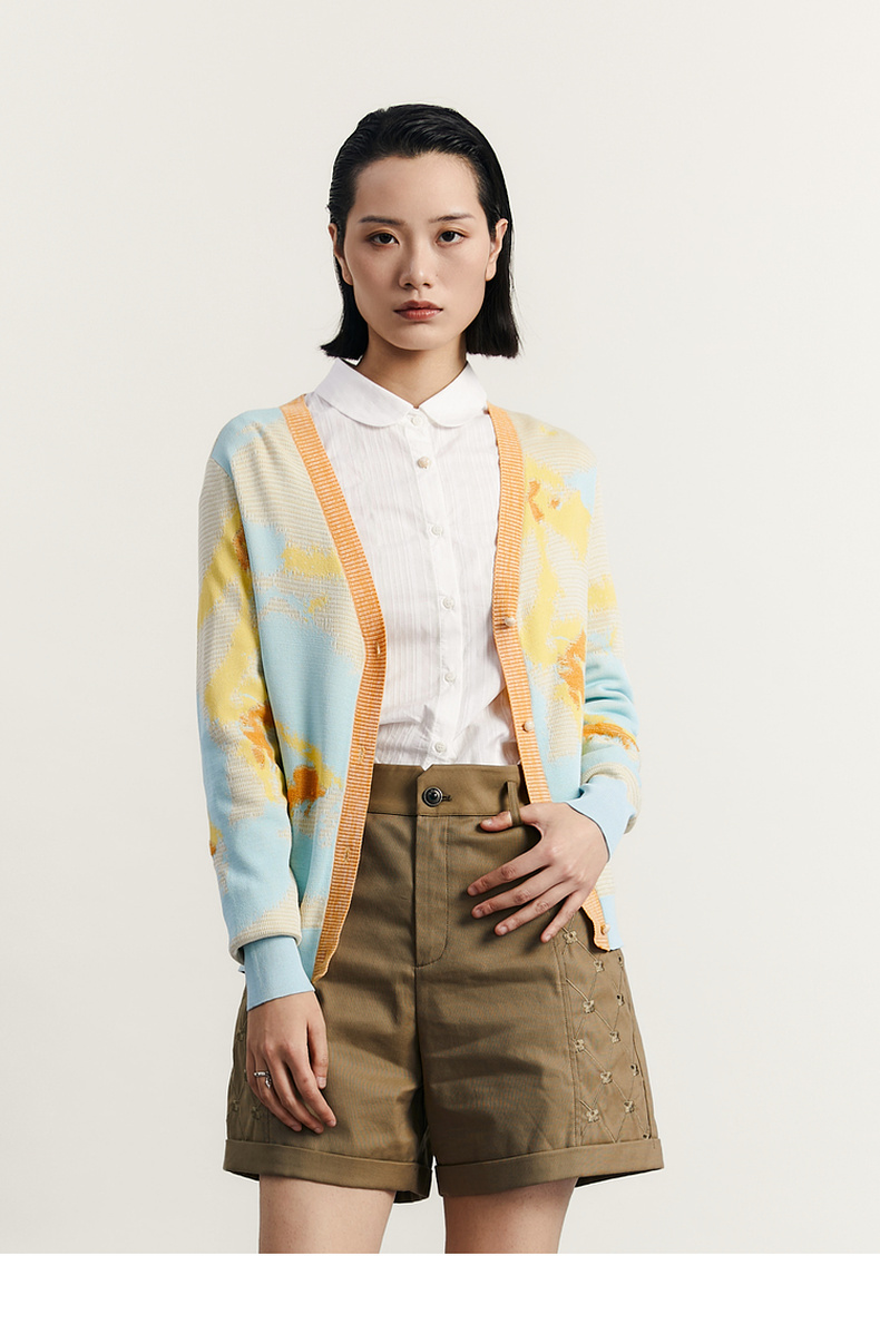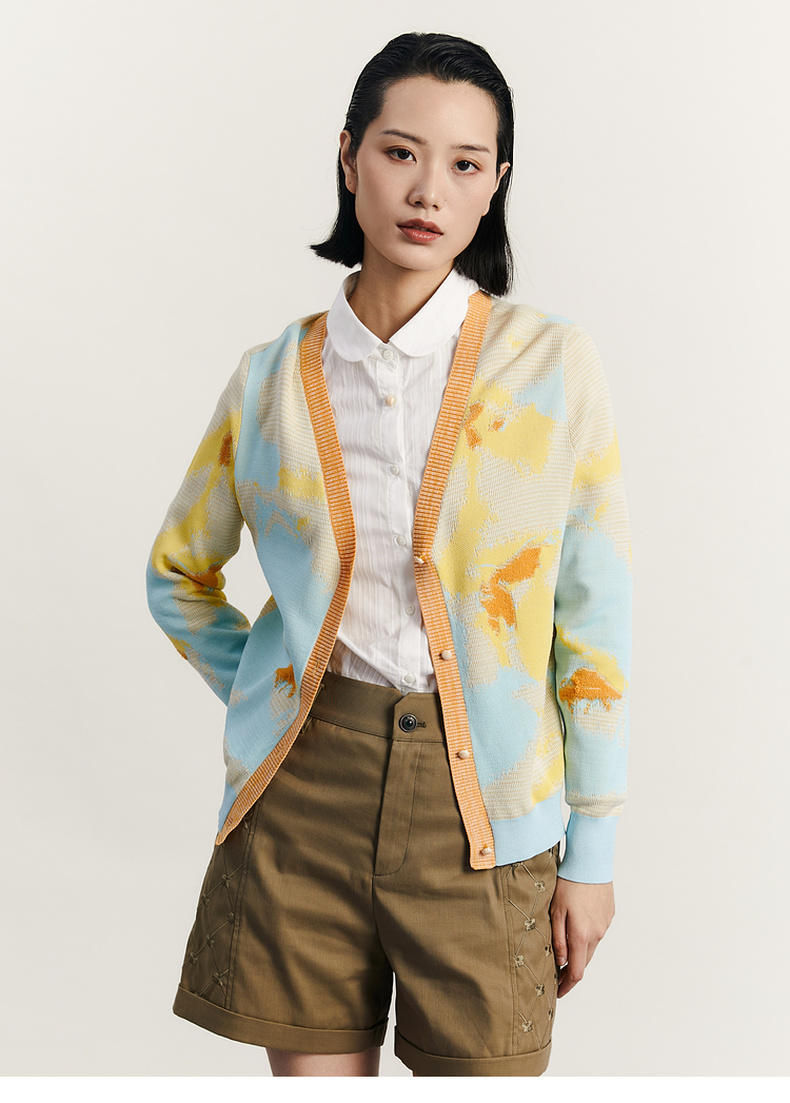 谜底V领针织开衫女2023秋新款复古文艺提花H型针织外套233MZ1291