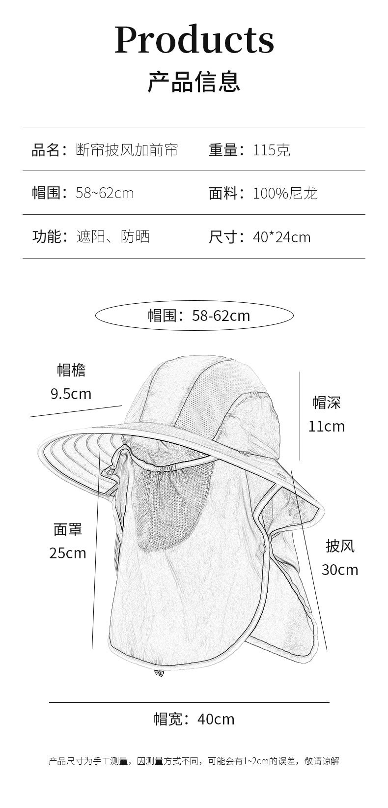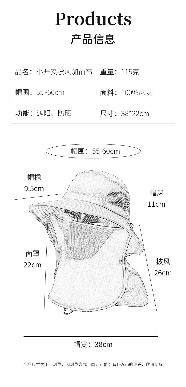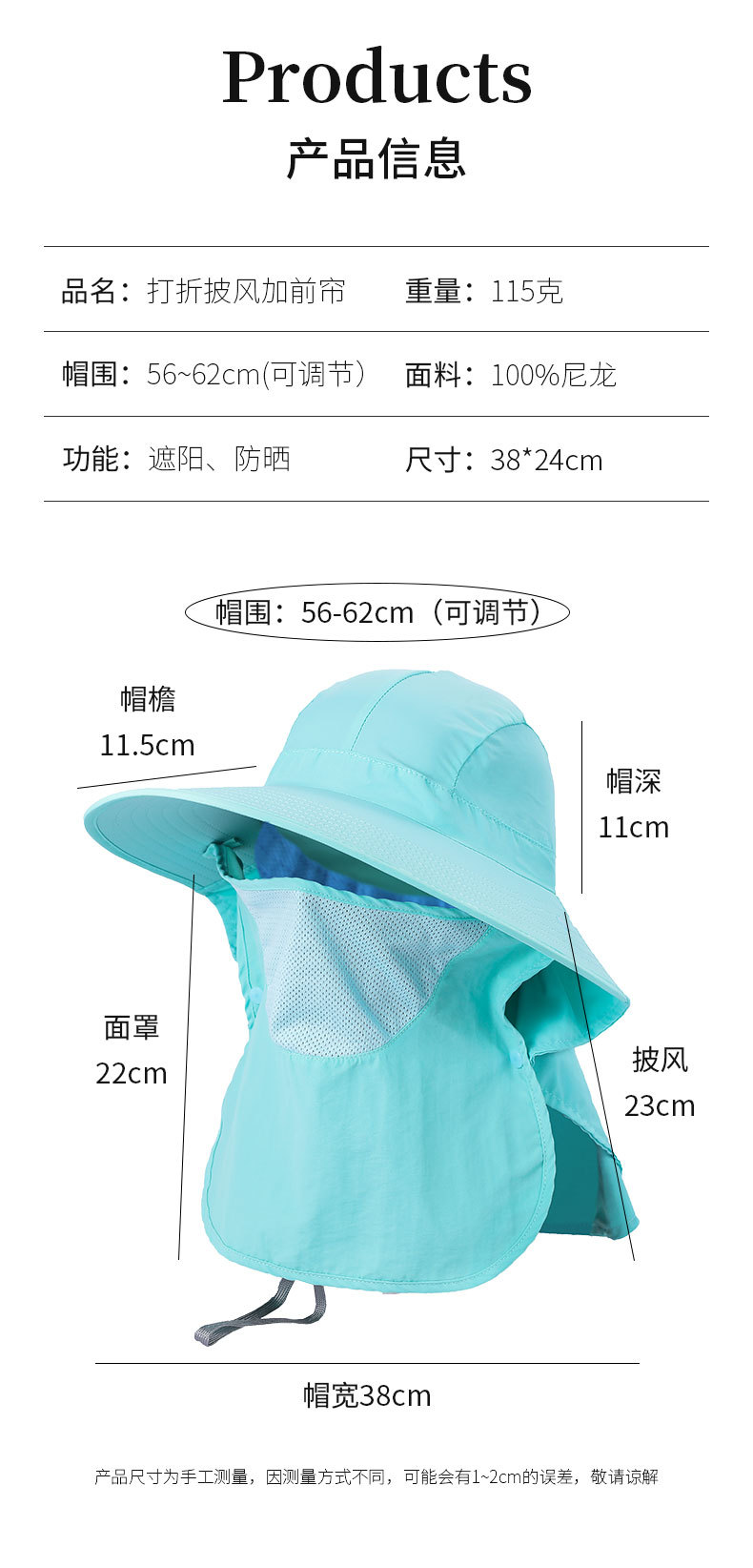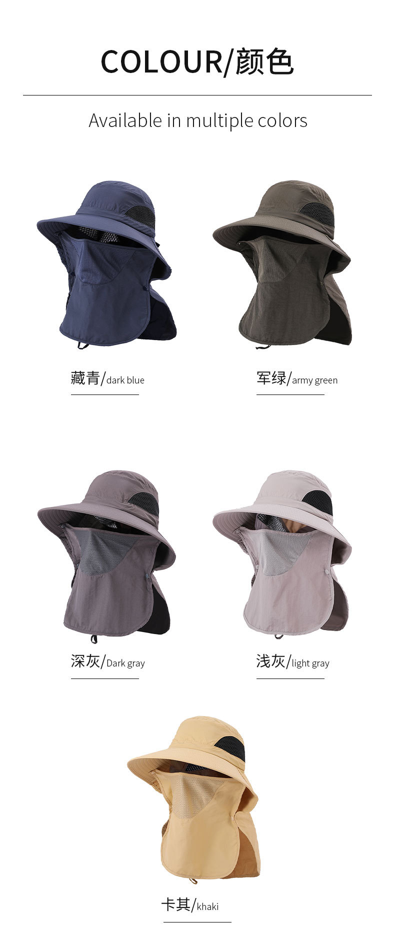 夏季防晒遮阳帽子 女士户外钓鱼速干透气渔夫帽 可拆卸大帽檐太阳帽