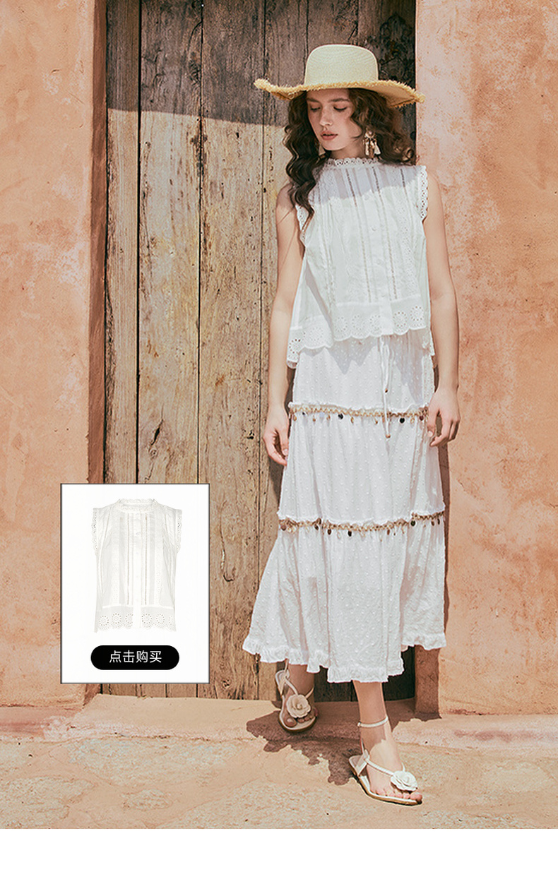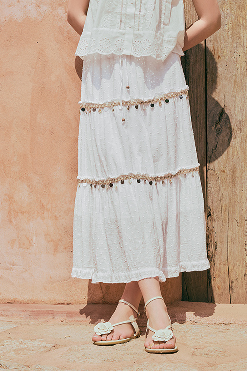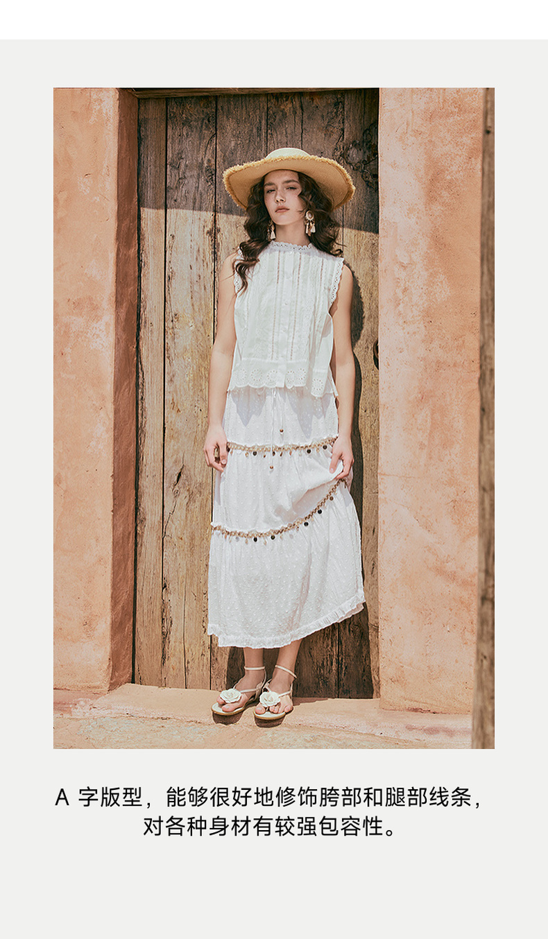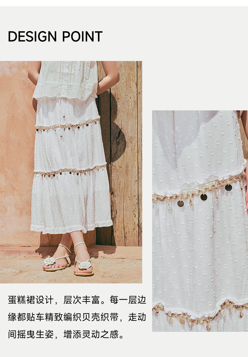 两三事 月汐翩诗 2025夏季新款度假风贝壳装饰蛋糕裙白色半身裙