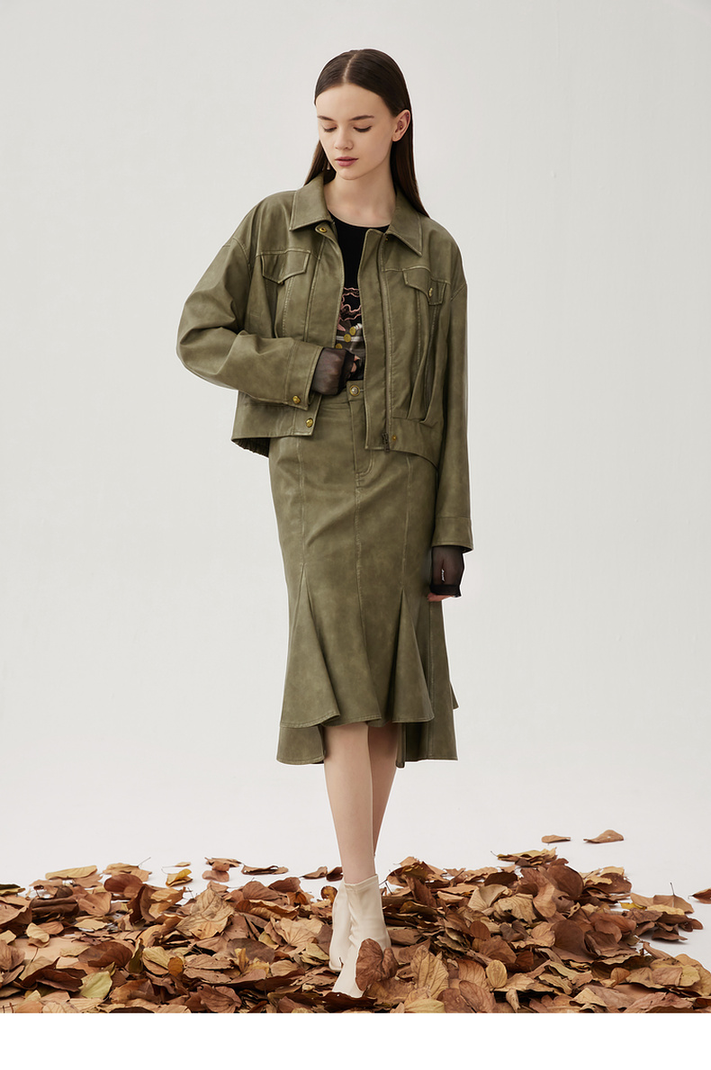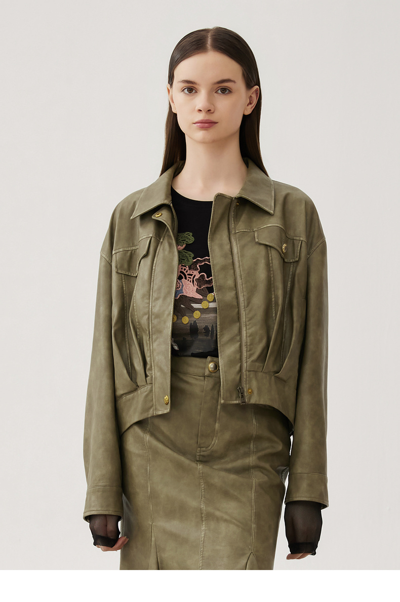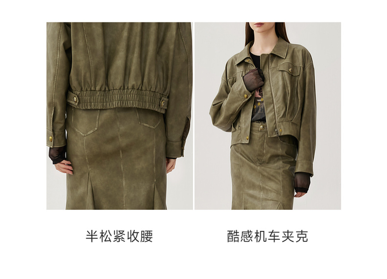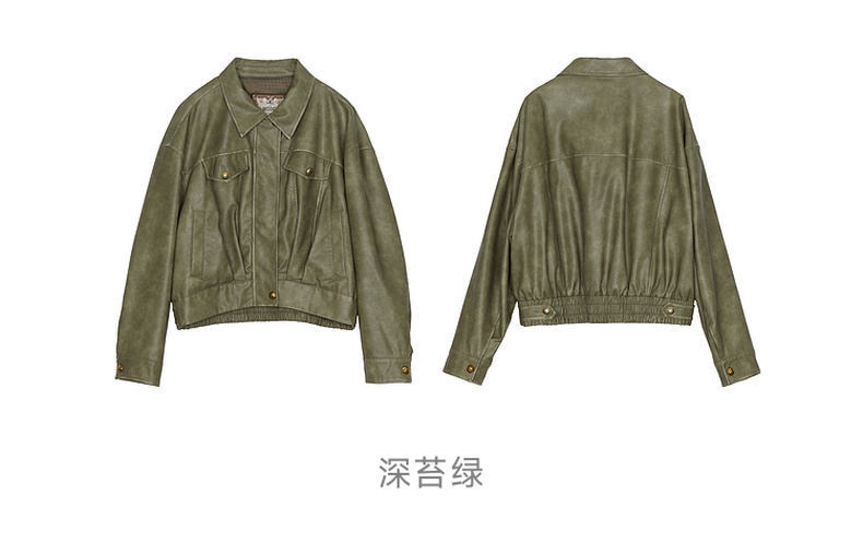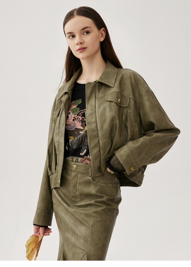 谜底皮衣女士2024秋新品率性时尚宽松翻领气质短款外套243MW1092