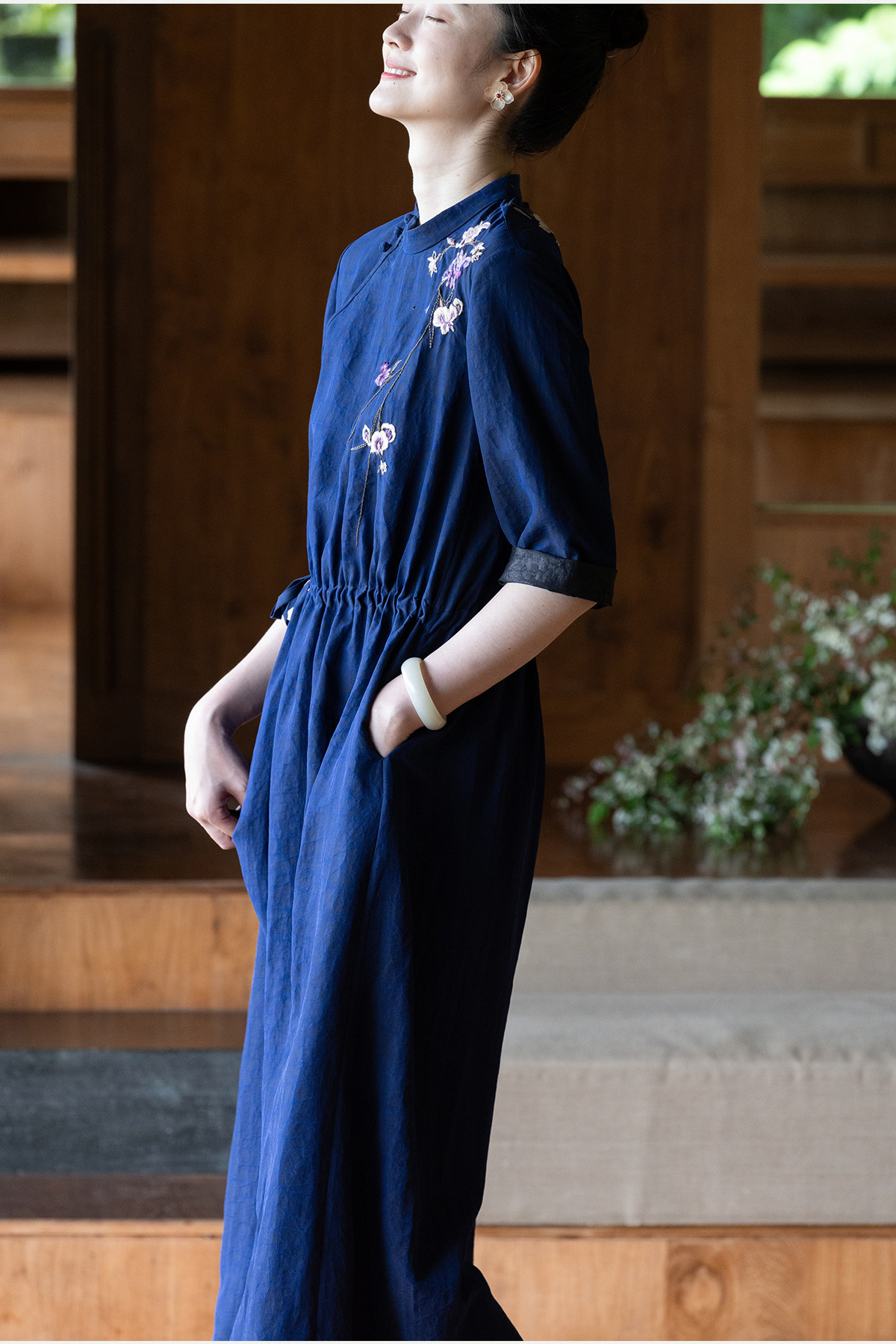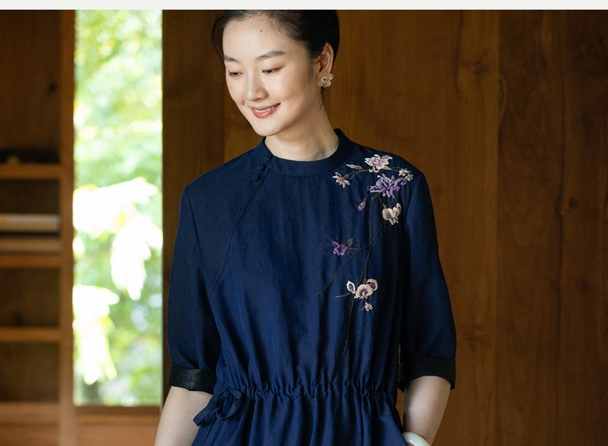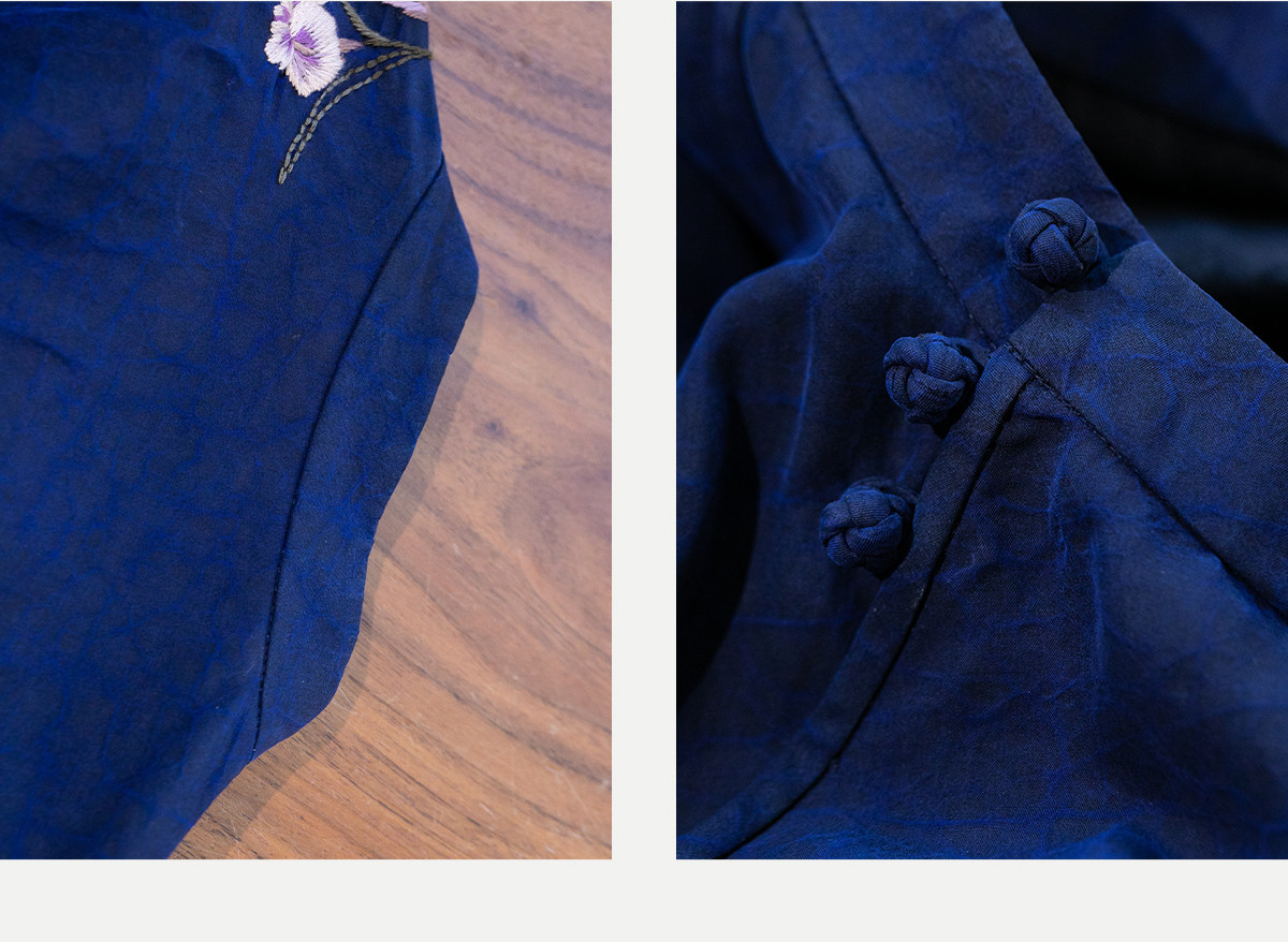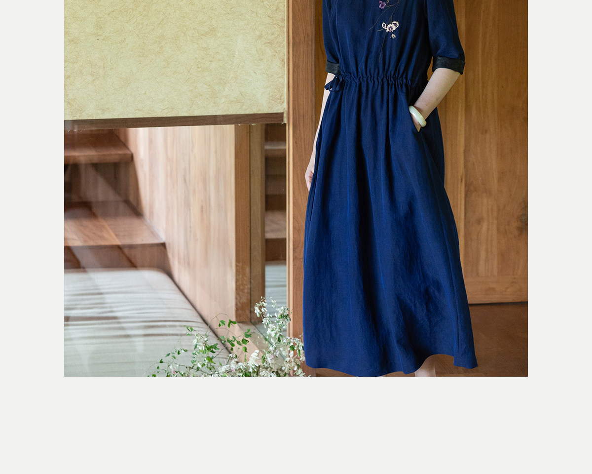 牧衣游原创 22姆米重磅手工刺绣香云纱连衣裙复古新中式长裙 蓝鸢