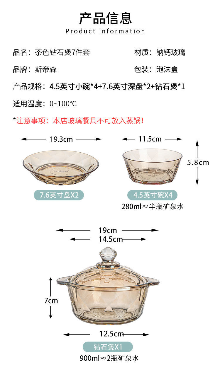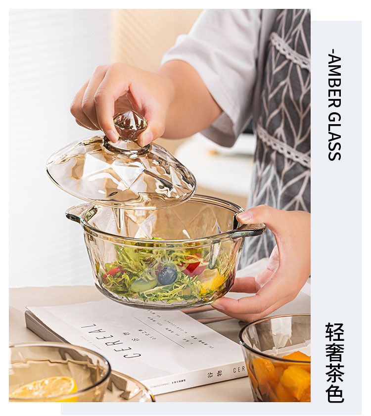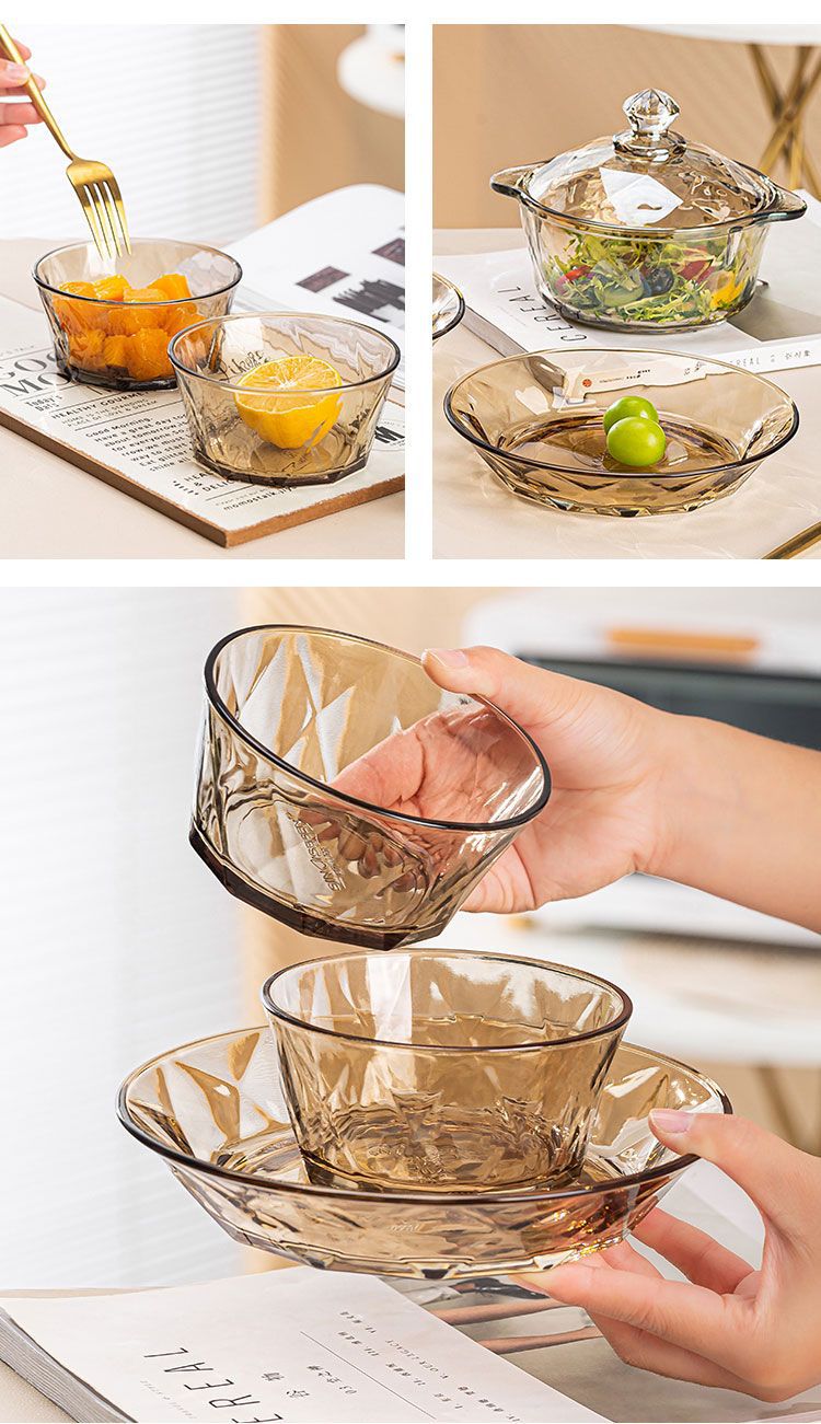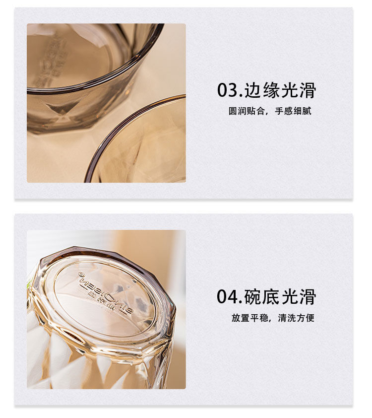 「轻奢风!4只装」硼硅耐热茶色钻石玻璃米饭碗 简约高颜值透明玻璃碗家用沙拉碗餐饮用具