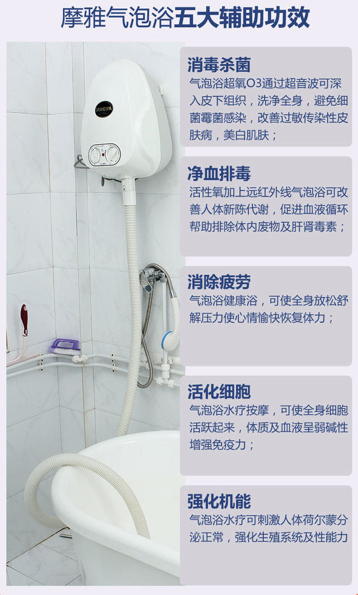 去除角质层,臭氧能消毒、杀菌、美白、每分钟100多万个气泡如同家中专业的美容师及按摩师呵护您全身肌肤,使用15分钟可消耗2-300卡热量,轻松达到全身美容、美肤、美白塑身。