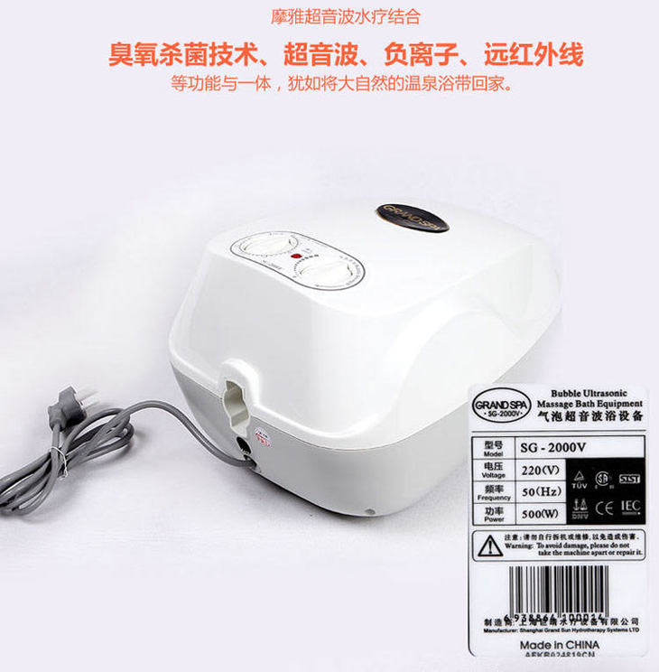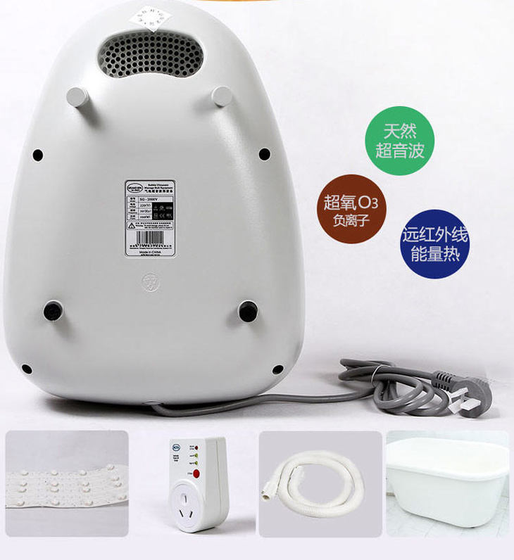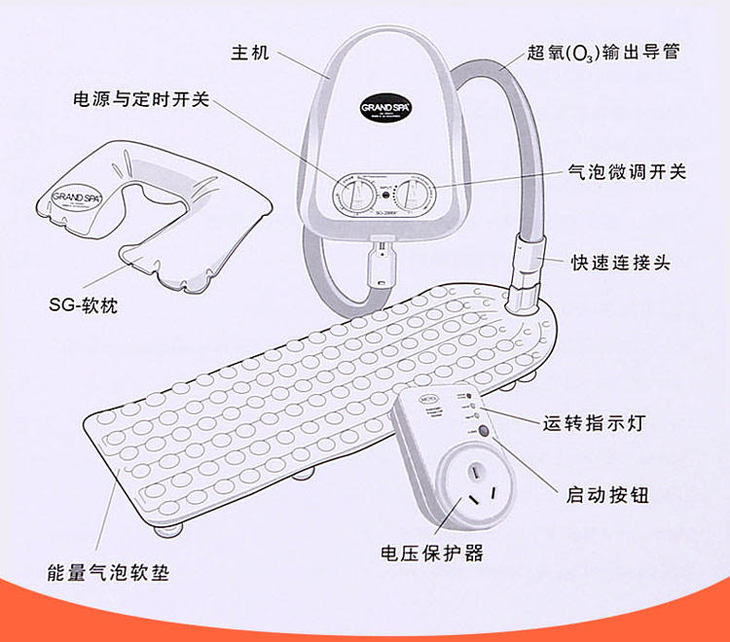 高效率的主机通过空气的压缩原理,每秒输出46公升的超氧(臭氧O3)负离子好空气,经由精密远红外线能量软垫,在水中瞬间形成上百万的气泡,气泡的相互撞击破裂会产生8~10万赫兹的微震荡,从而产生天然超音波,可作用于人体1.5公斤的均匀按摩,能彻底温热肌肉,筋骨,关节等深层组织,快速透热身体,快速细胞膜的扩散作用,使人体血管扩张,促进血液循环和新陈代谢。