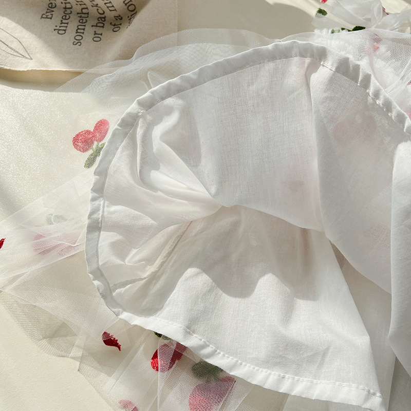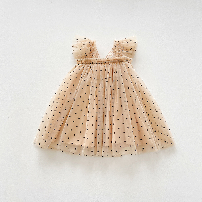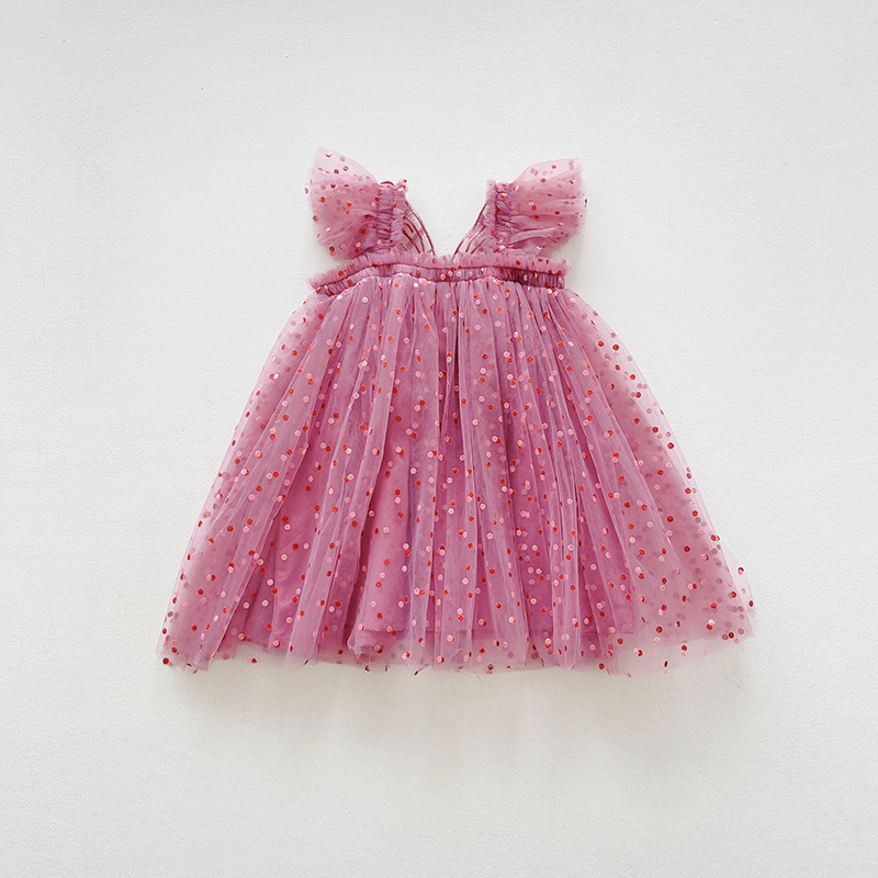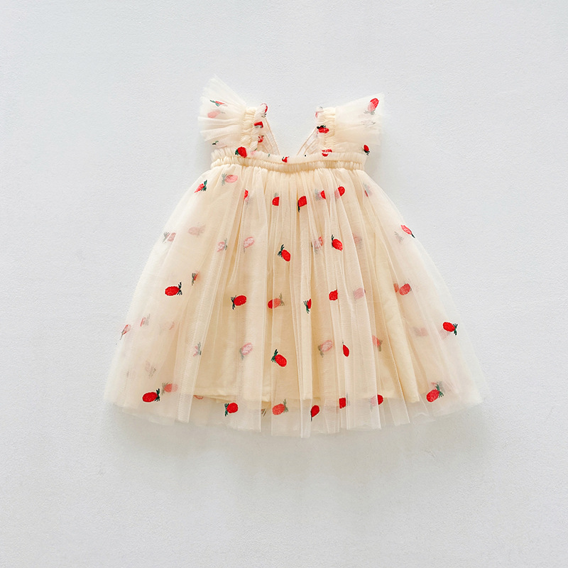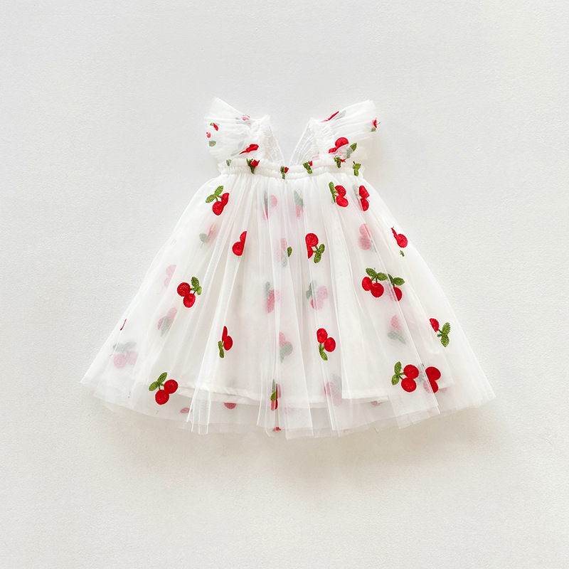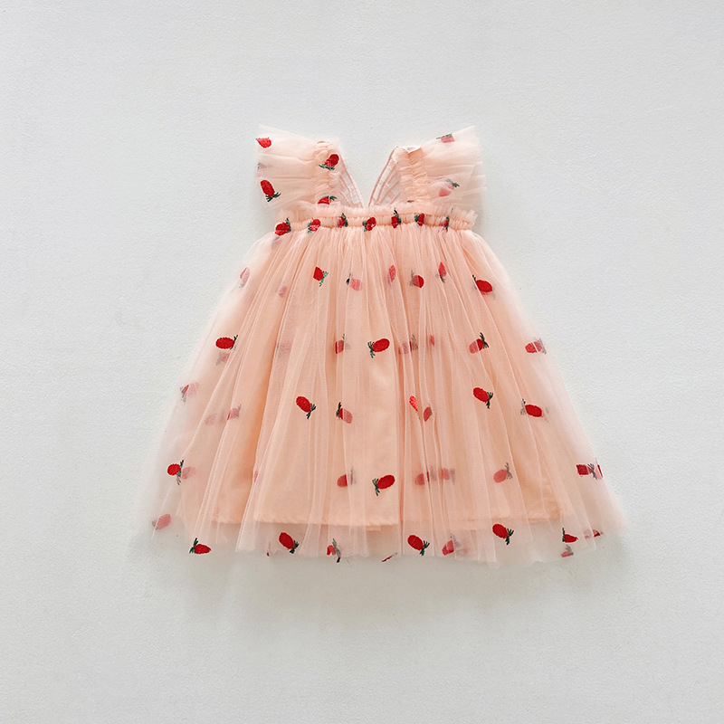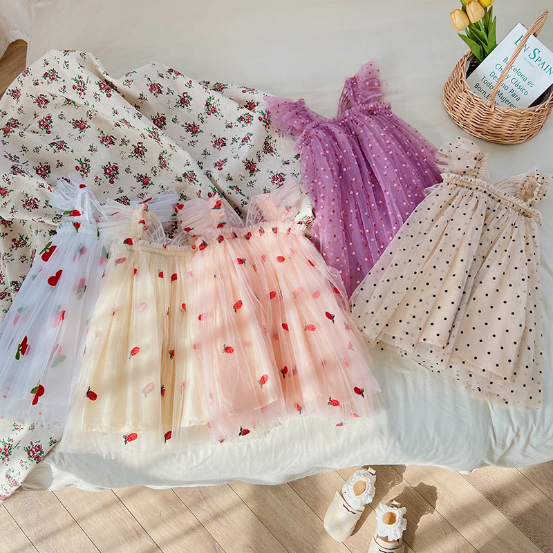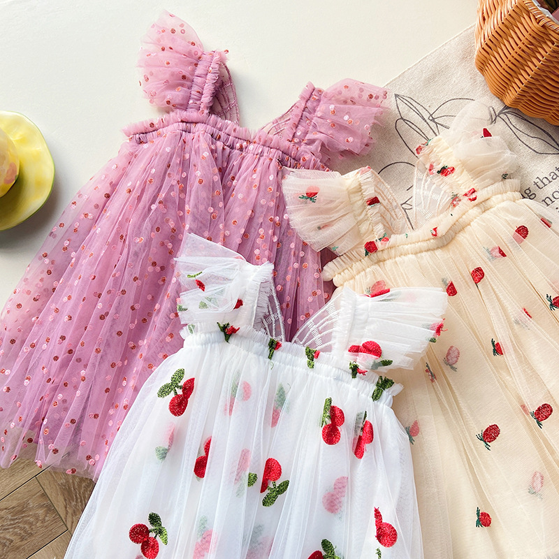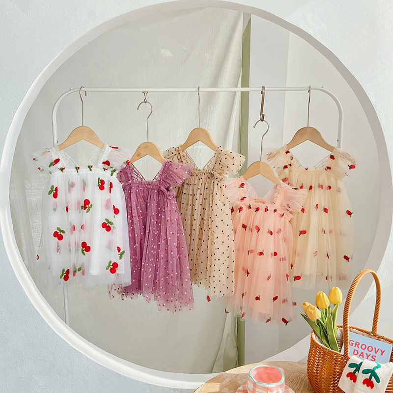 【水果刺绣+印花波点网纱群】细腻柔软网纱不会扎皮肤,飞袖设计更清凉,韩版飞袖立体翅膀女童连衣裙2023夏款波点女宝宝网纱裙蓬蓬公主裙-SH