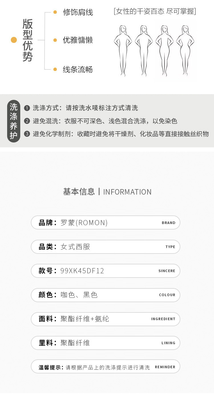 面料:95.8%聚酯纤维4.2%氨纶 (含胶:粘合衬除外) 里料:100%聚酯纤维