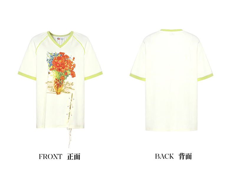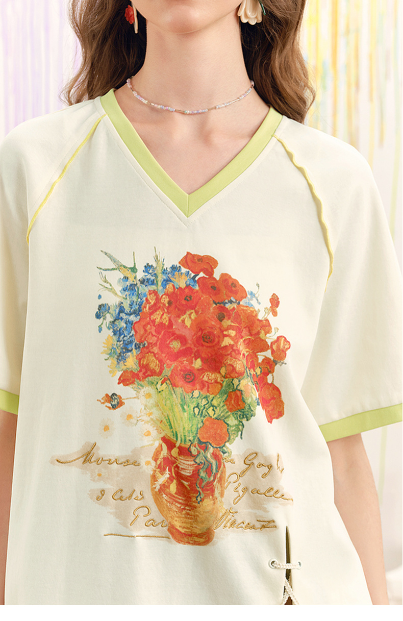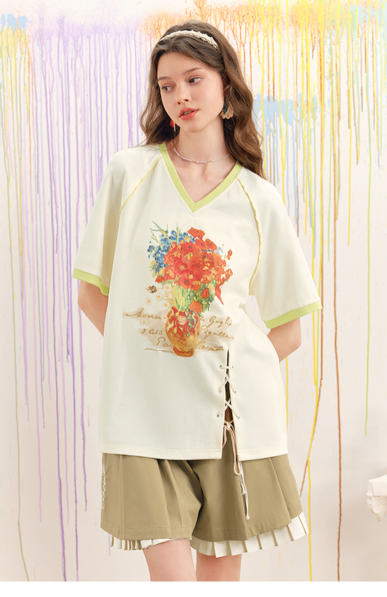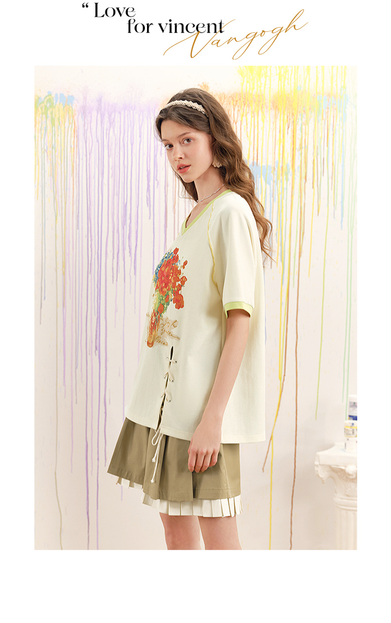 两三事梵高文艺暖光盛绽2025春新款拼色v领绑带刺绣印花t恤女宽松S25CT343