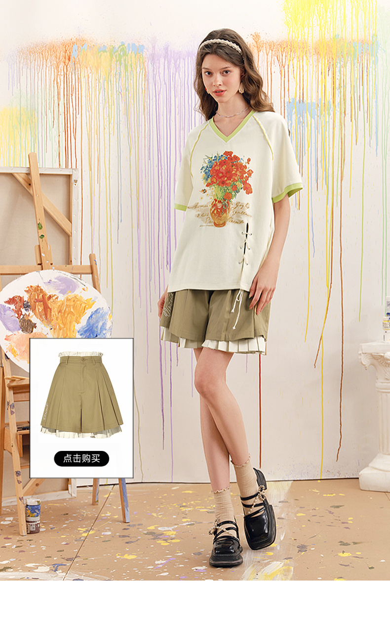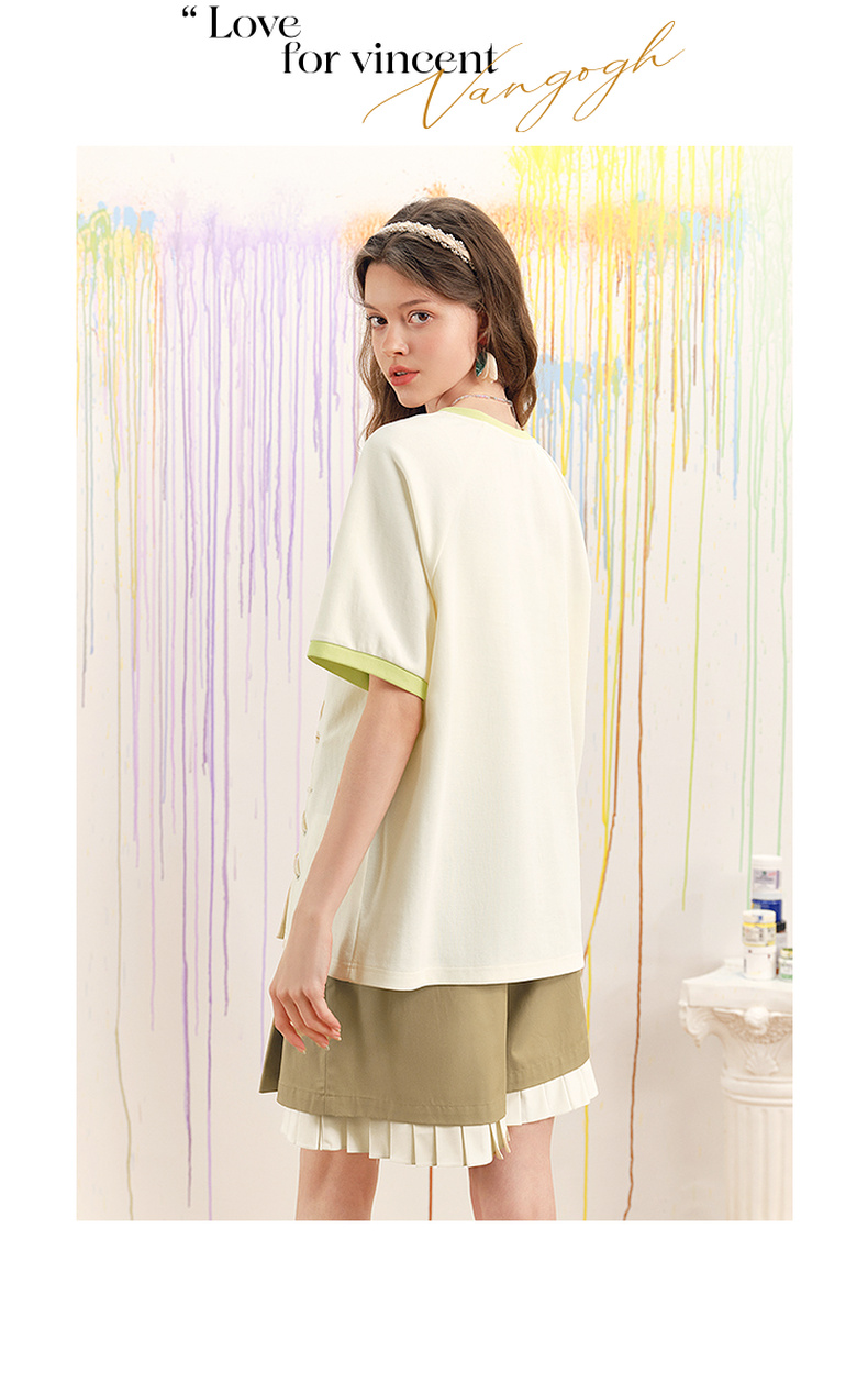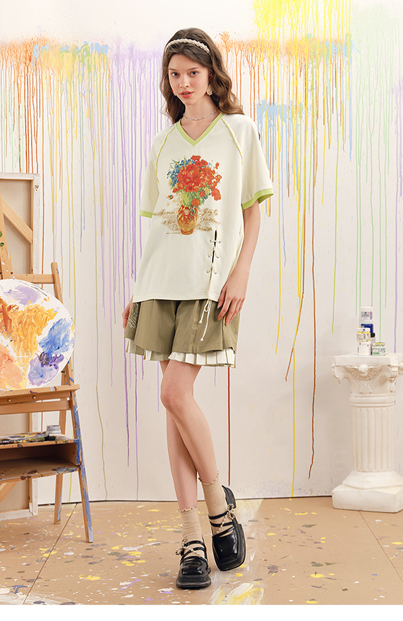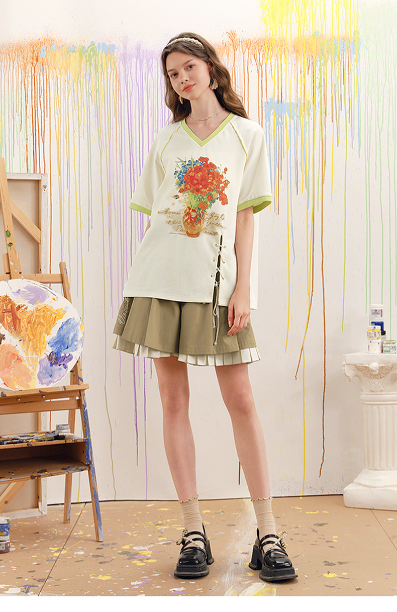 两三事梵高文艺暖光盛绽2025春新款拼色v领绑带刺绣印花t恤女宽松S25CT343