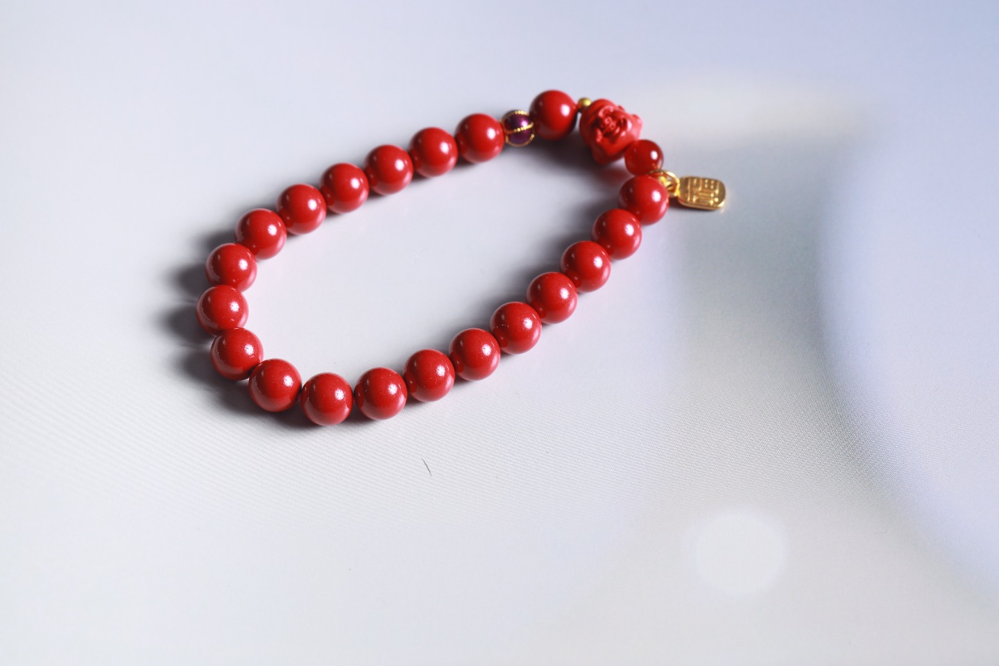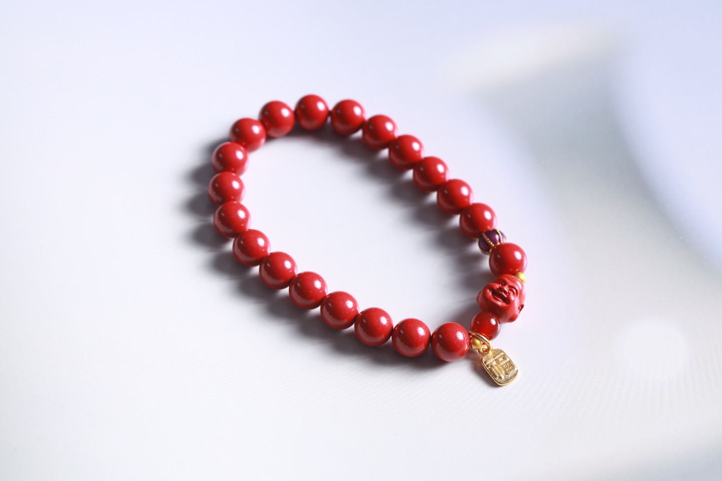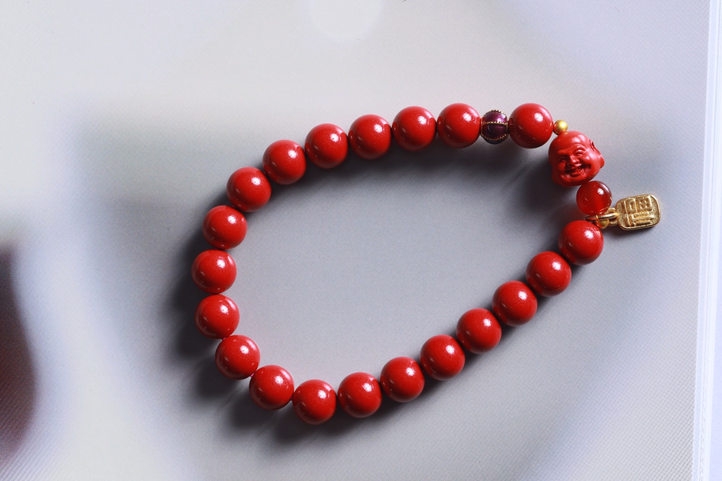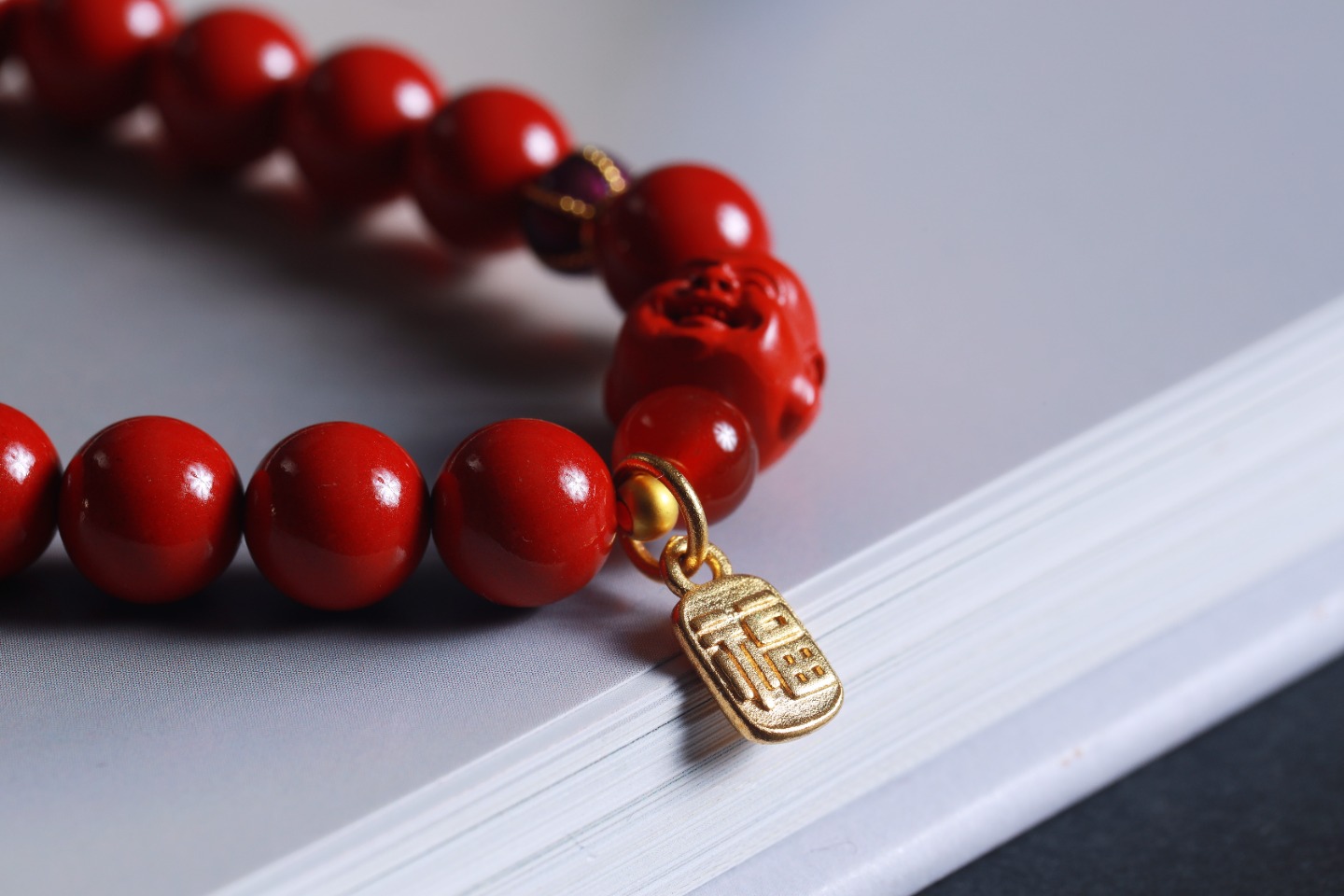 | 配件 | 红玛瑙,铜珠,沙金圆角福字小吊牌,朱砂小弥佛,沙金紫色灯笼珠 |