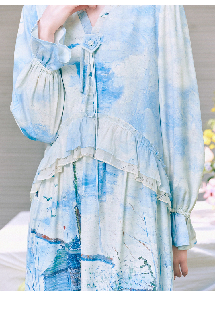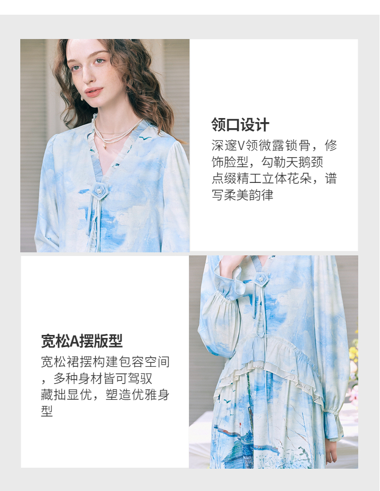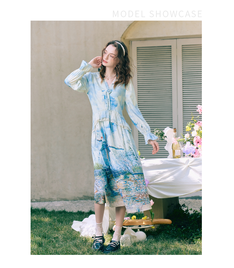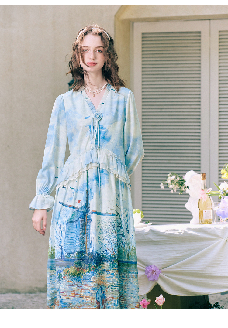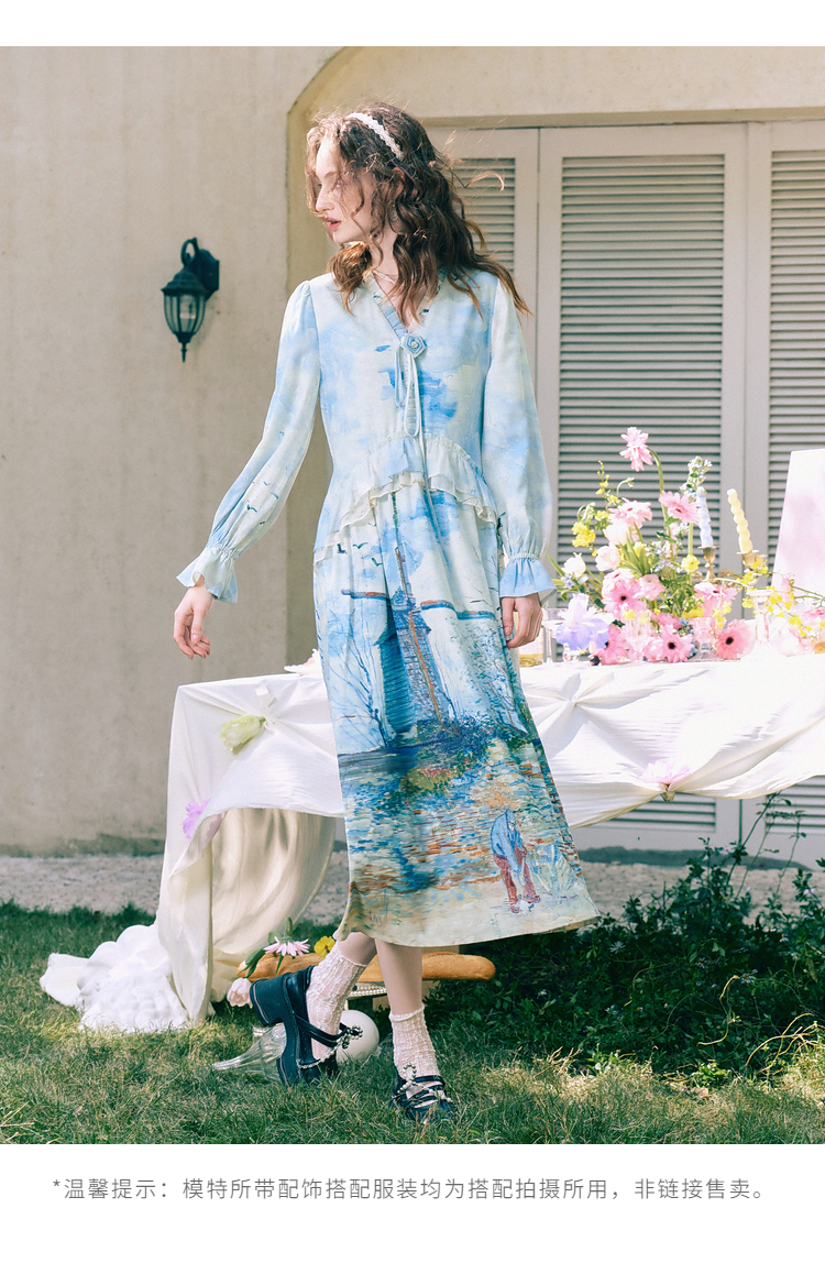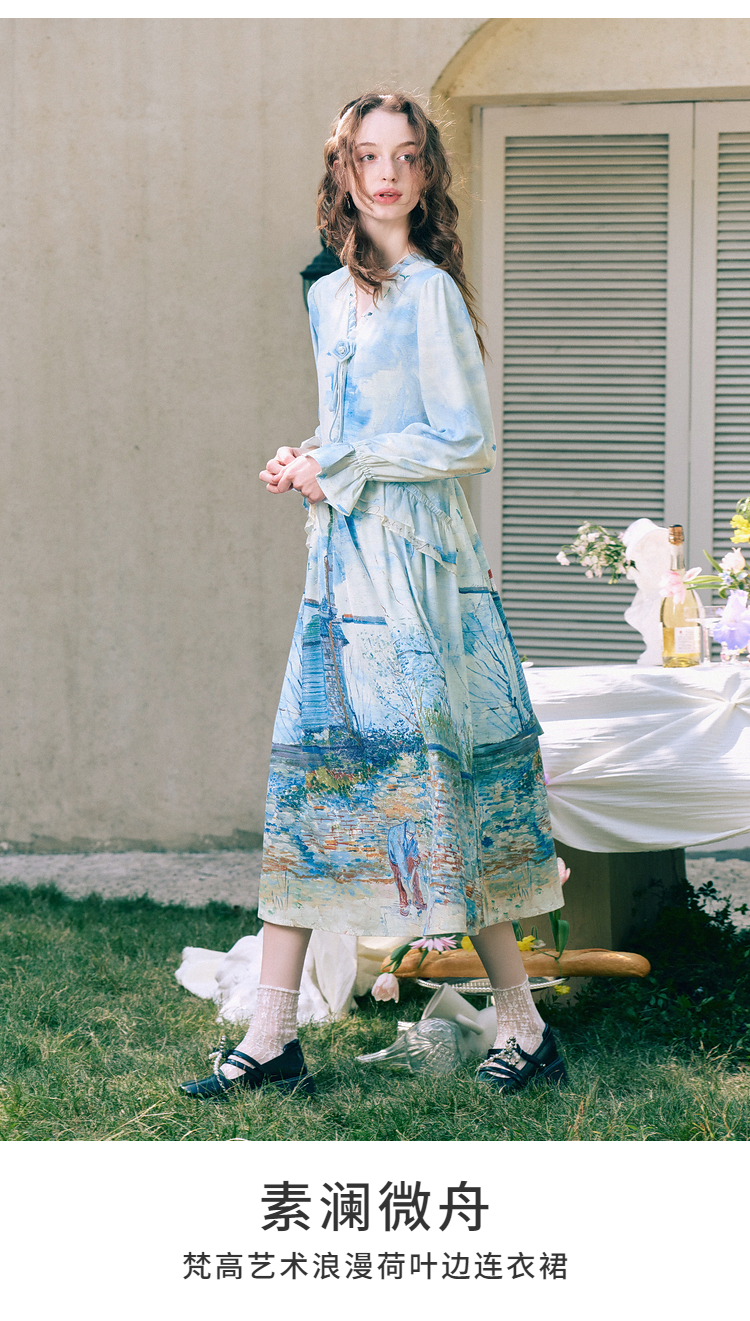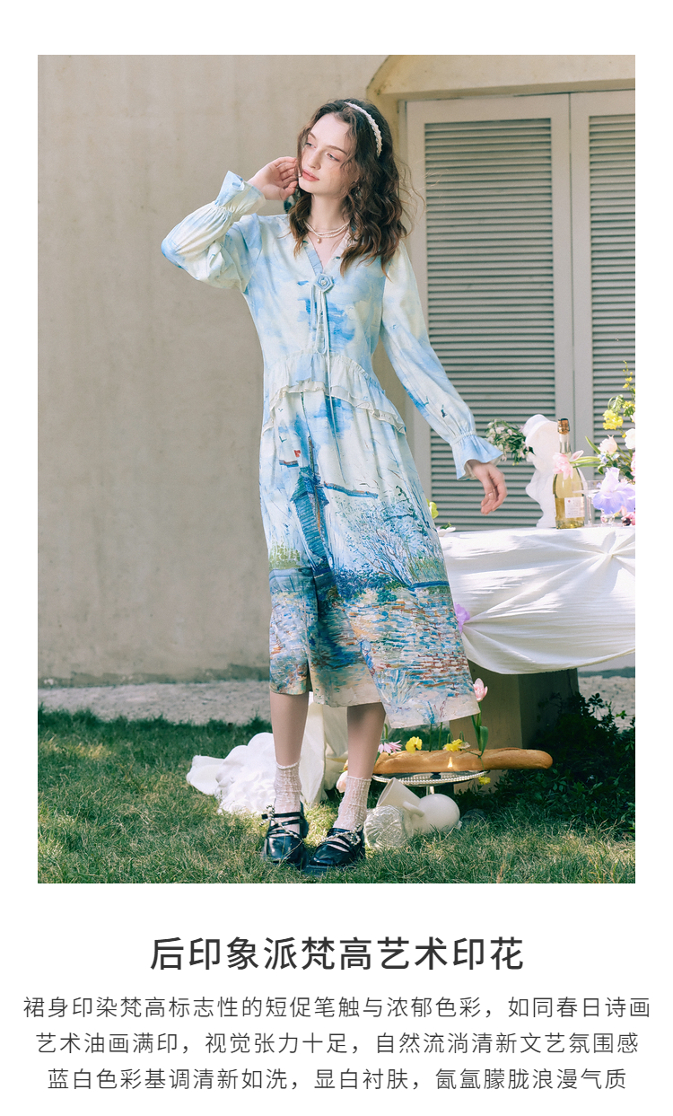 两三事梵高文艺素澜微舟2026春季新款立体花绑带v领印花连衣裙