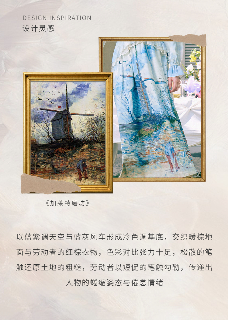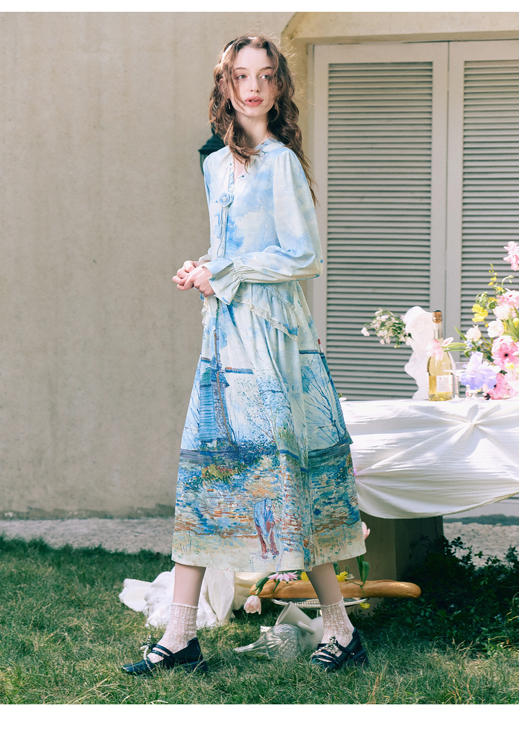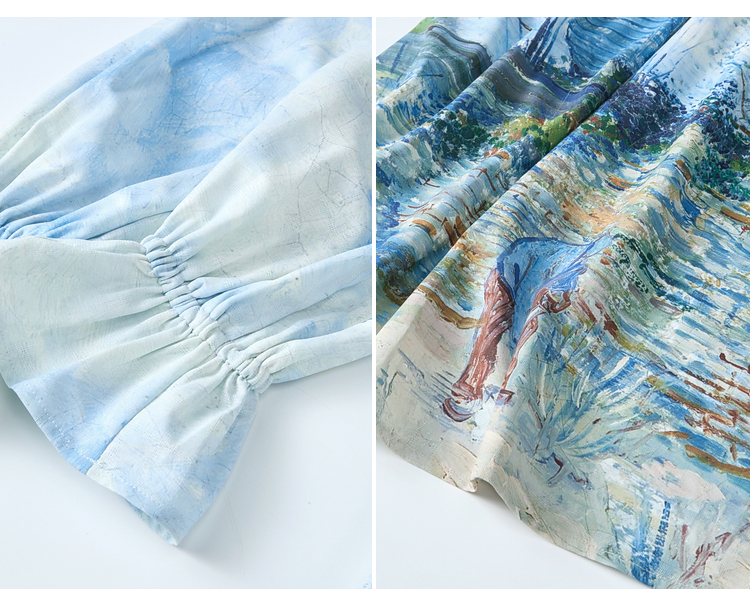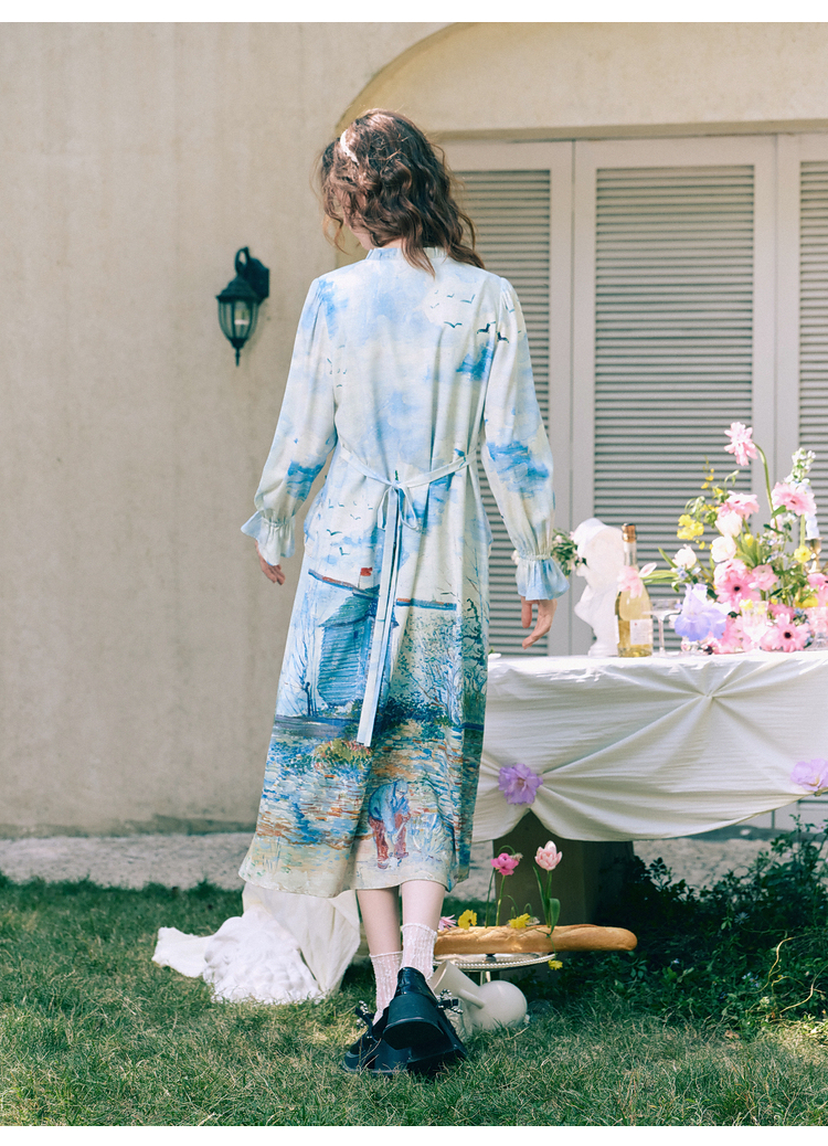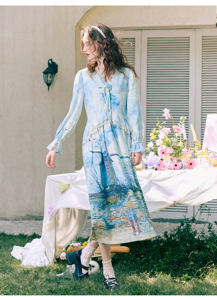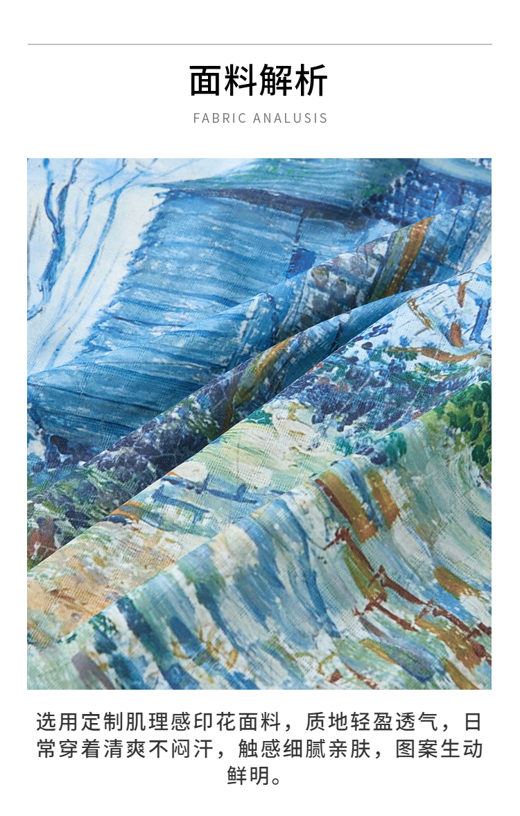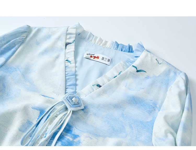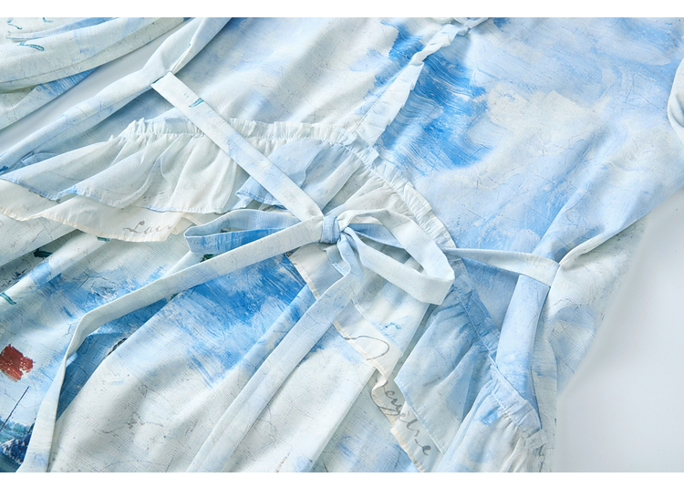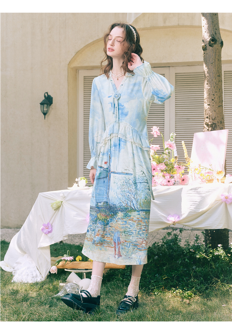 两三事梵高文艺素澜微舟2026春季新款立体花绑带v领印花连衣裙