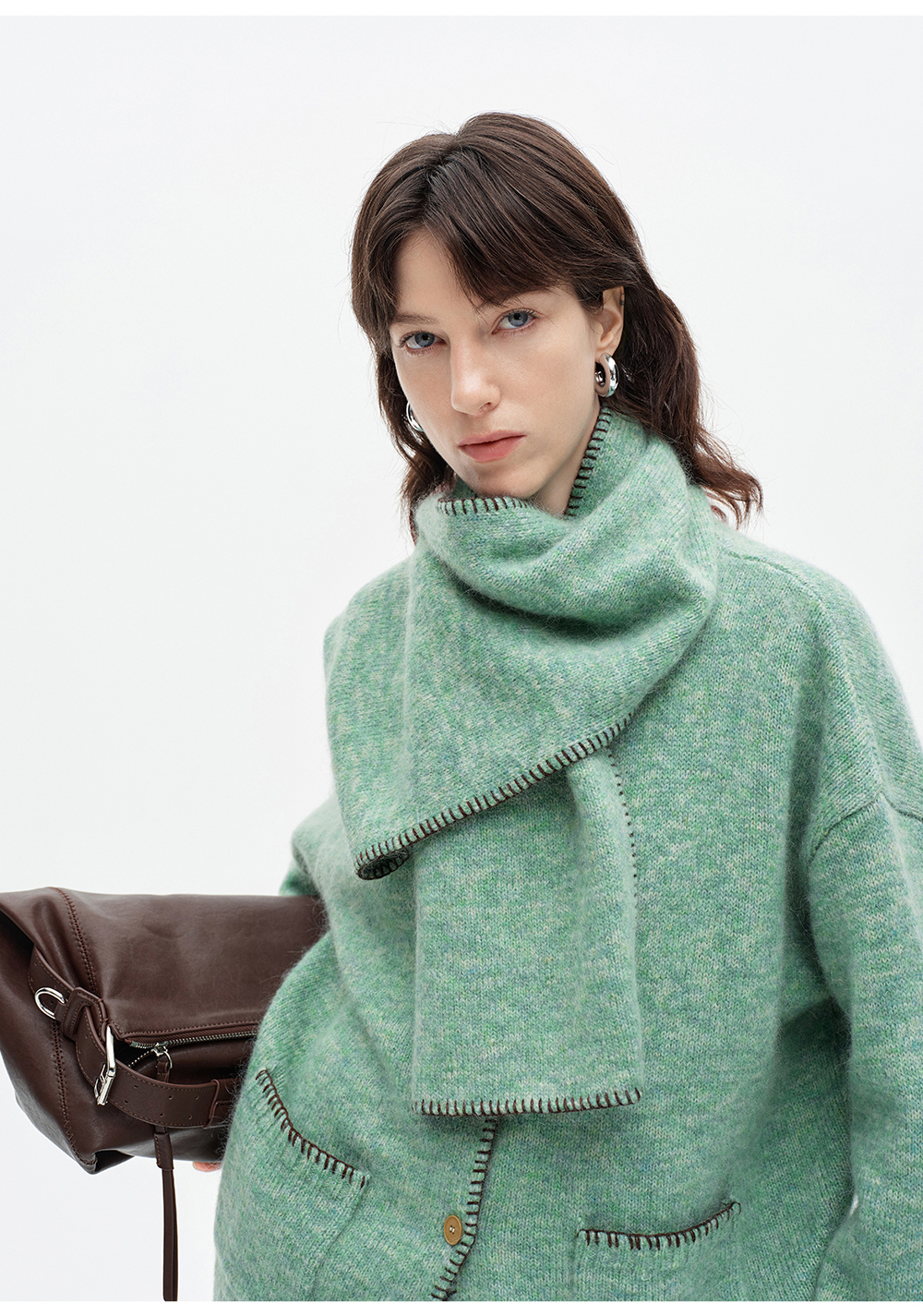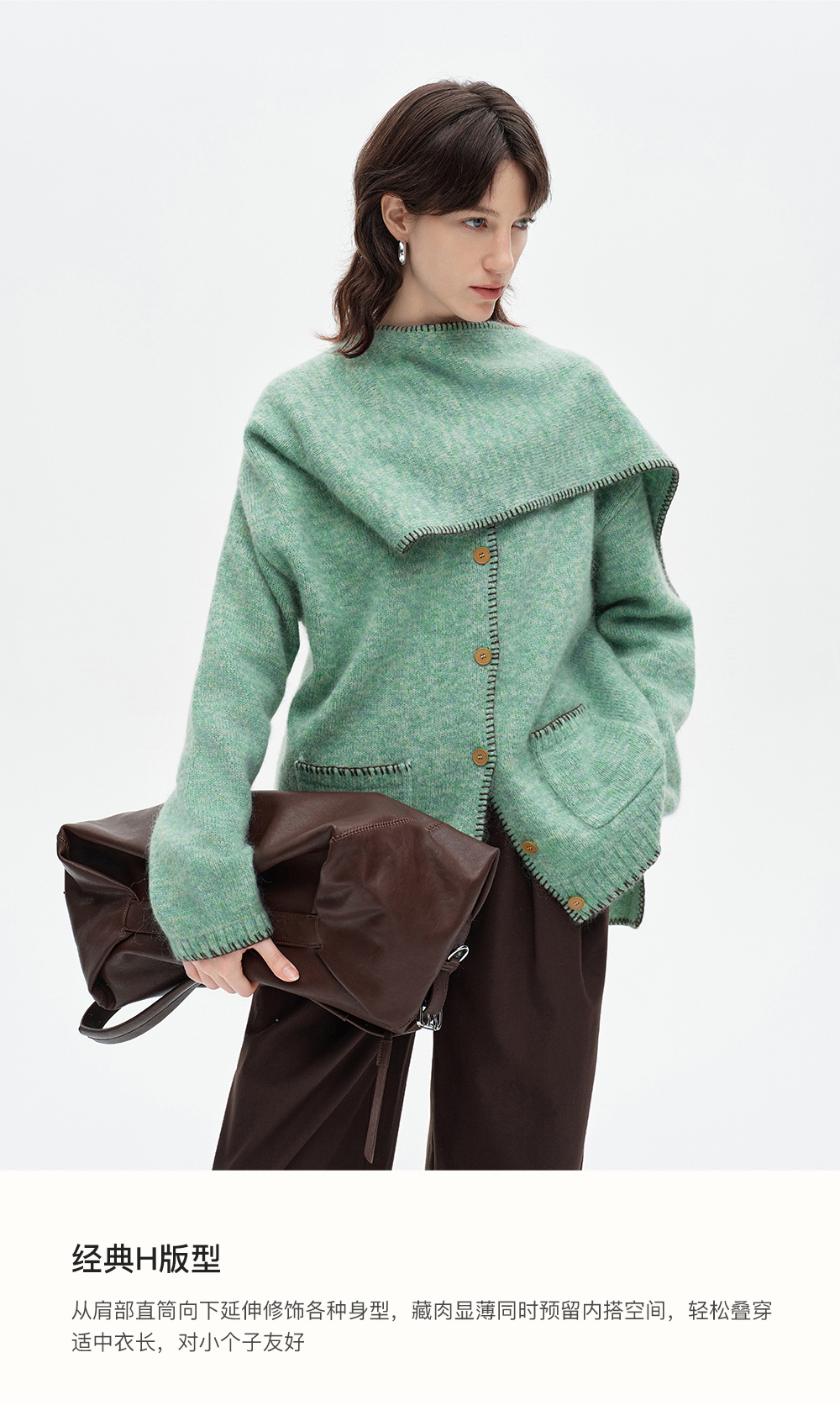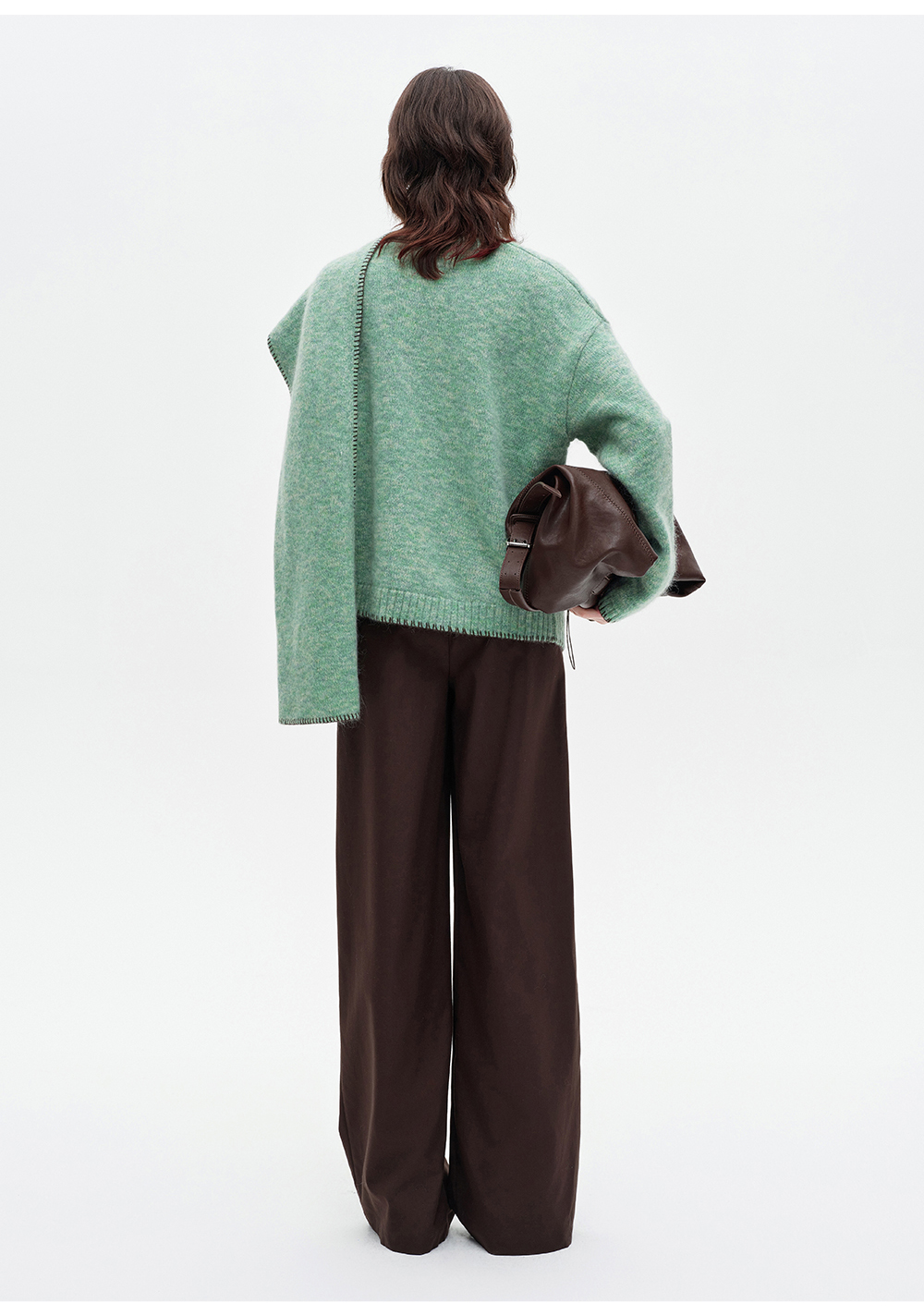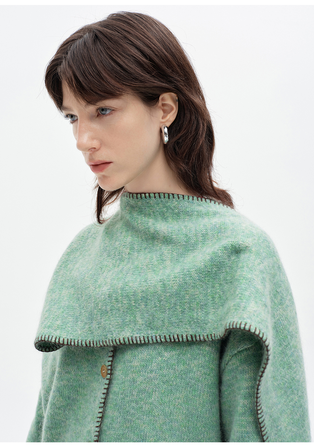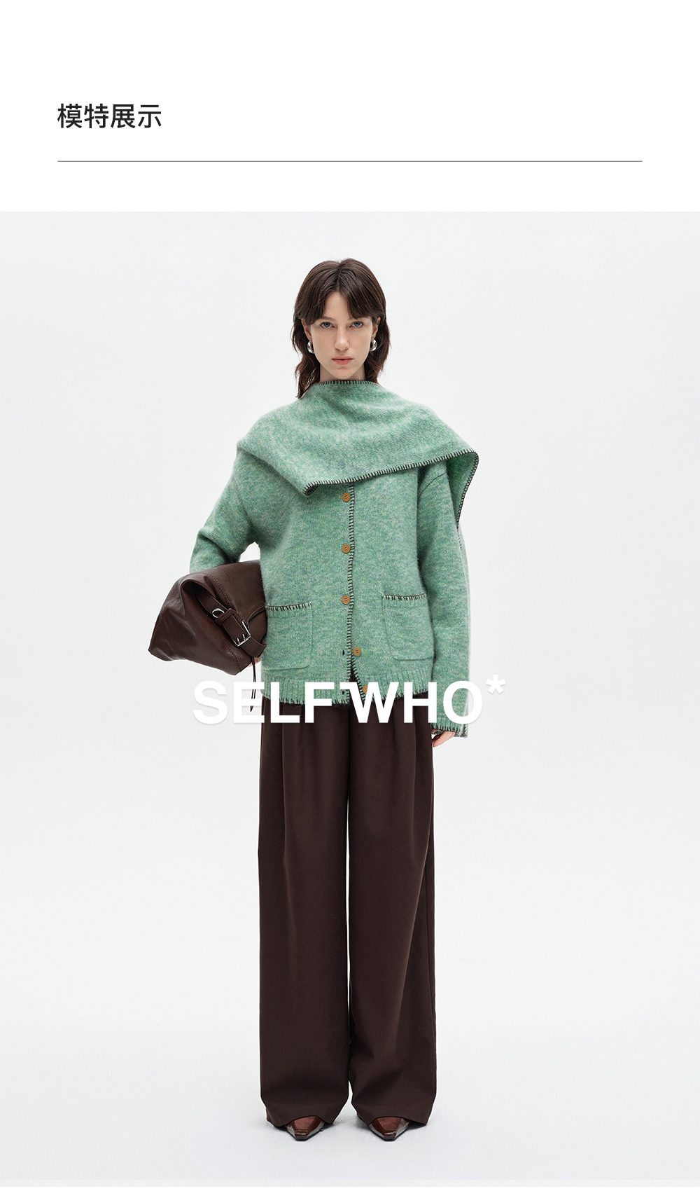 SELFWHO绵羊毛混纺撞色绣花边围巾领毛衣女2025冬季新款H型针织衫