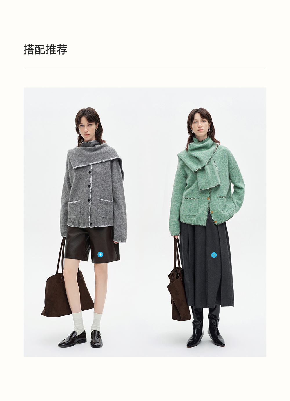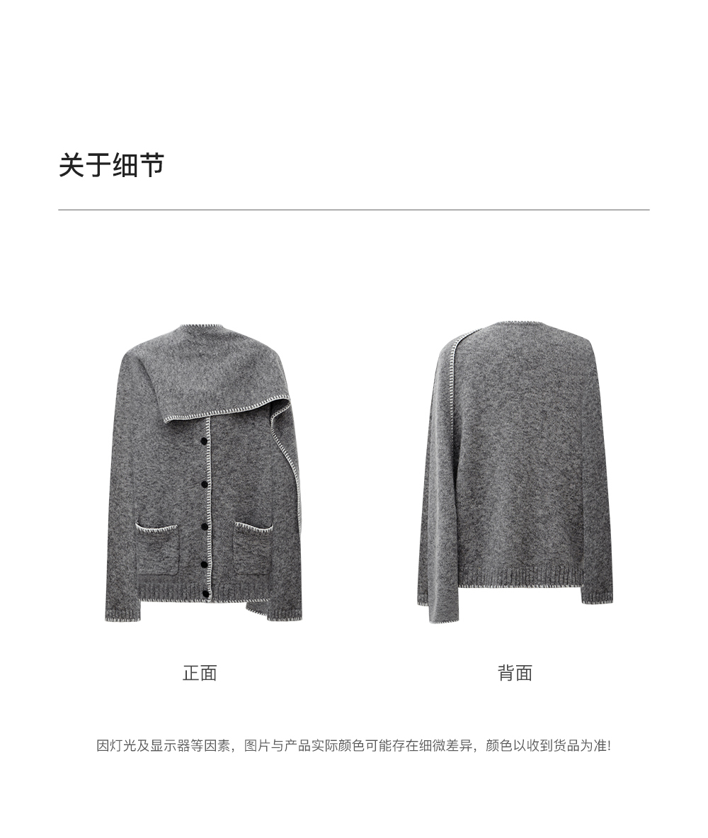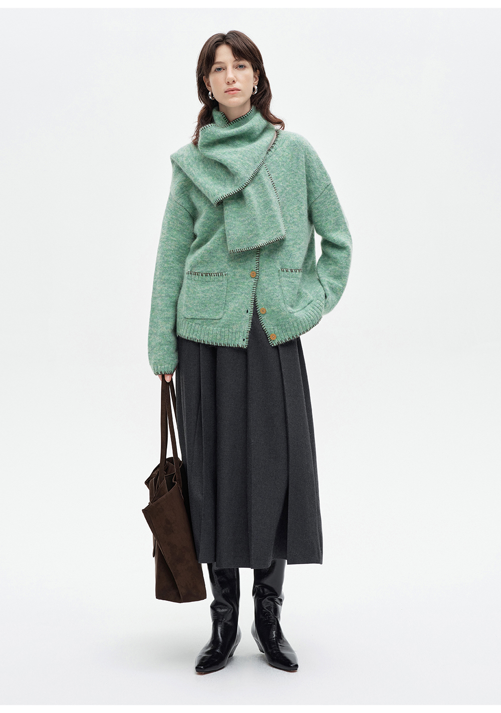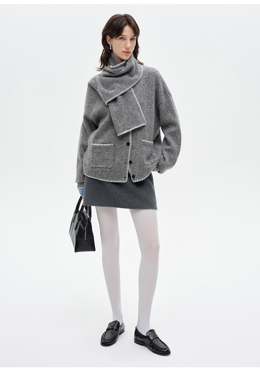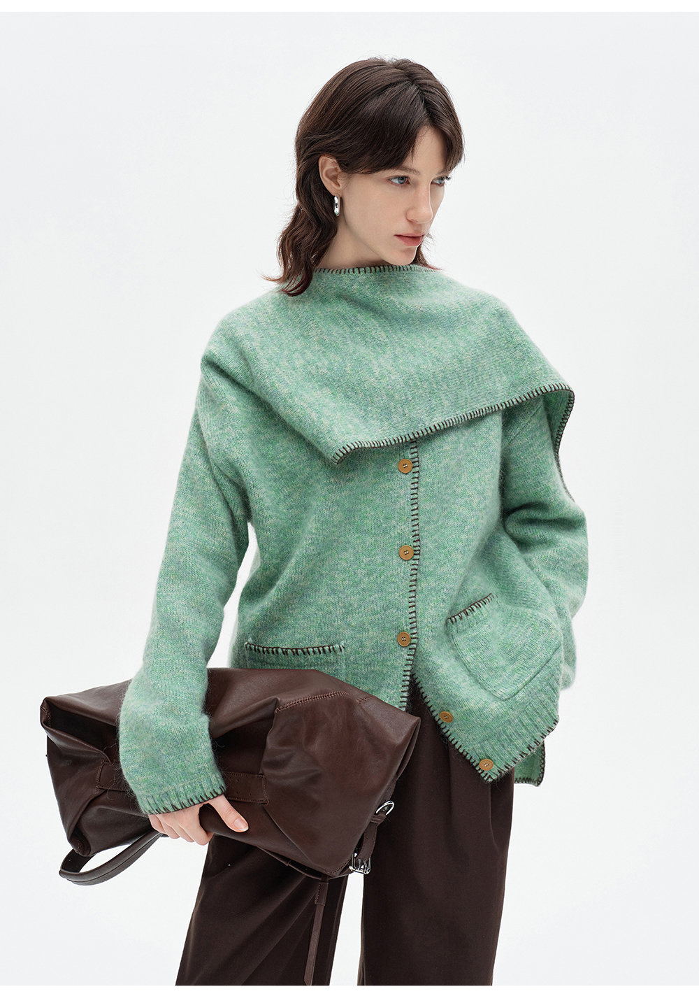 SELFWHO绵羊毛混纺撞色绣花边围巾领毛衣女2025冬季新款H型针织衫