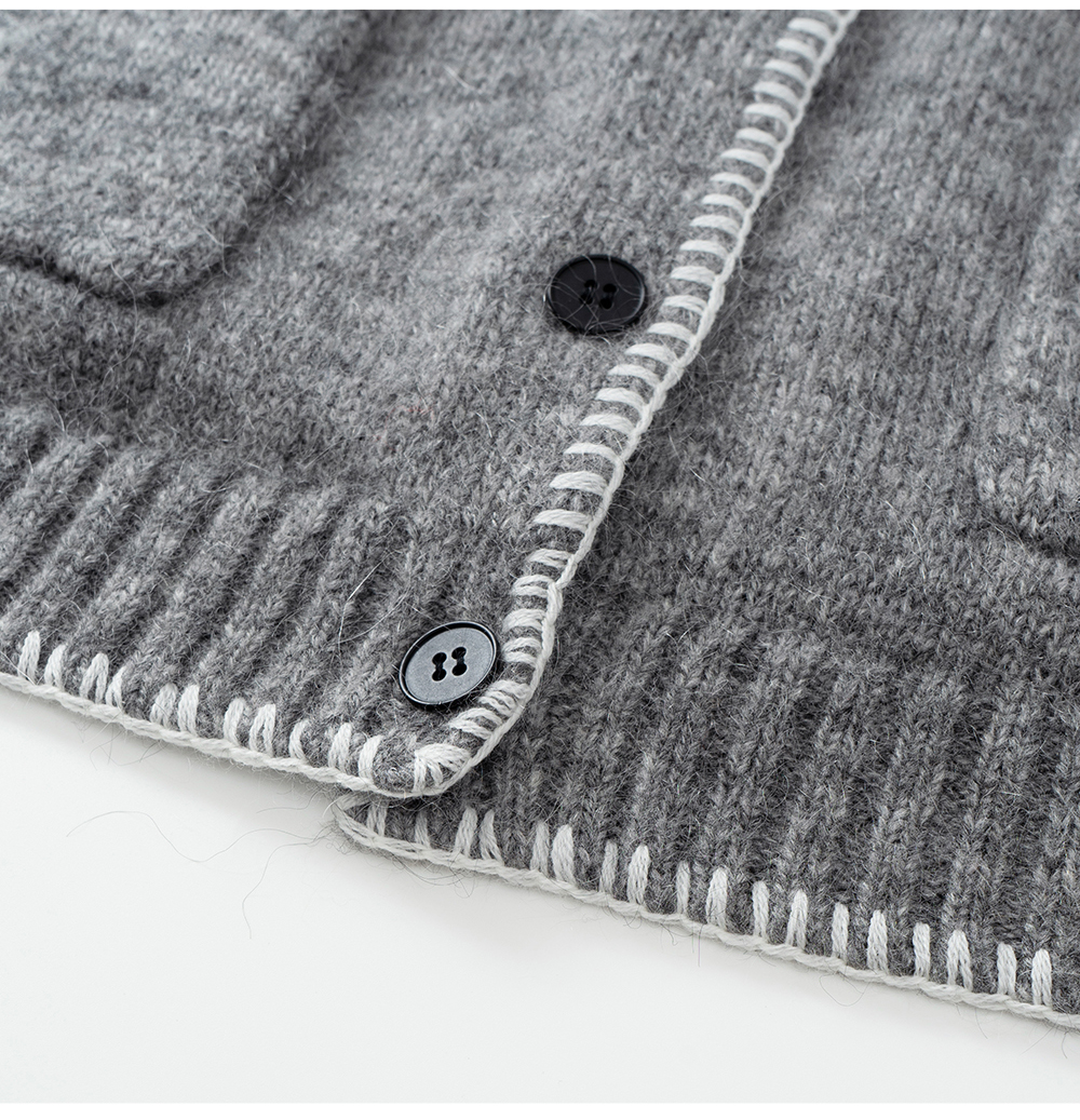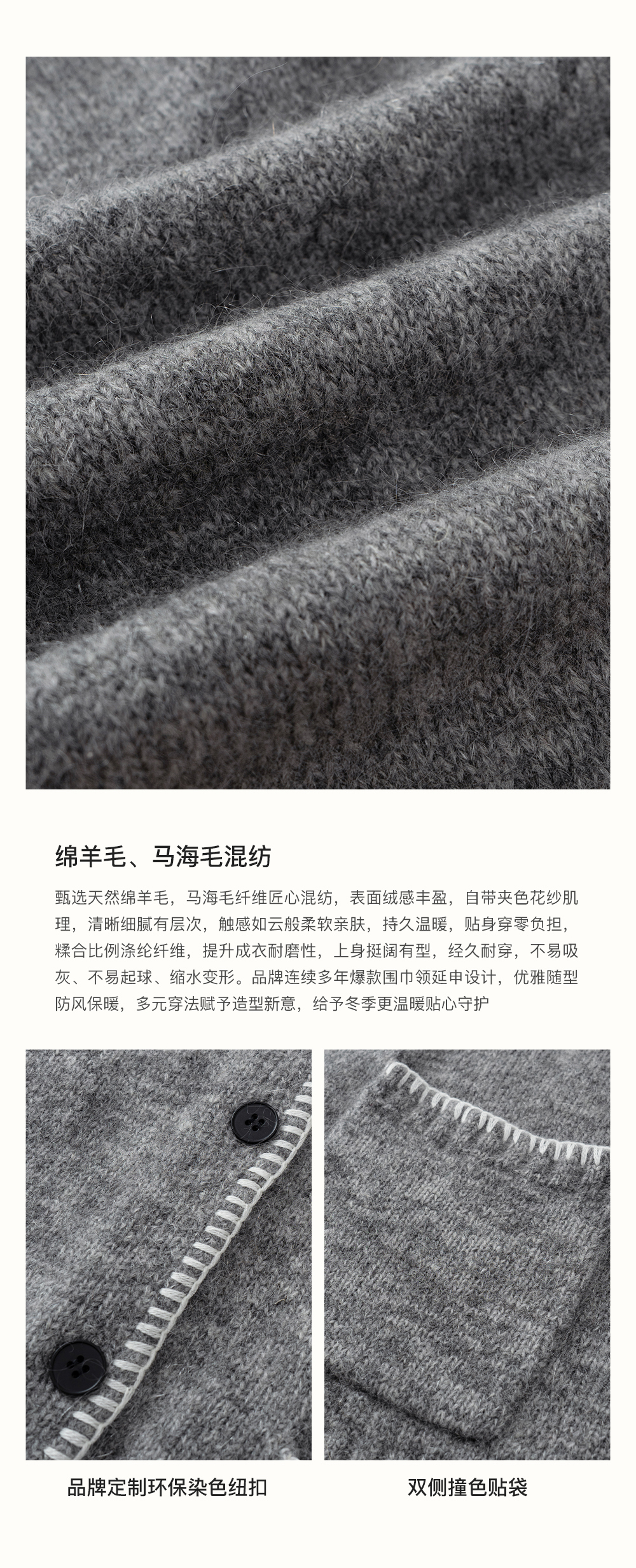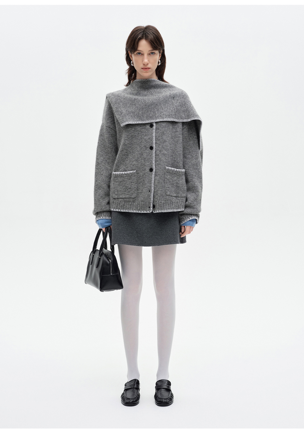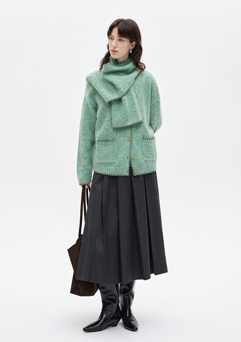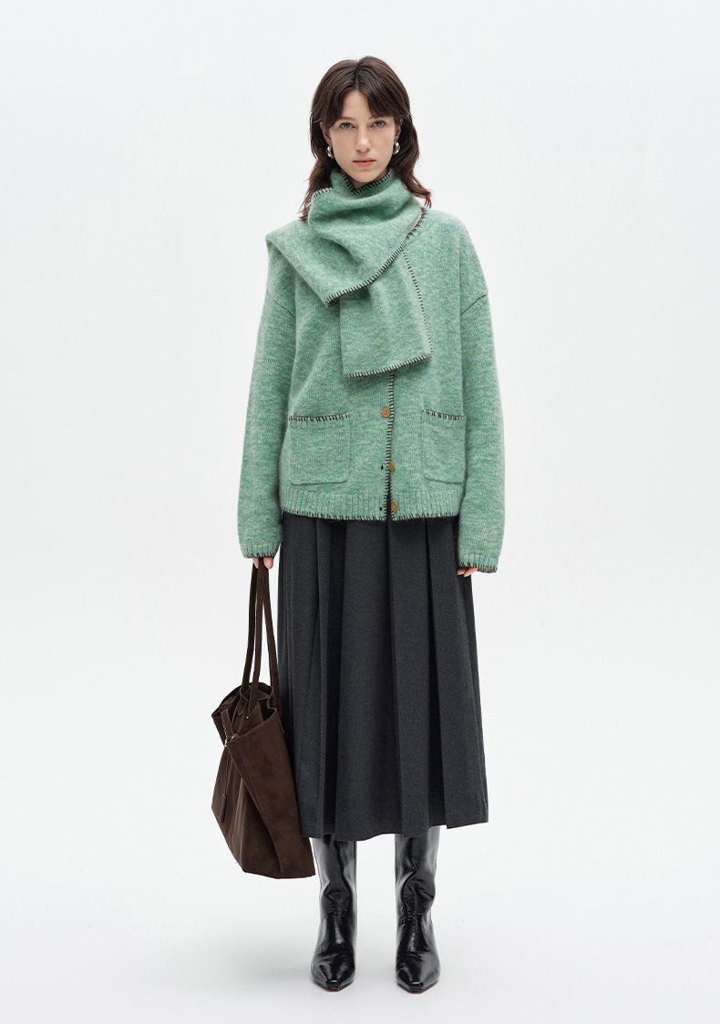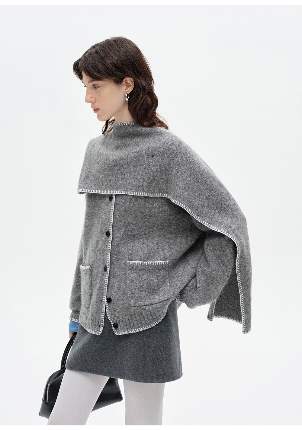 SELFWHO绵羊毛混纺撞色绣花边围巾领毛衣女2025冬季新款H型针织衫