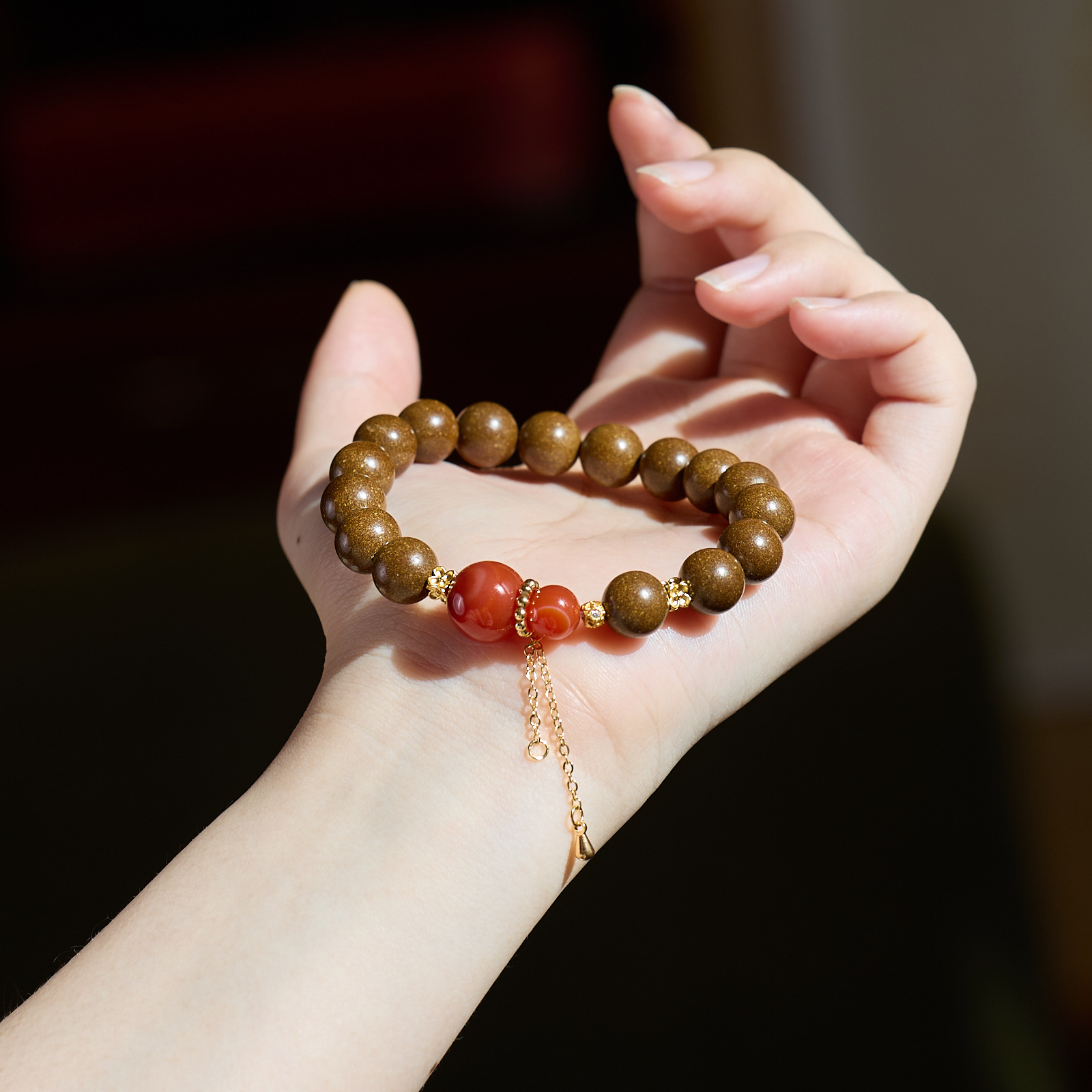 【材质】鹅梨合香珠、红玛瑙、铜镀金配件