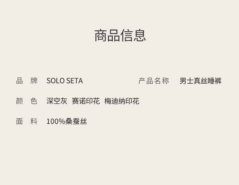 - soloseta专注于真丝织物,灵感源自意大利语,中文含义为“只做真丝”的意思。让睡衣变时尚,居家和外出瞬间切换,使其更具有出街,度假,参加宴会等功能。